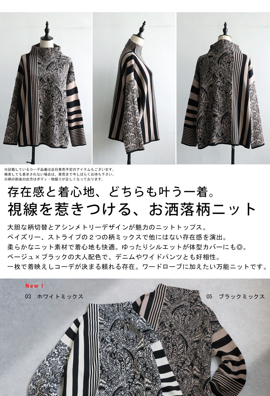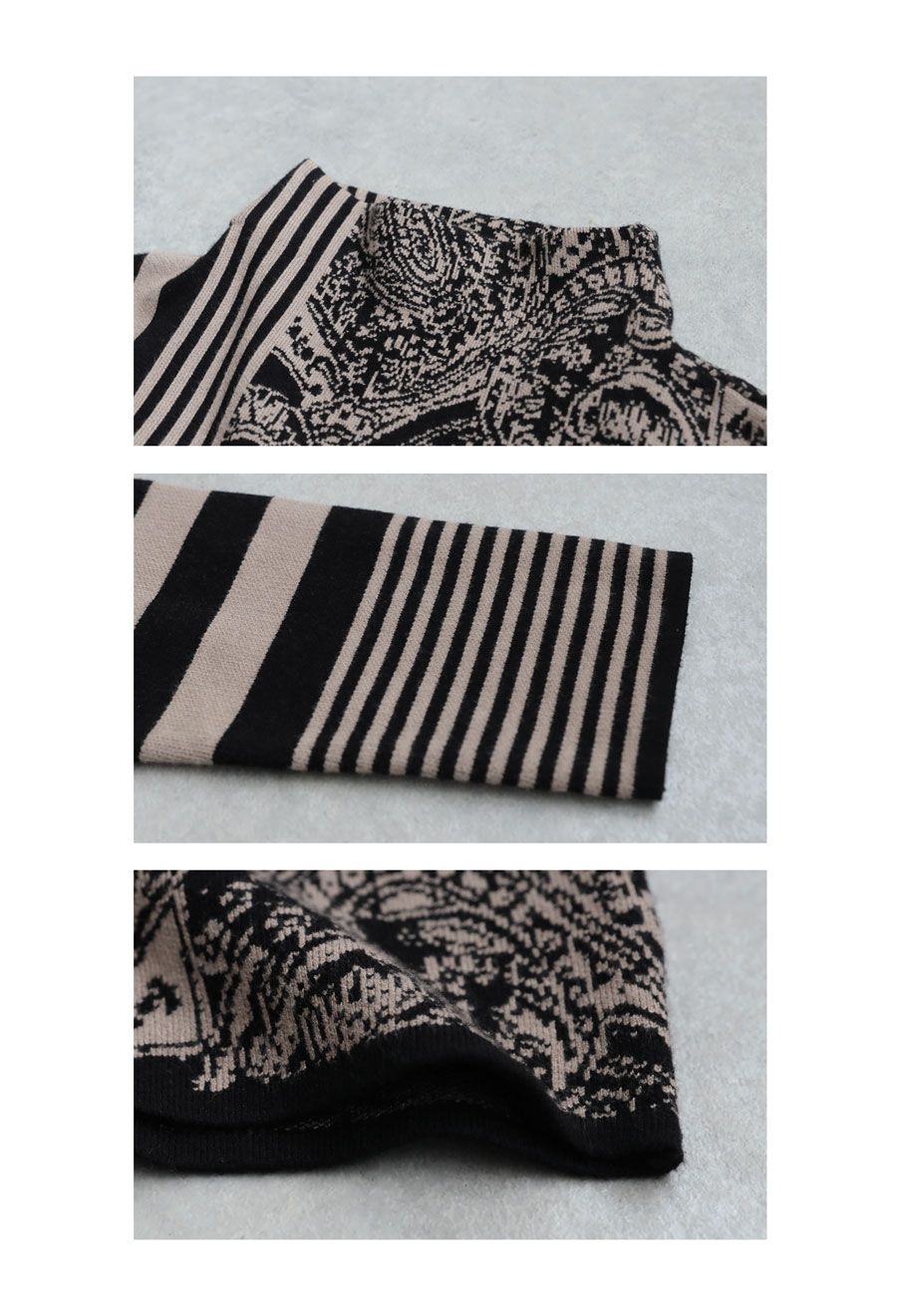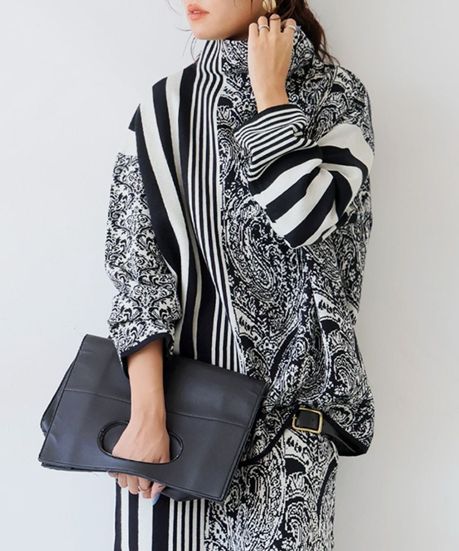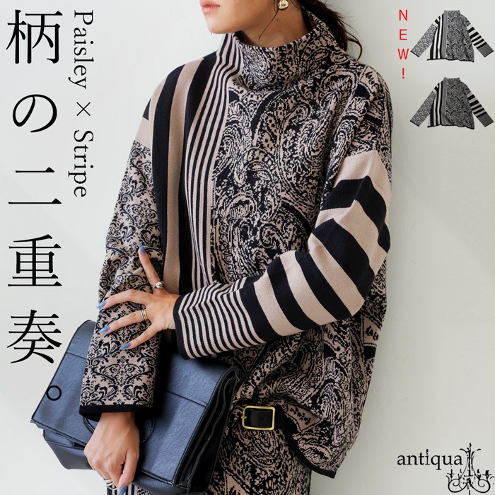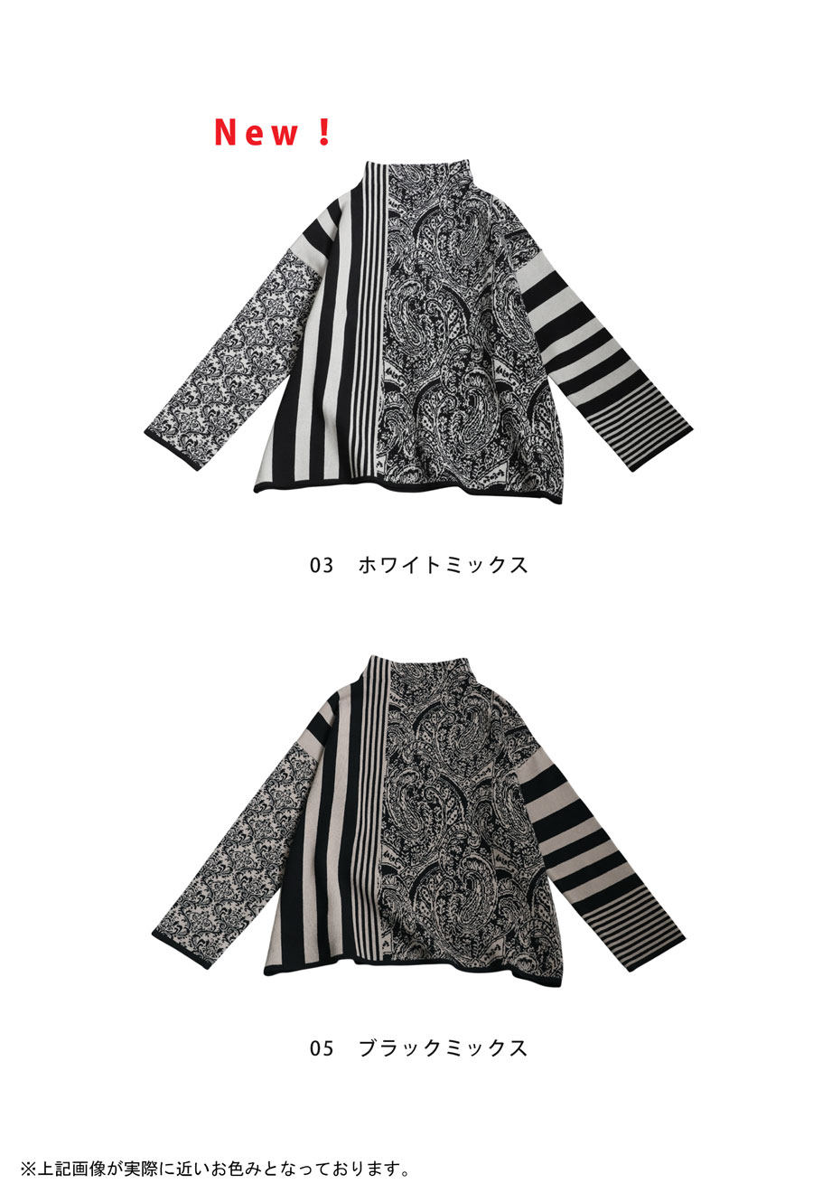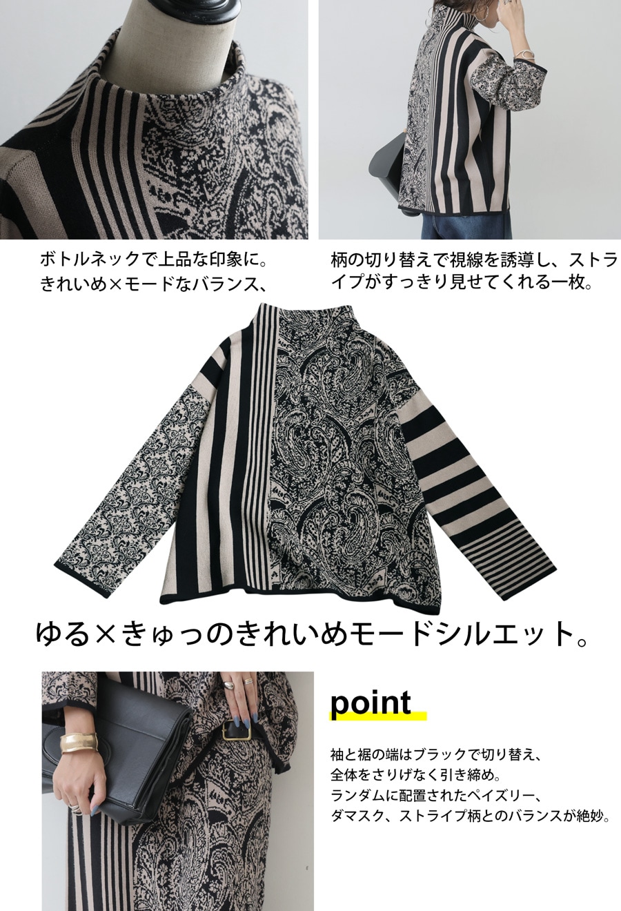 視線を惹きつける柄ミックスデザインが印象的な、大人のための柄ニットトップス。