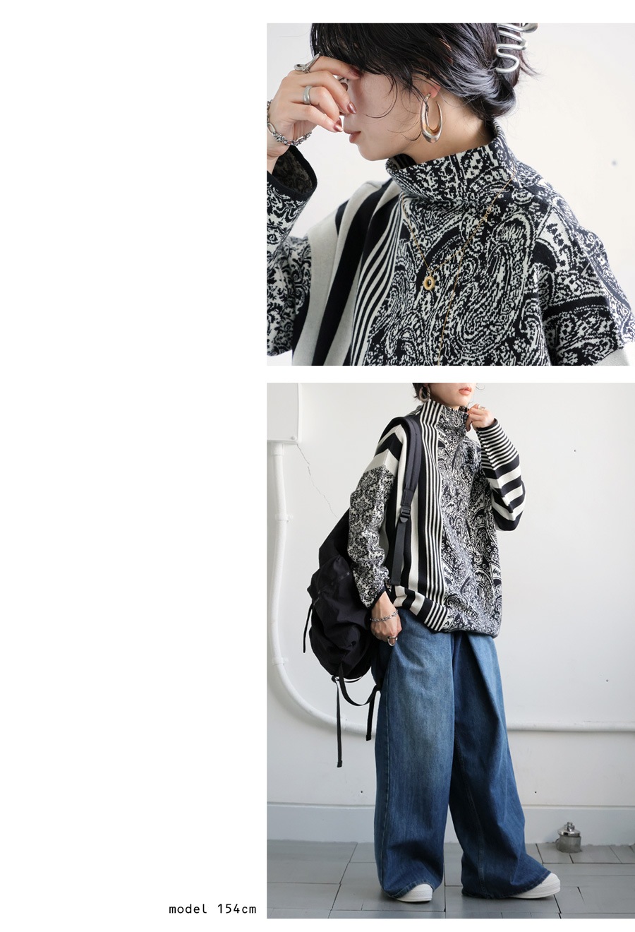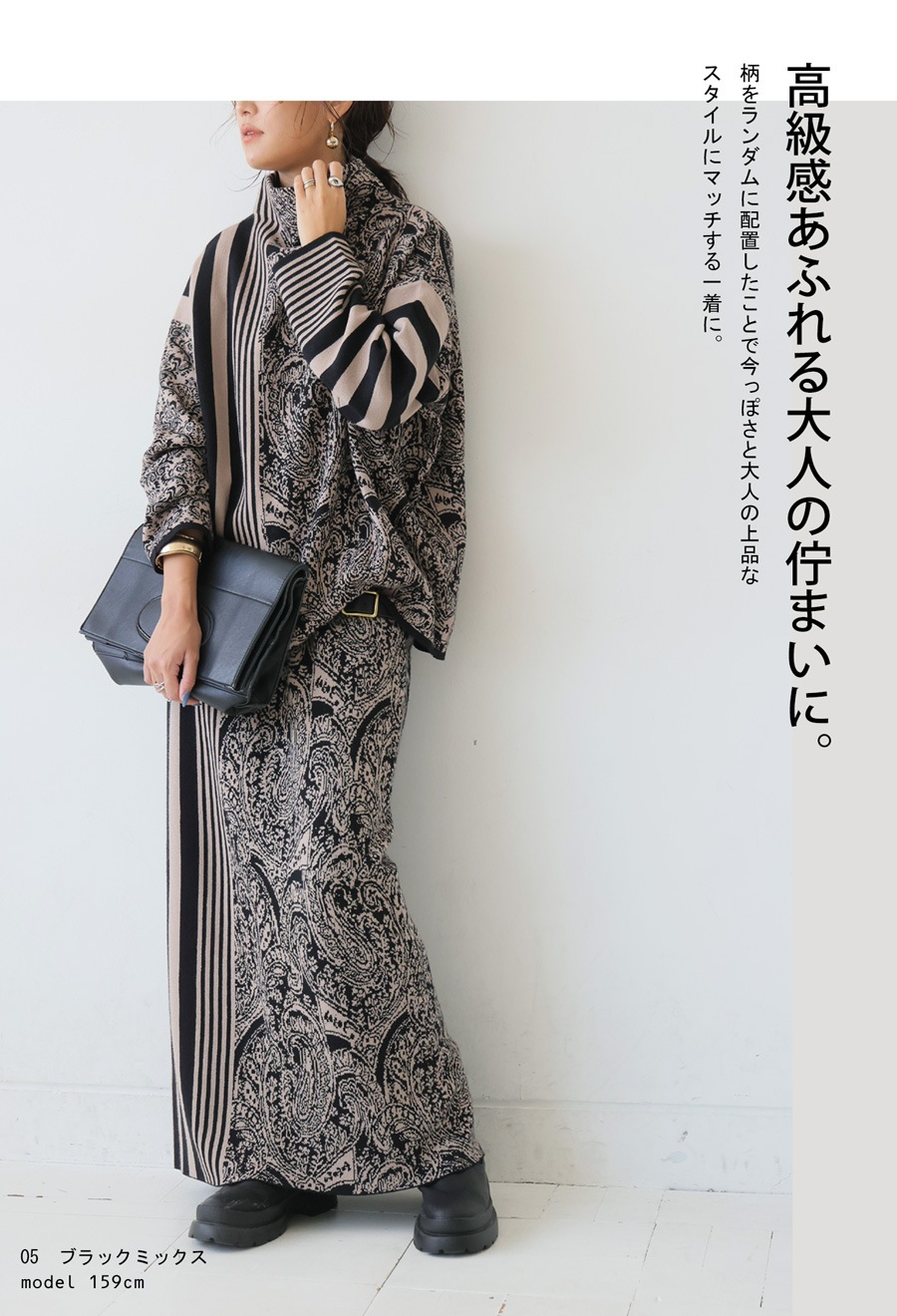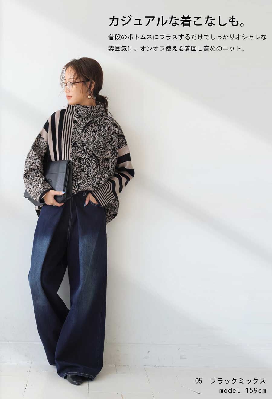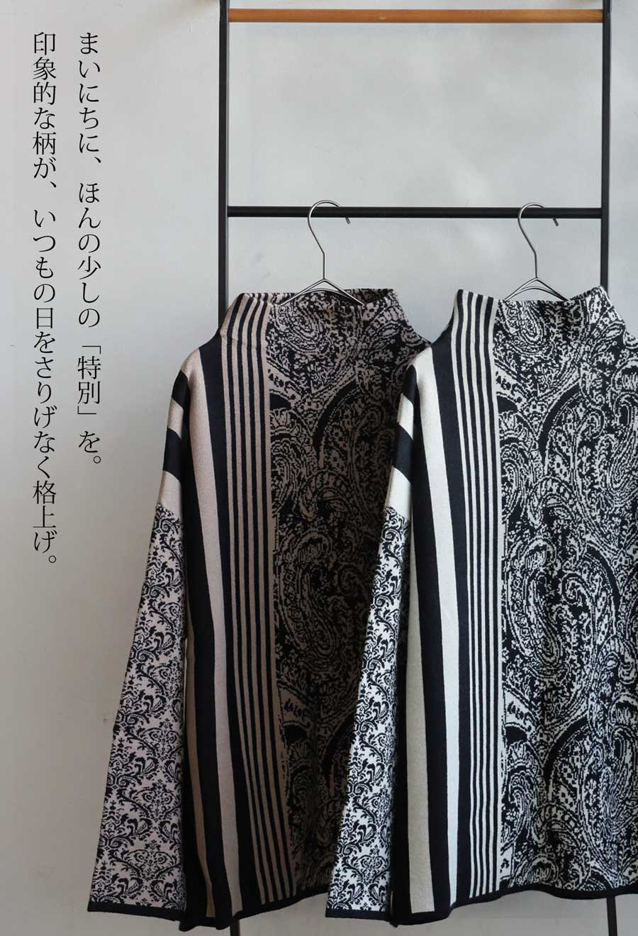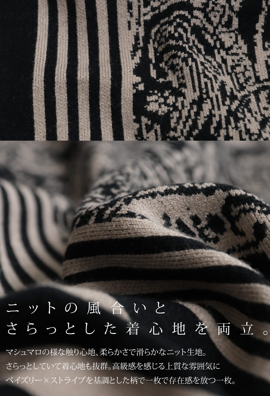 視線を惹きつける柄ミックスデザインが印象的な、大人のための柄ニットトップス。