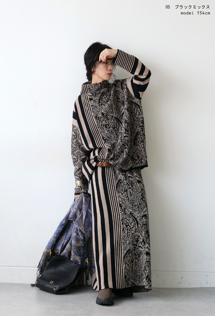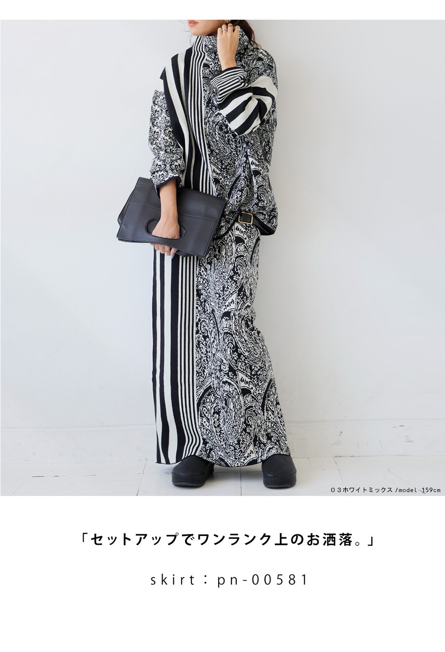 同素材の柄ニットスカート(品番:PN-00581)と合わせれば、セットアップとしても着用可能で
