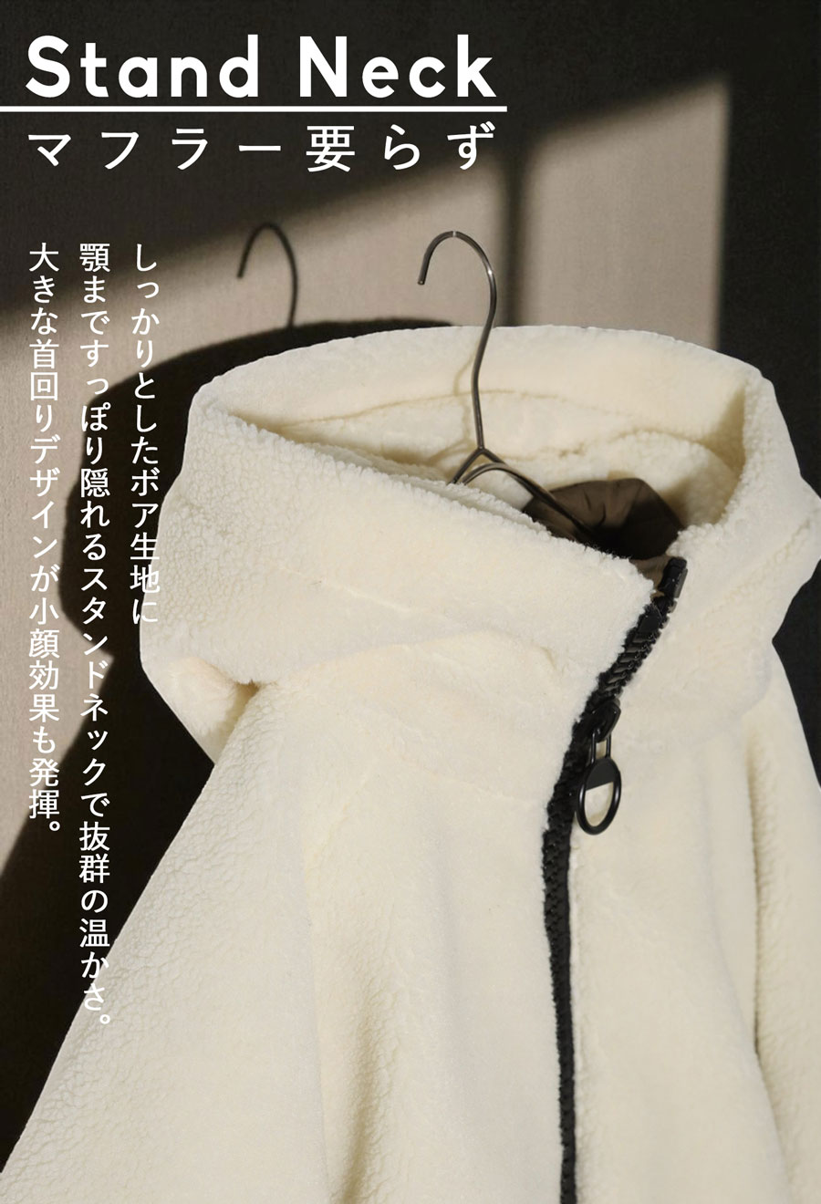 スタンドネック仕様で首元まですっぽり包み込み、マフラー要らずの快適な暖かさを確保。