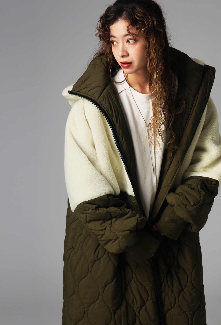 目を引くビッグファスナーと上下開閉可能なダブルジップが印象的で、コーディネートのアクセントとしても活躍する存在感のある一枚です。