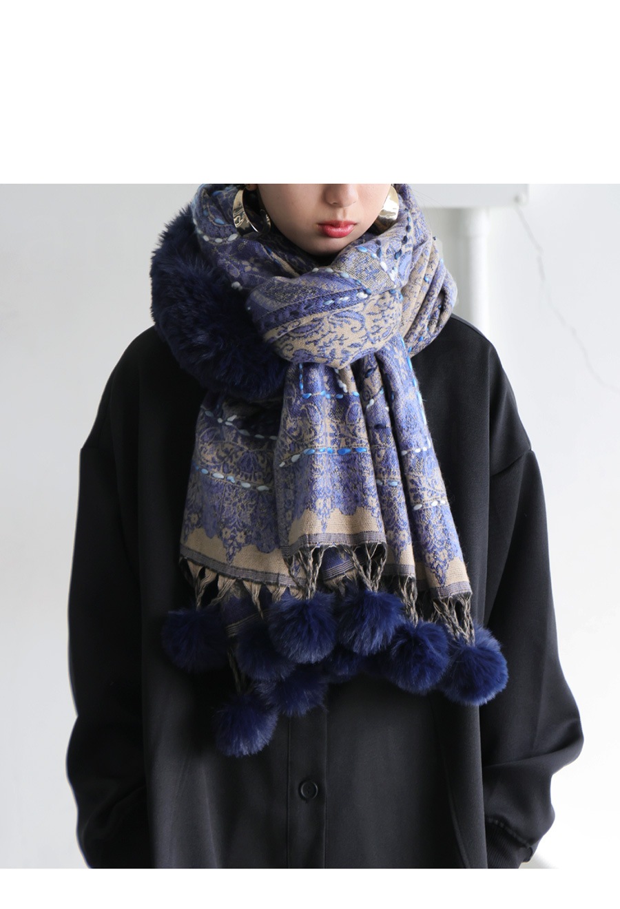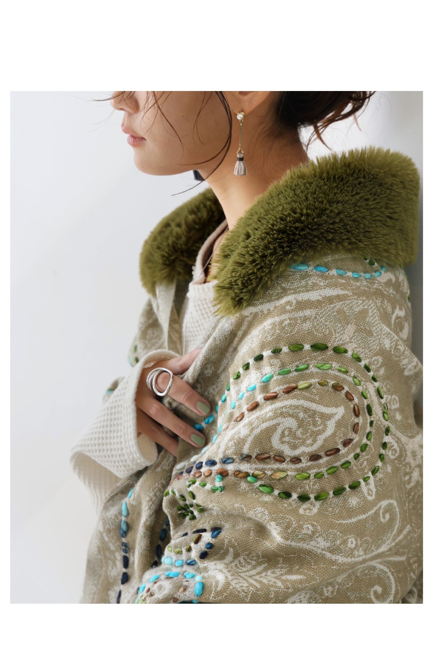 ペイズリー柄の立体織りが目を引く、ふんわりと羽織れるストールデザインのアイテムです。