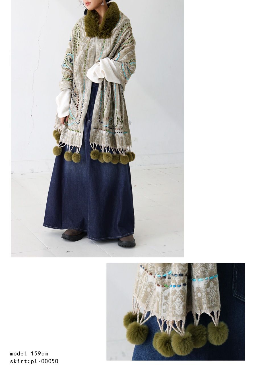 裾のポンポン付きフリンジが動きを演出し、ヒップまで隠れる丈感で体型カバーにも効果的です。
