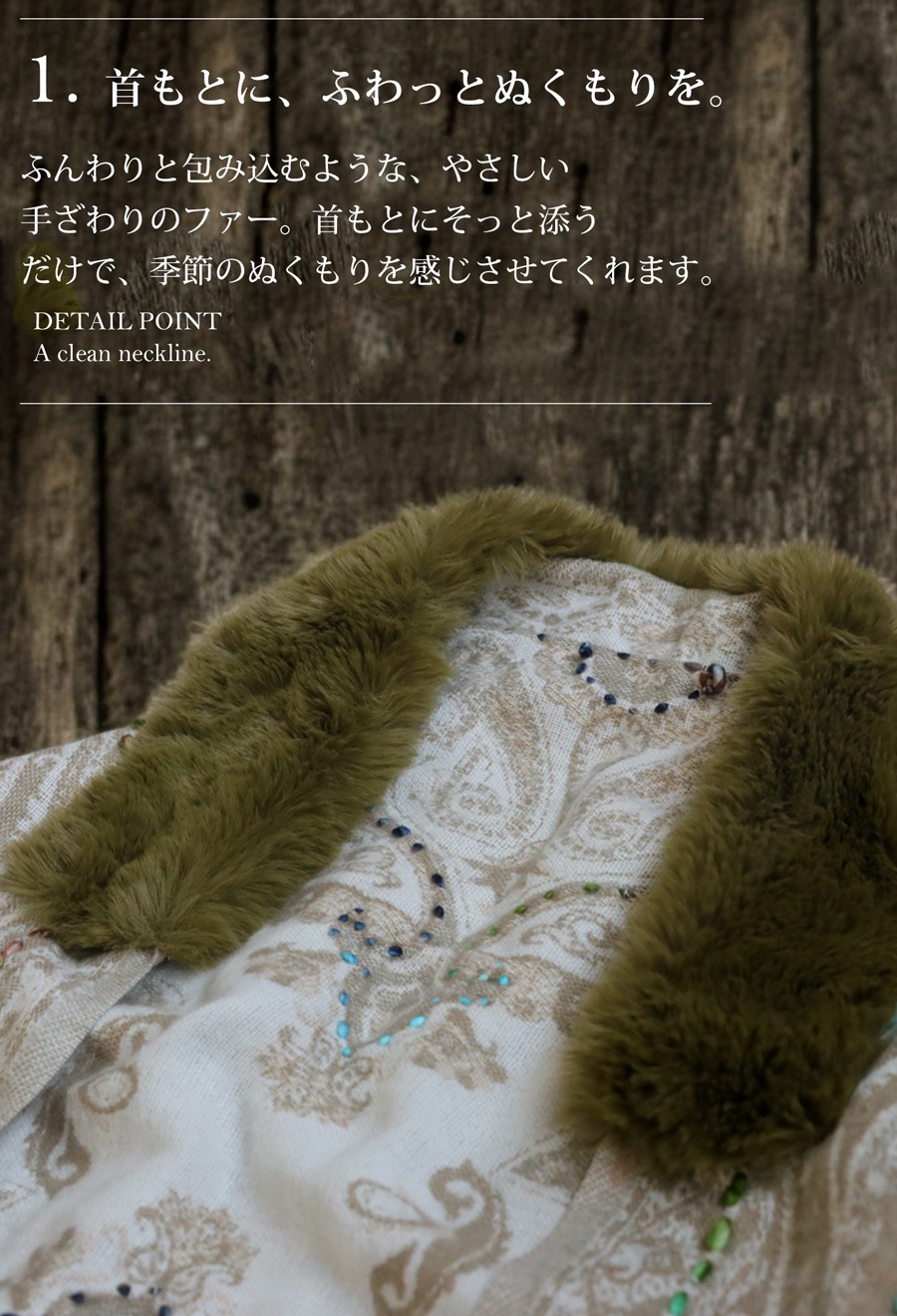 首元には上品なファーがあしらわれ、華やかさと暖かさをプラス。