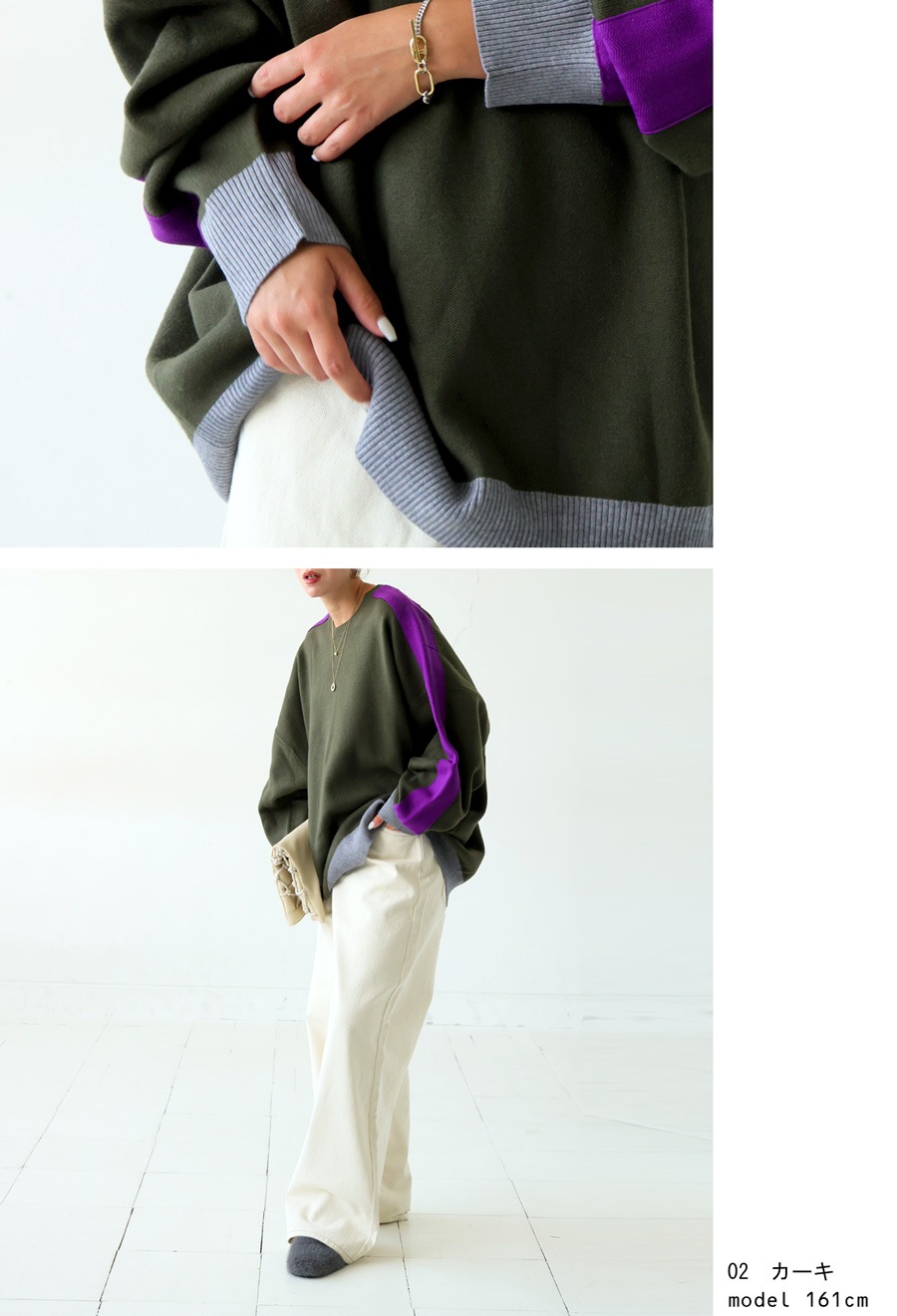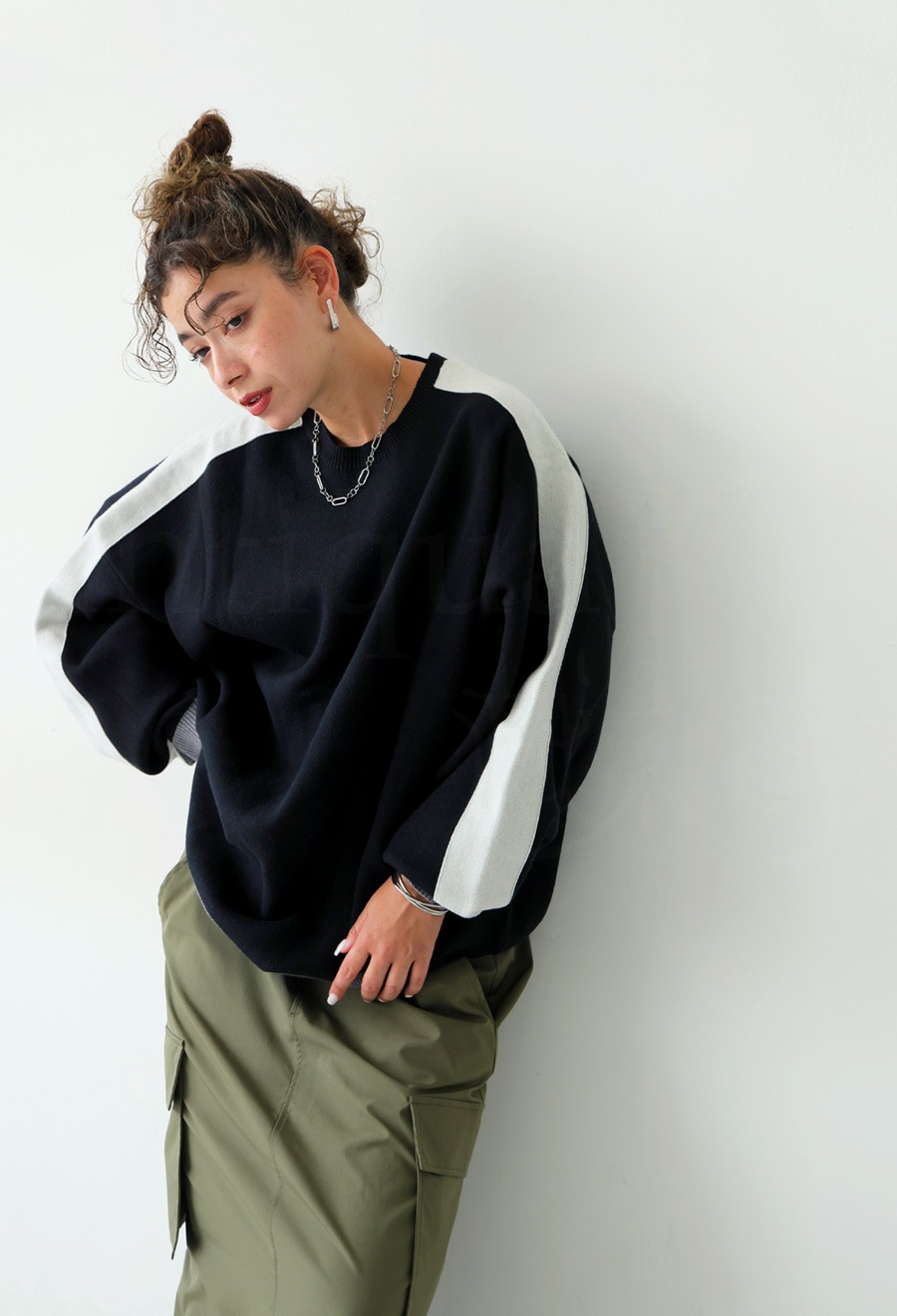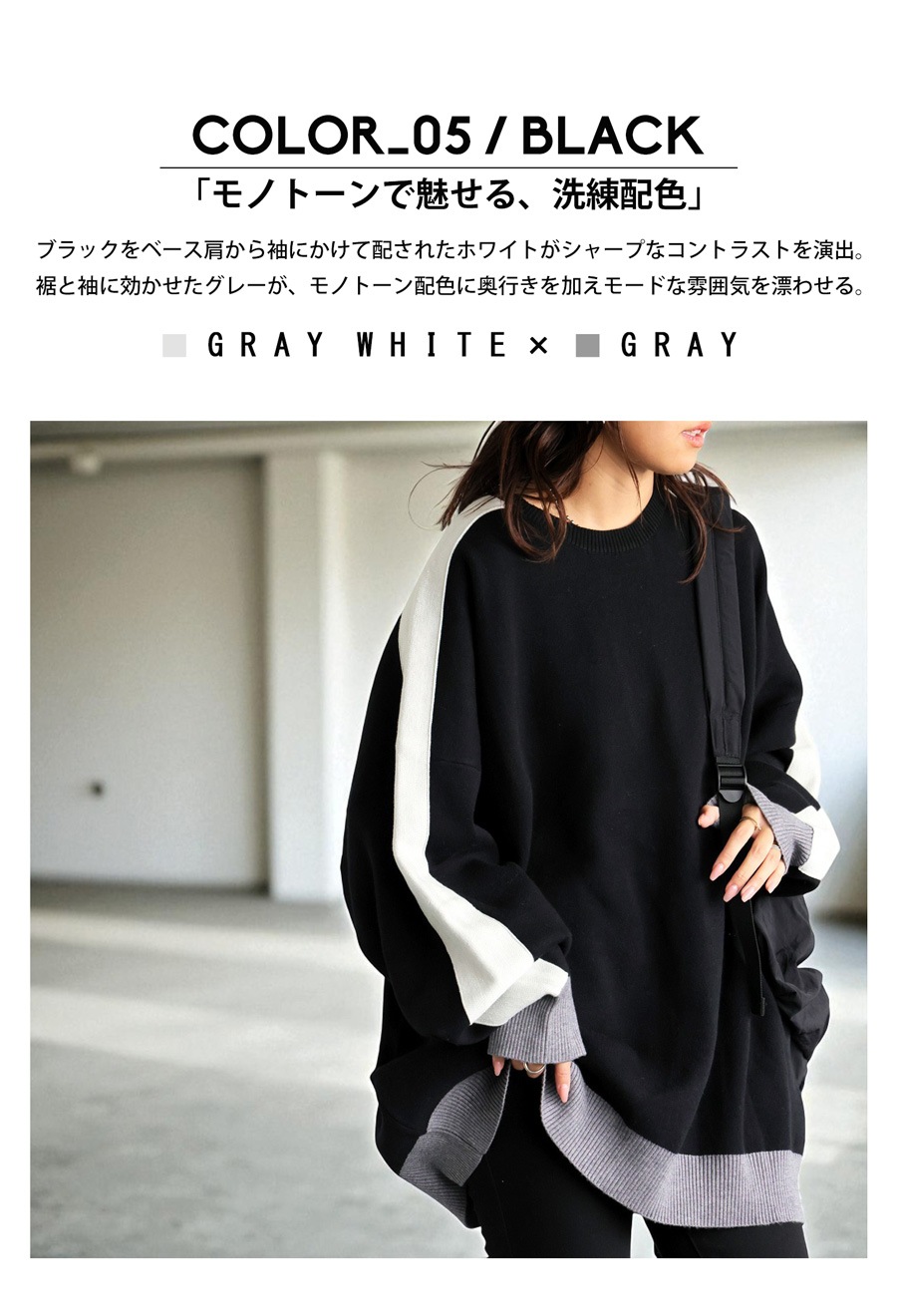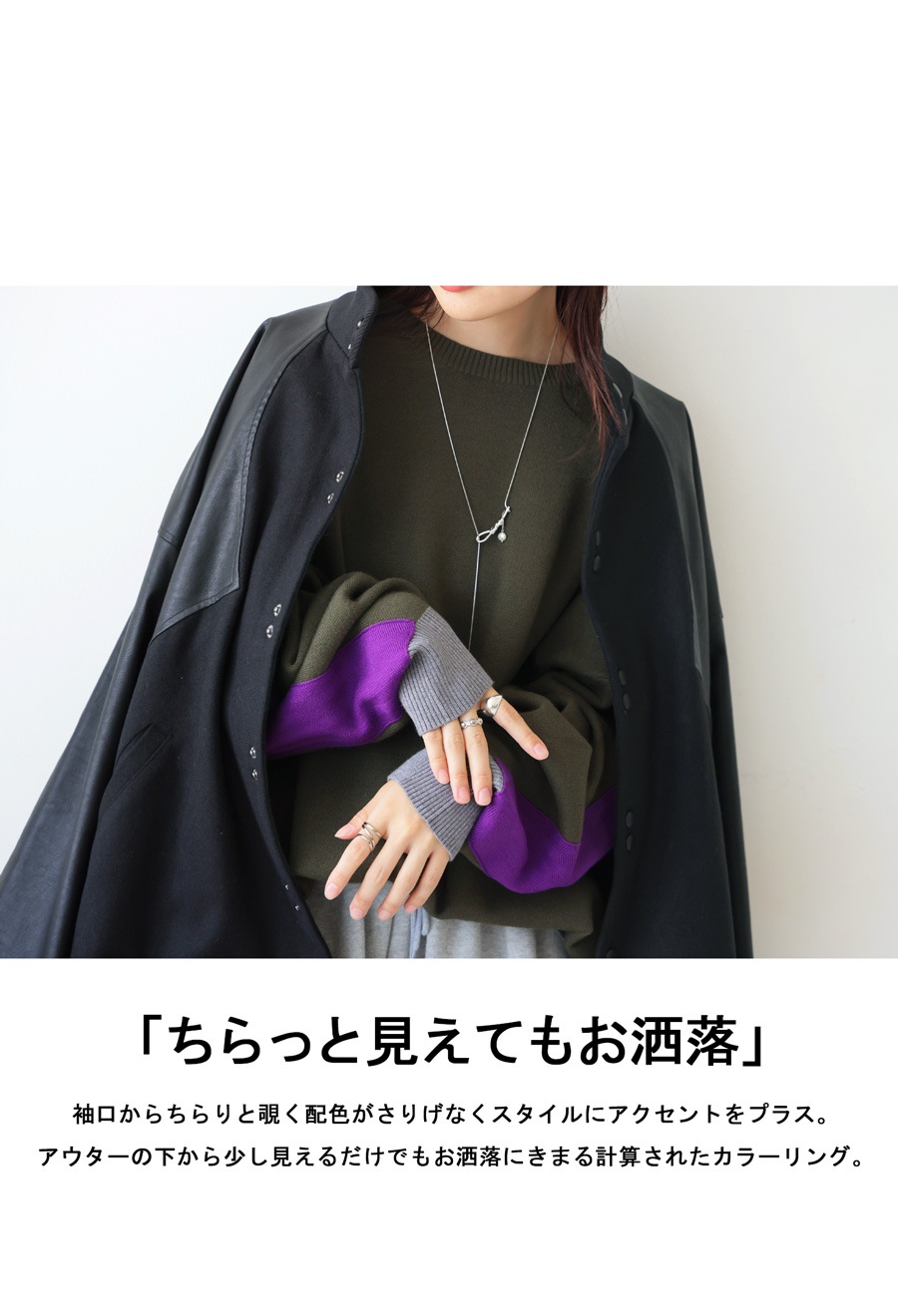 配色の切り替えがスタイリングに遊び心をプラスし、シンプルながらも映える一枚に。