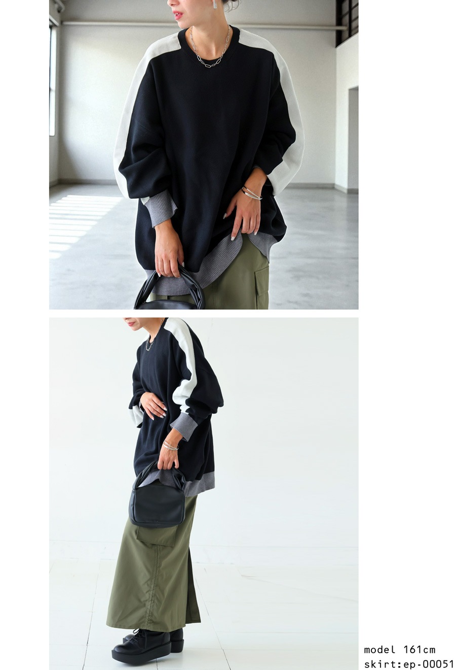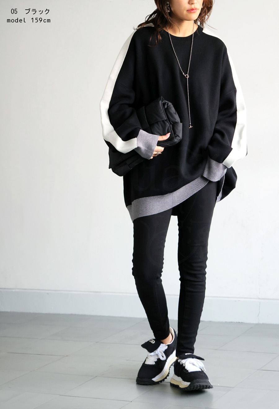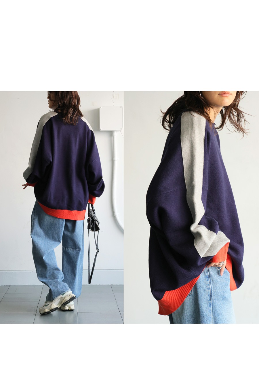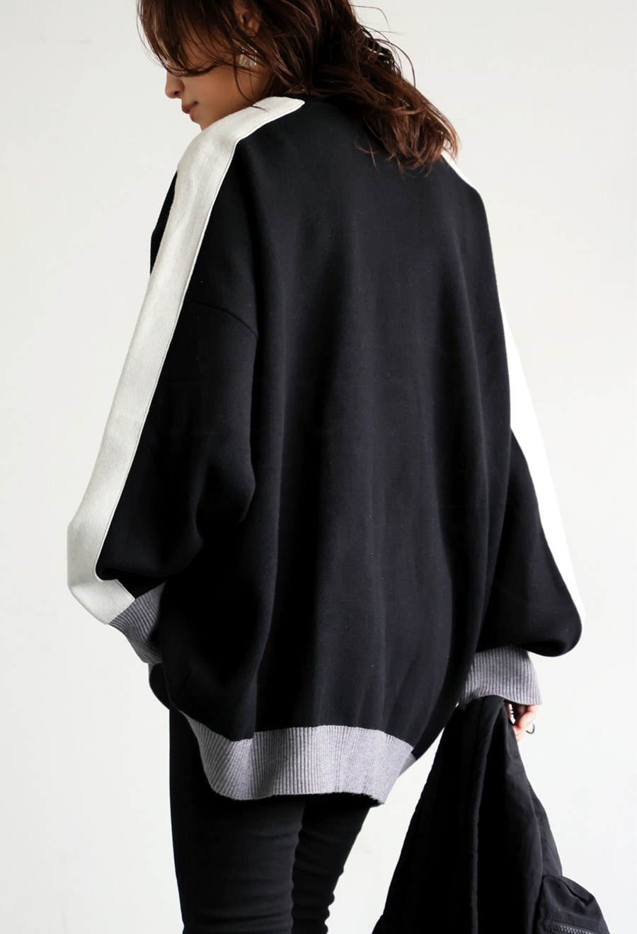 配色の切り替えがスタイリングに遊び心をプラスし、シンプルながらも映える一枚に。