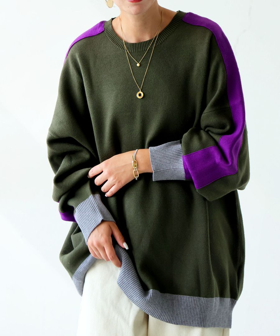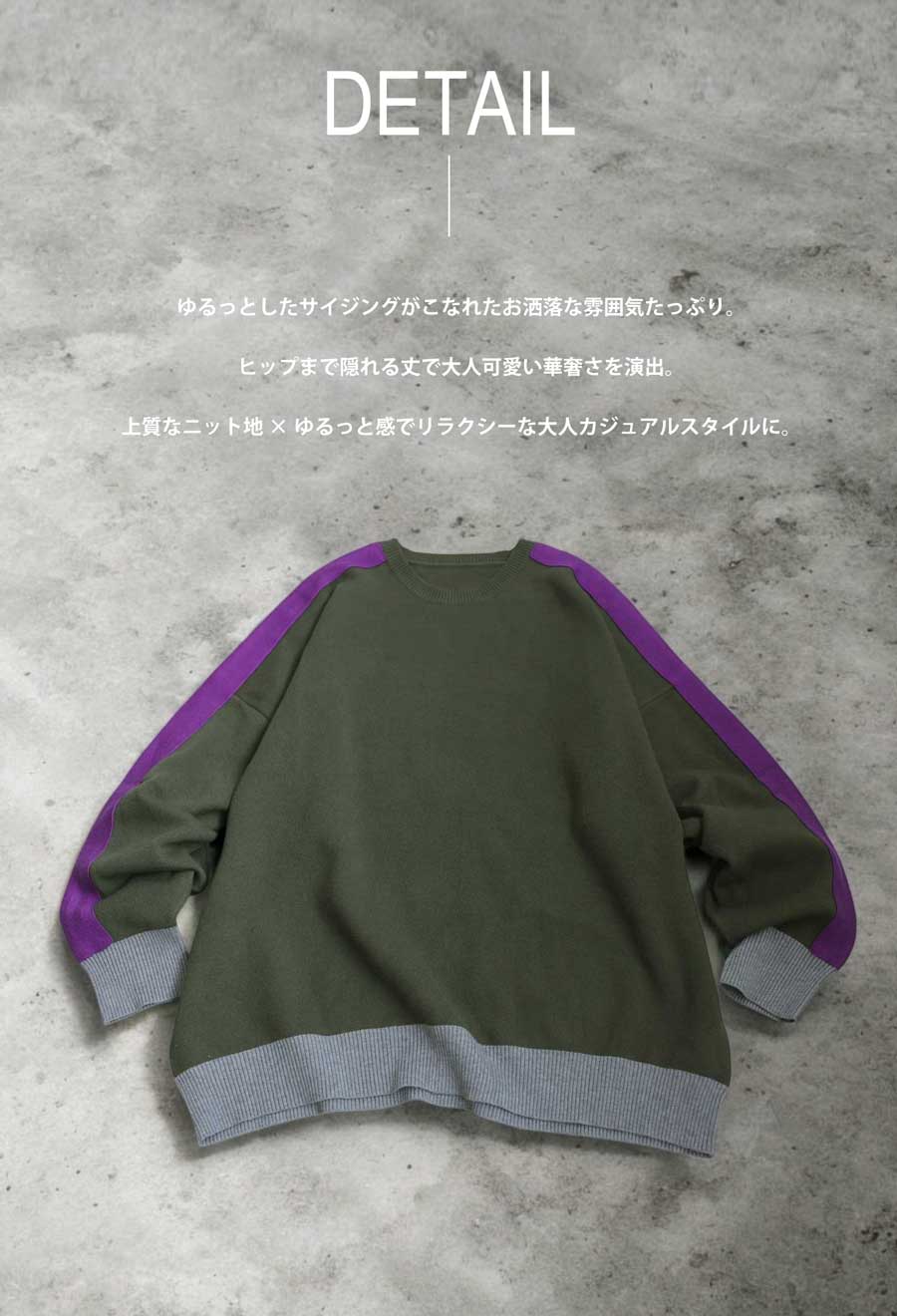 肩から袖にかけて配された配色ラインがアクセントになる、存在感あるリブニットトップスです。