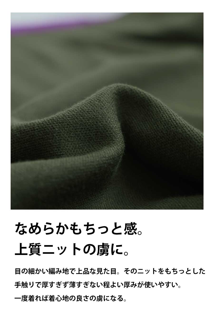 滑らかな肌触りのポリエステル混素材はチクチクしにくく、デイリー使いにぴったりの一着です。