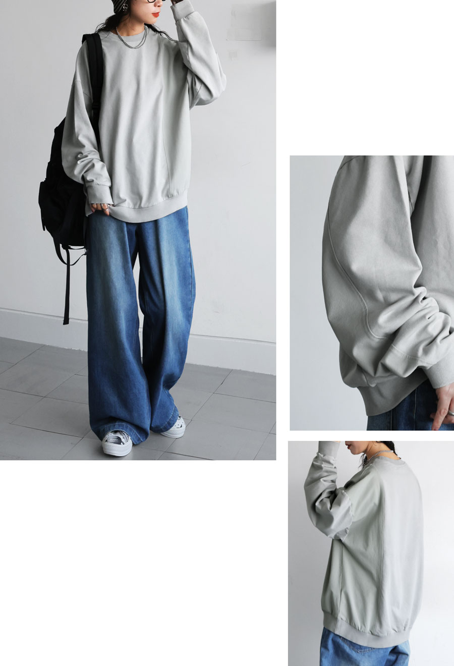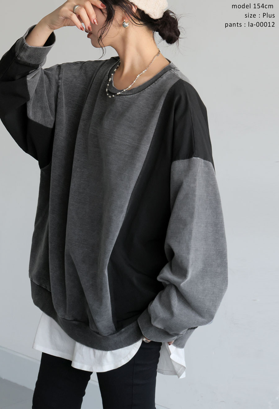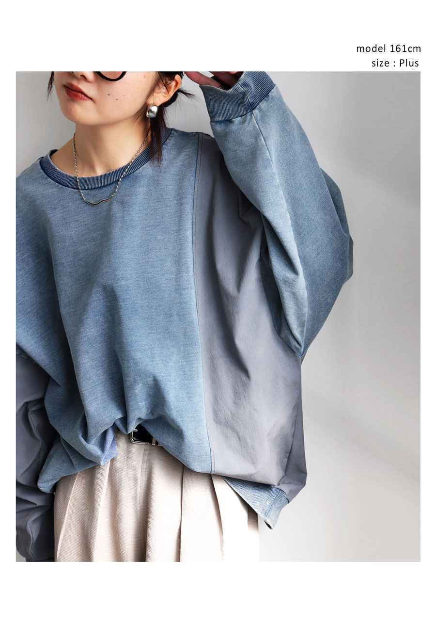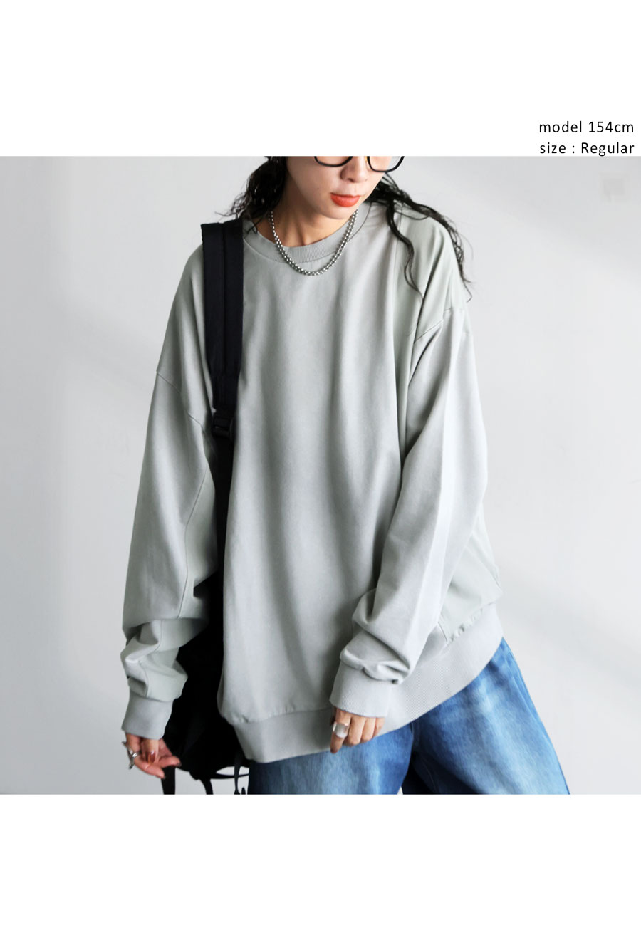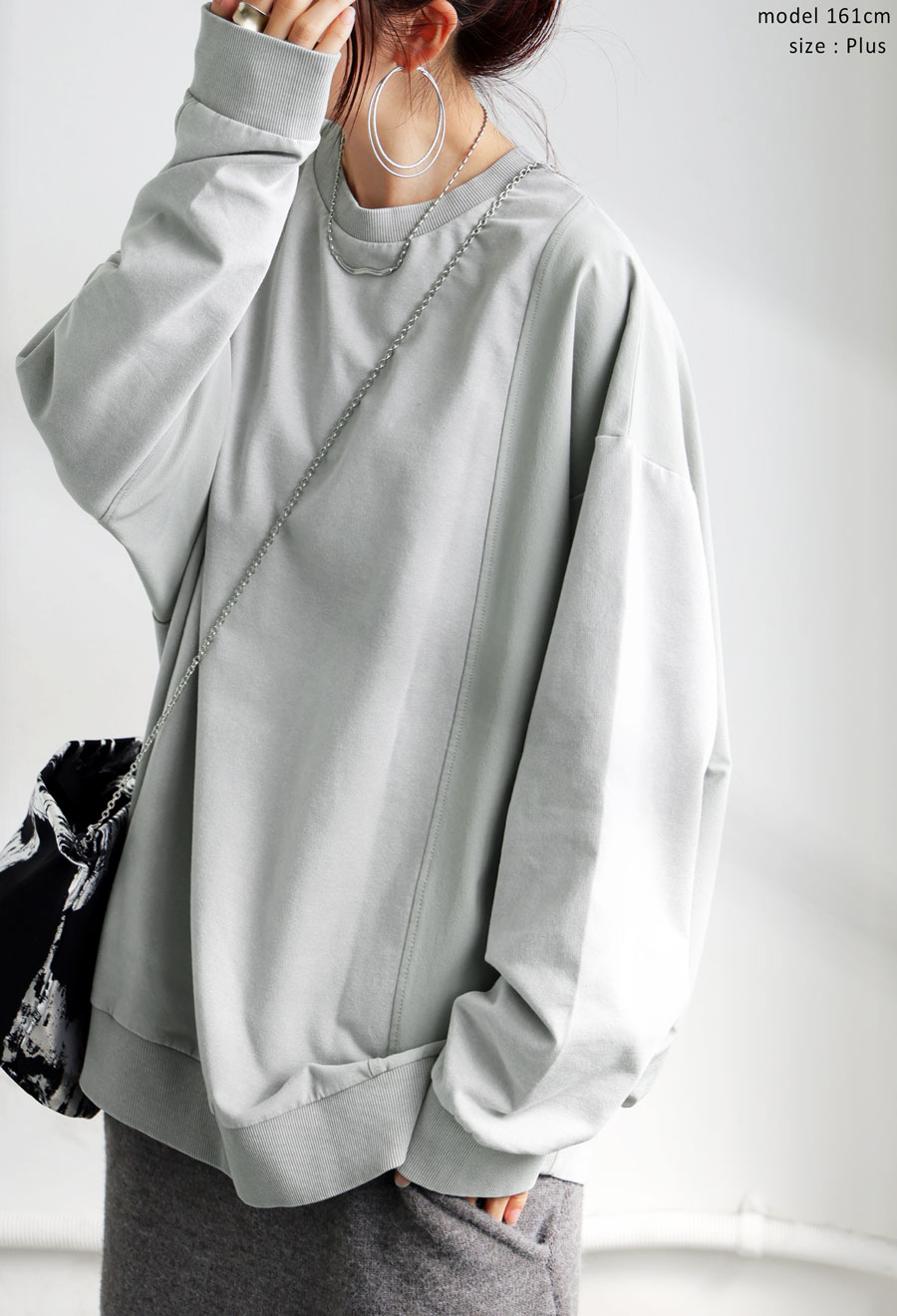 クルーネック(丸首)仕様で首元はすっきりと仕上げ、袖丈・丈感ともにゆったりめで体型カバーにも対応します。