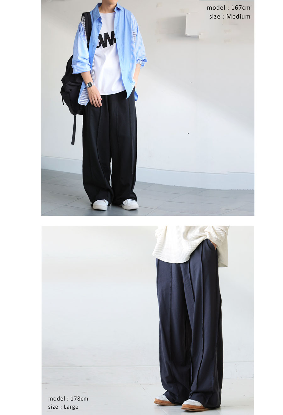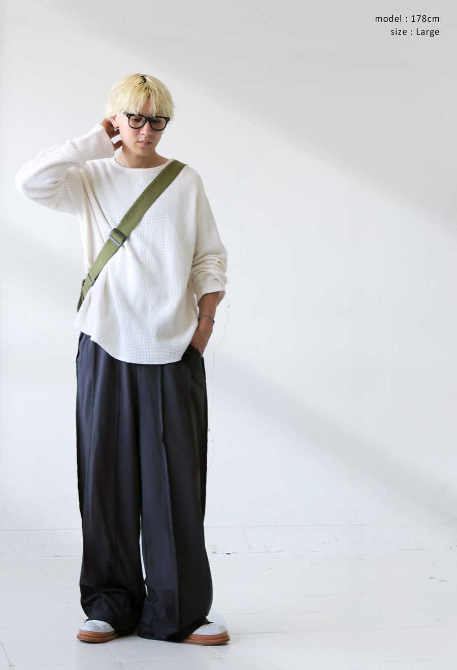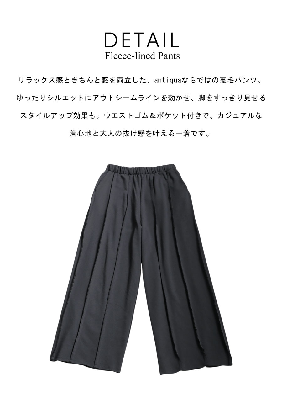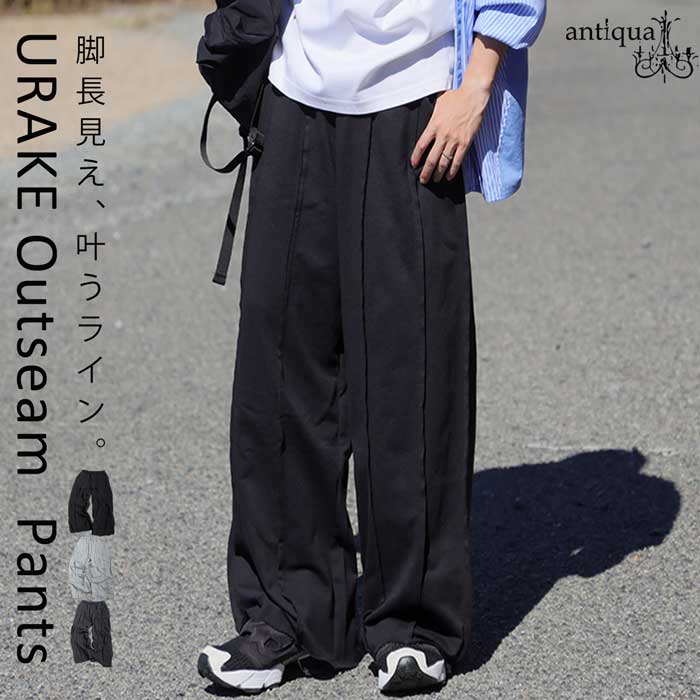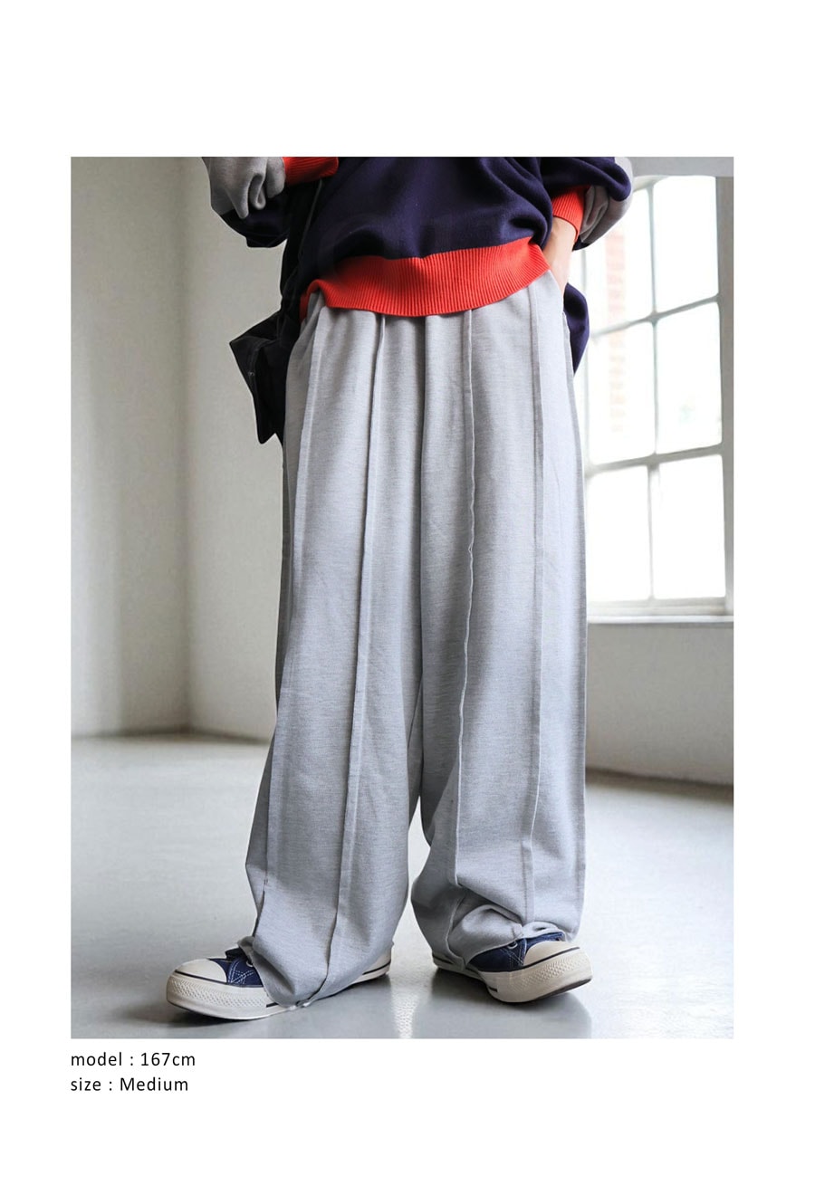 サイドに入ったアウトシームラインが縦のラインを強調し、ワイドなシルエットに自然な立体感をプラス。