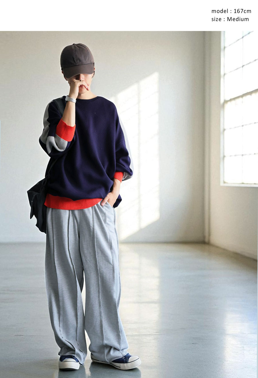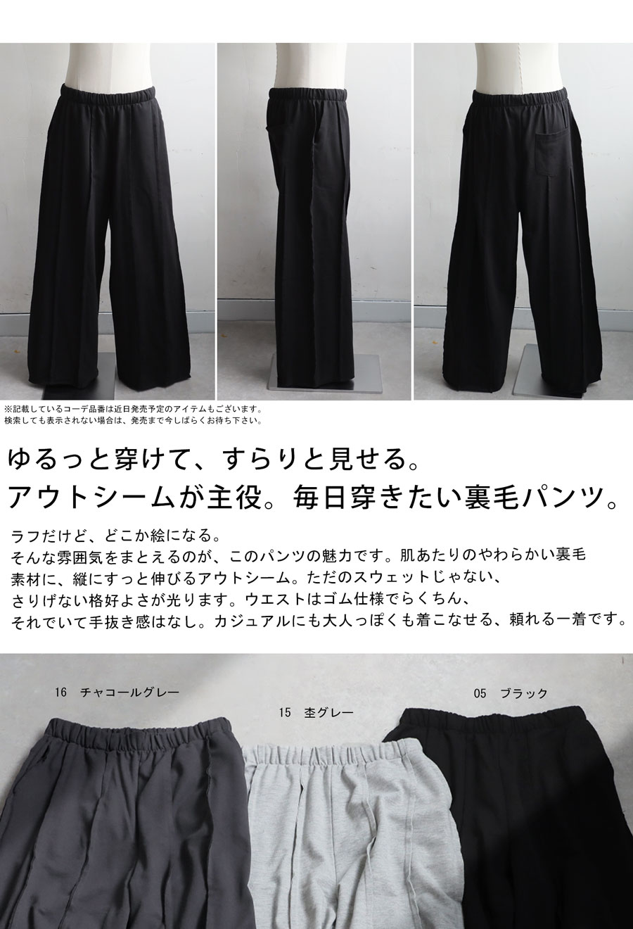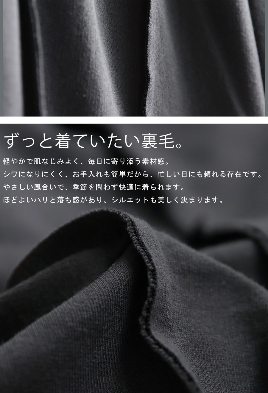裏毛素材は厚すぎず軽やかで、ルームウェアのような快適さと街穿きのバランスを兼ね備えています。