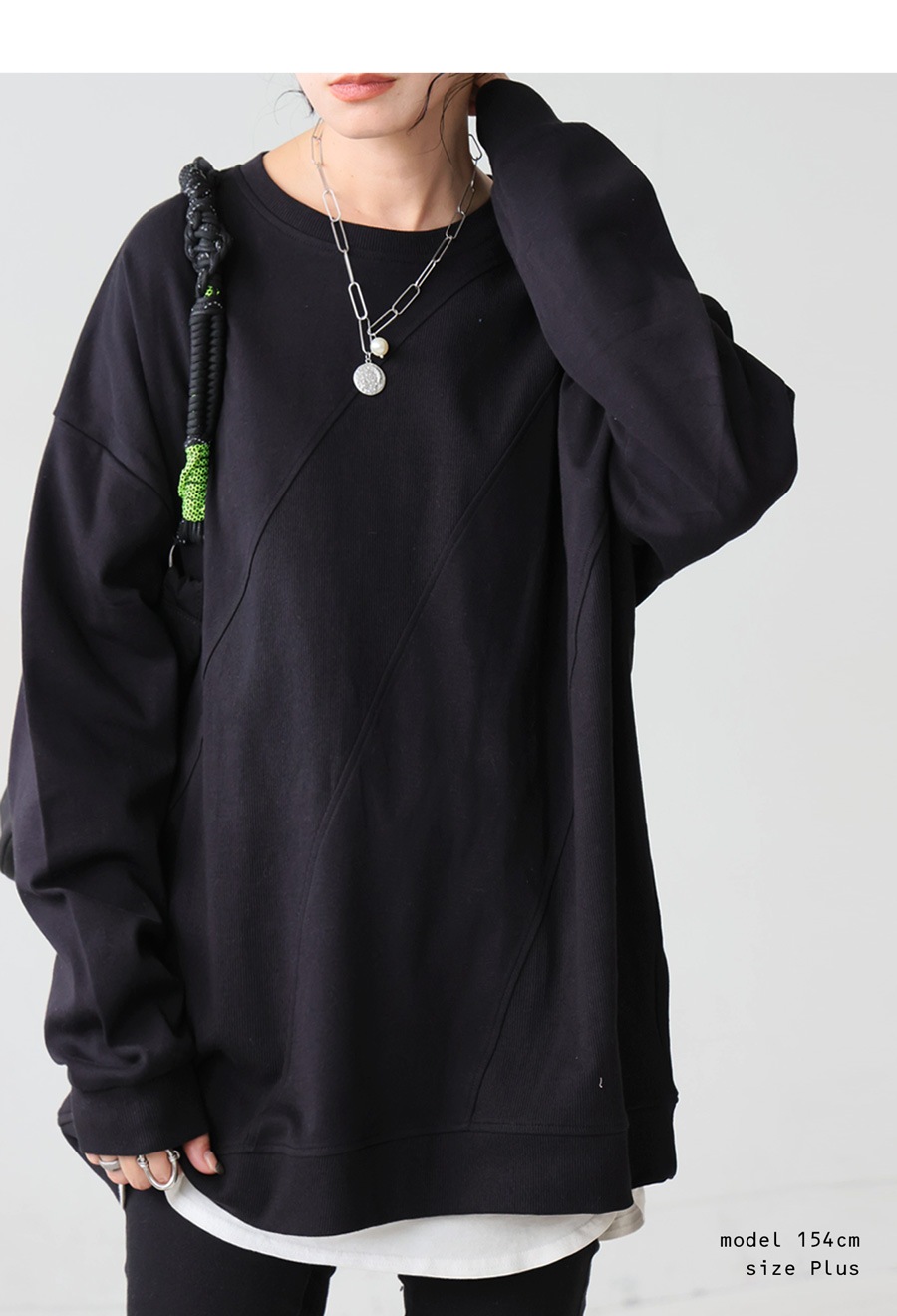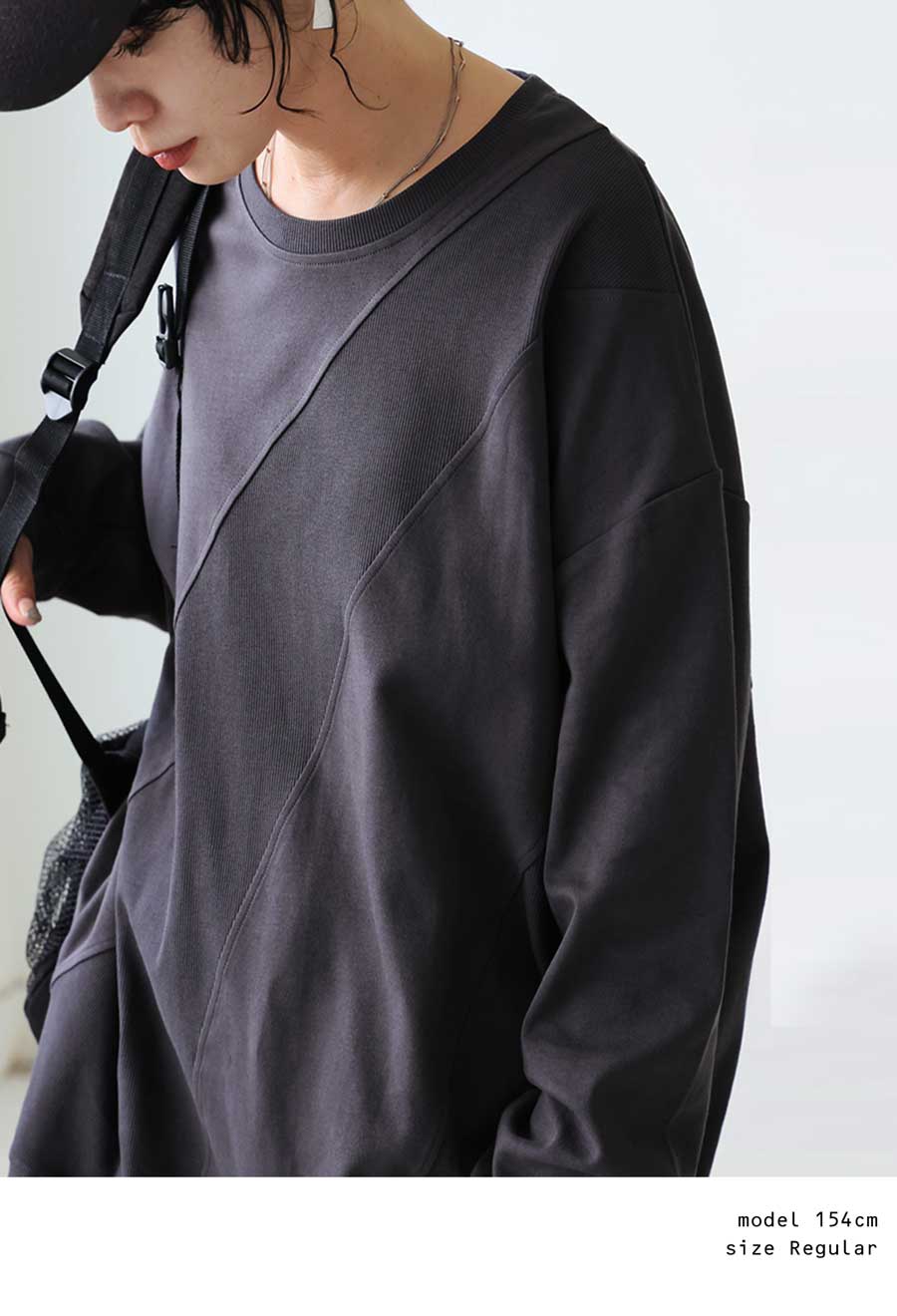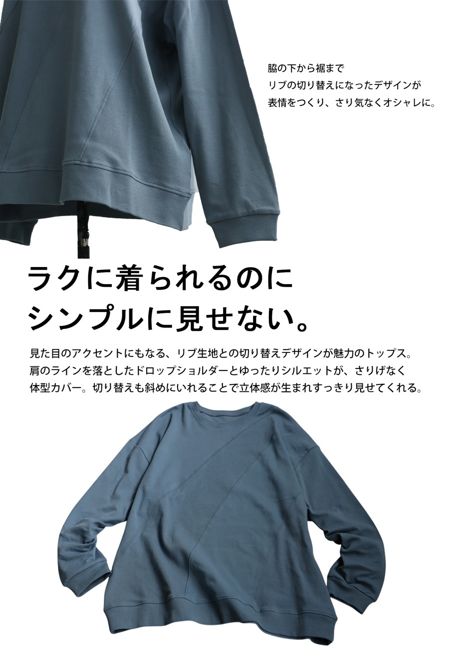 立体感を引き出す斜めリブ切替が印象的な、無地のクルーネックトップスです。
