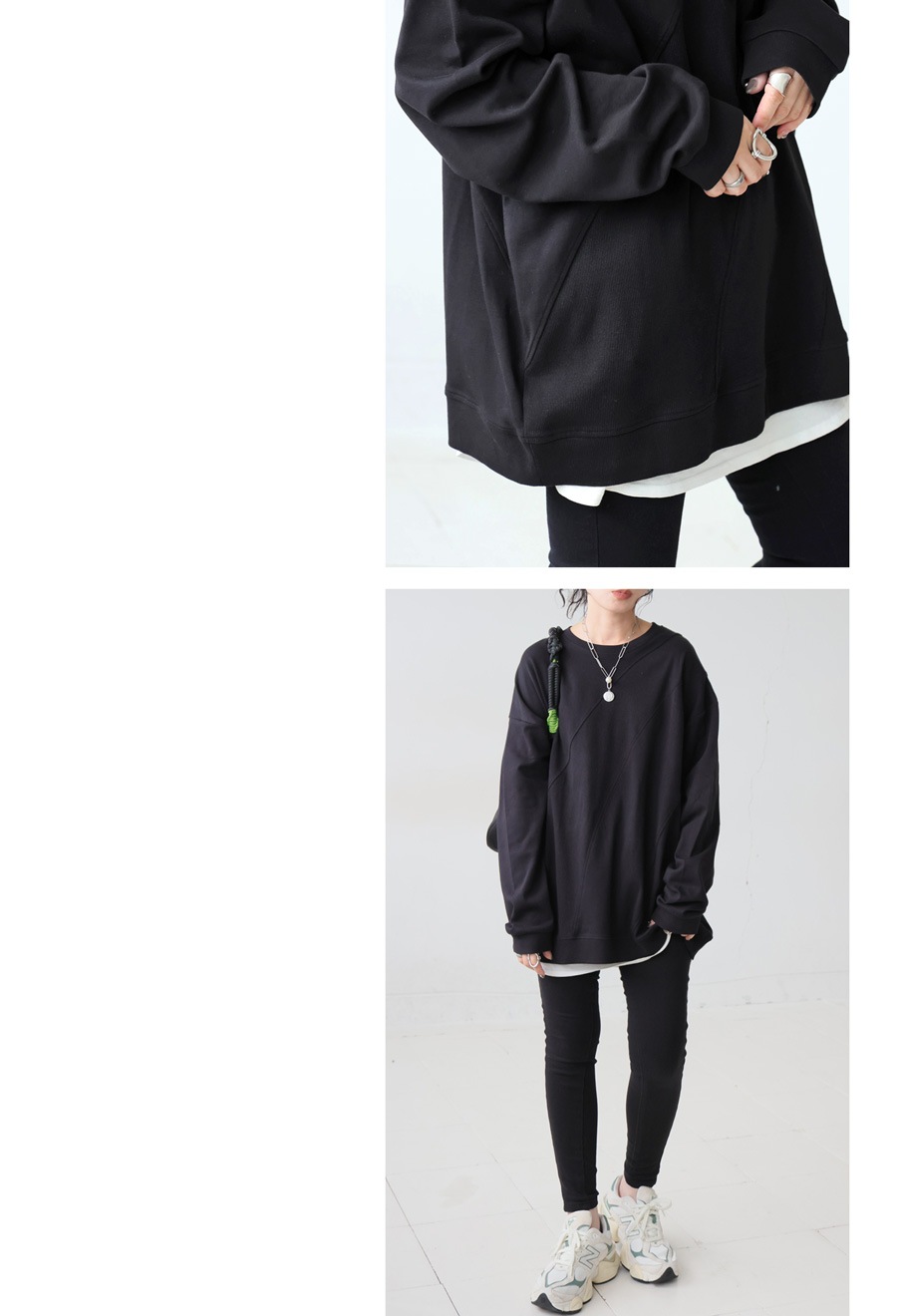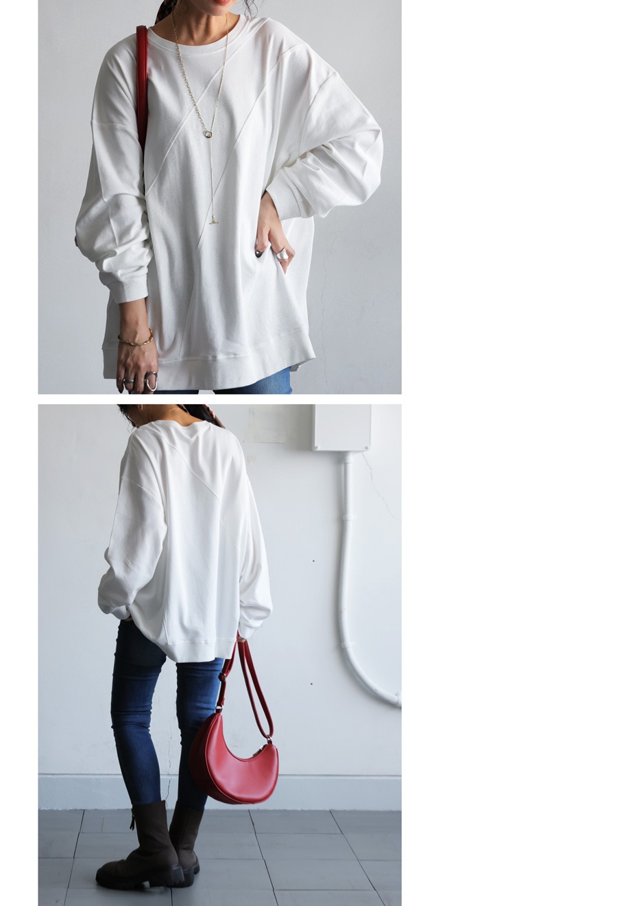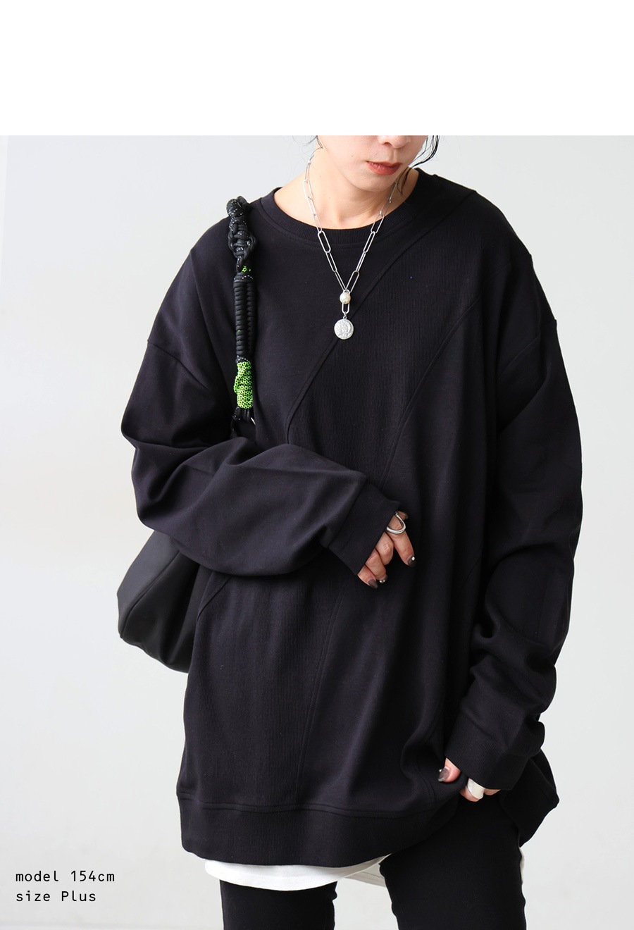 立体感を引き出す斜めリブ切替が印象的な、無地のクルーネックトップスです。
