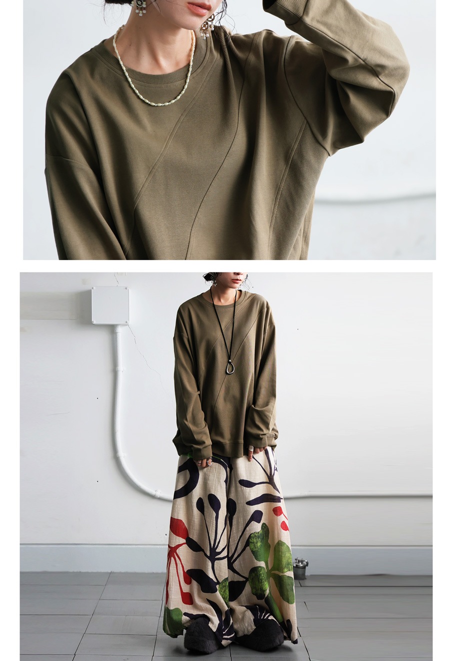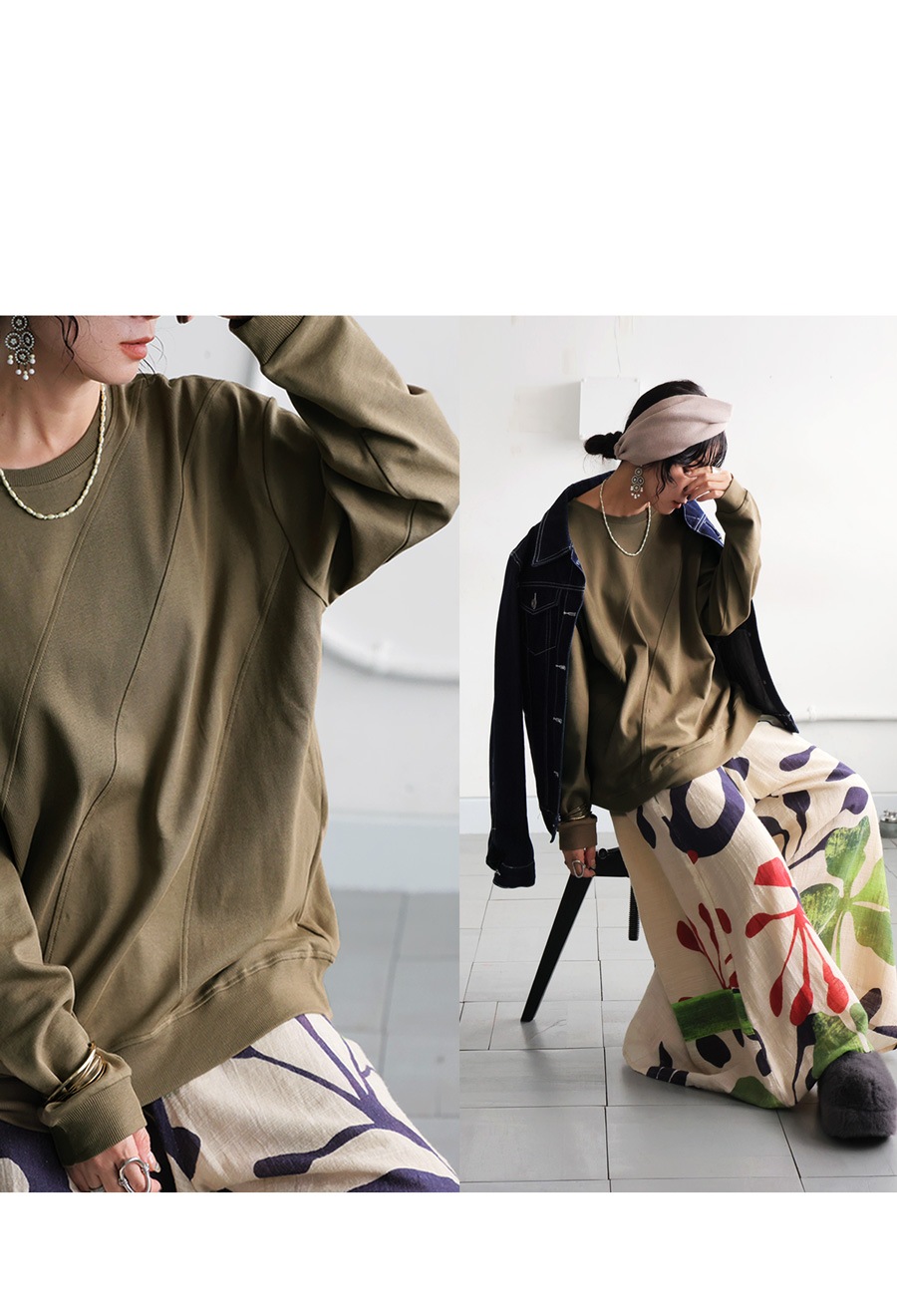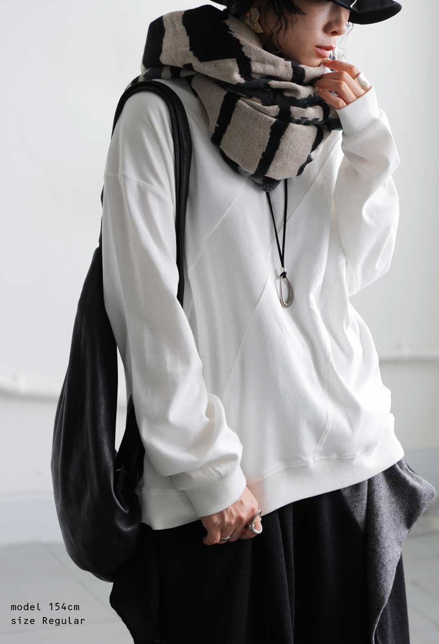 柄は無地ながら、リブの異素材切替がさりげないアクセントになり、表情豊かに魅せてくれます。