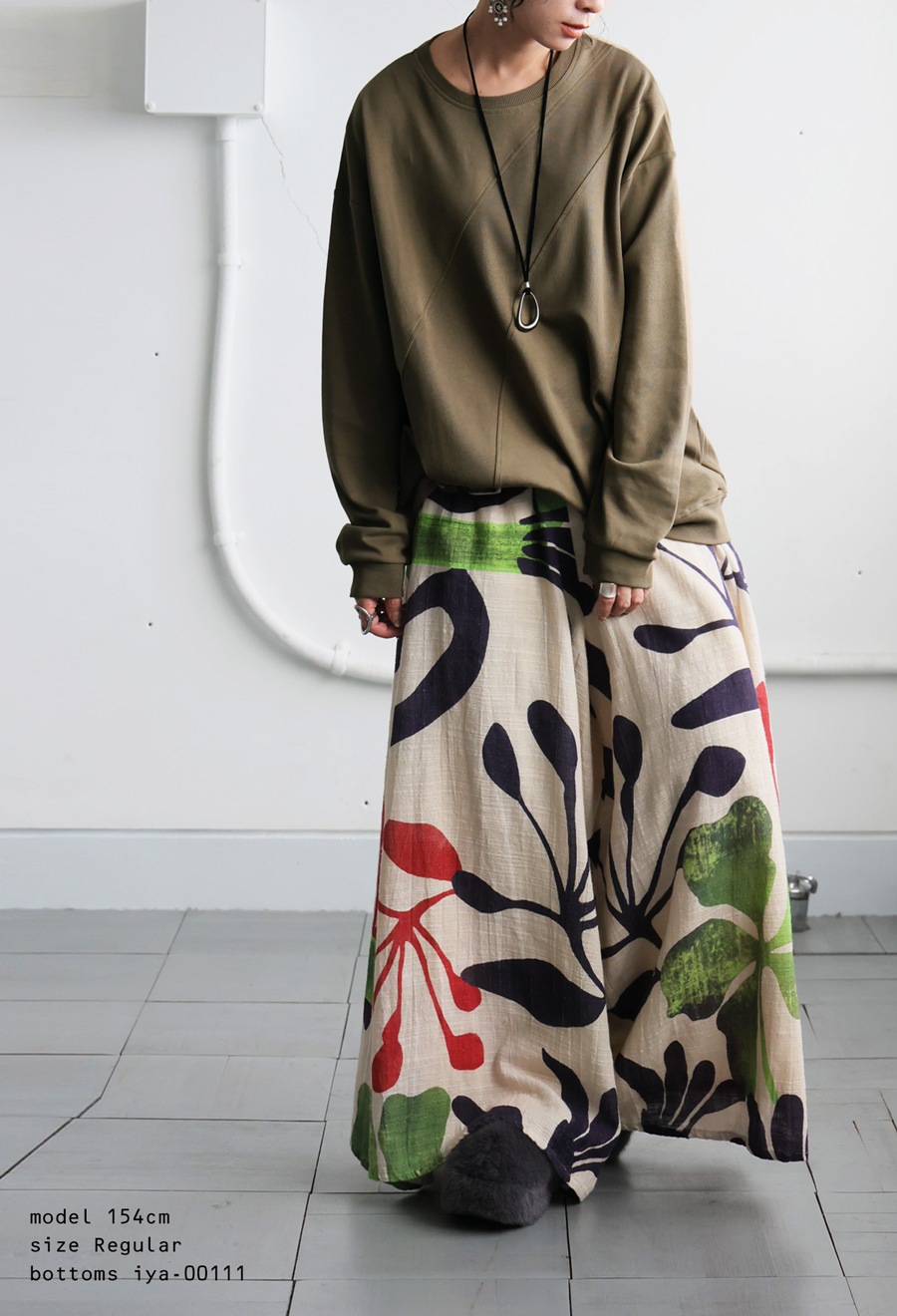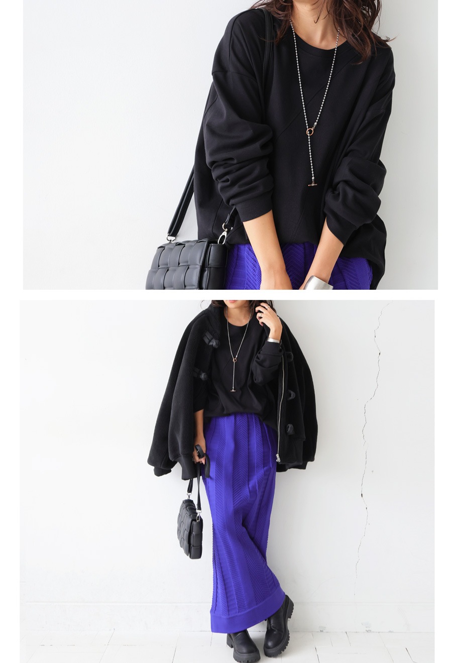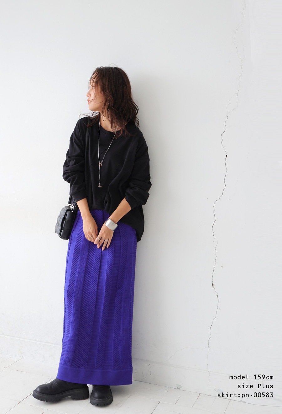 柄は無地ながら、リブの異素材切替がさりげないアクセントになり、表情豊かに魅せてくれます。