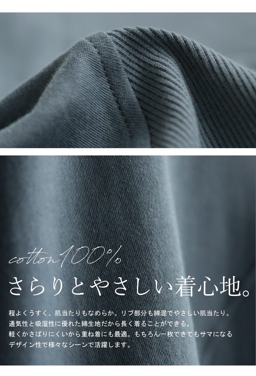 柔らかな綿100%素材(コットン)が肌にやさしく、さらりとした着心地がデイリーにぴったり。