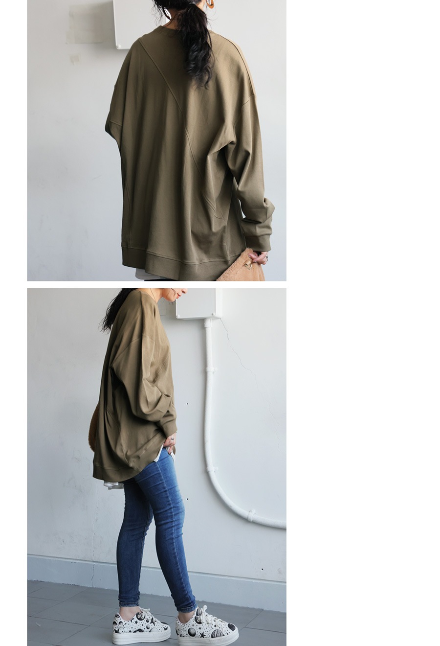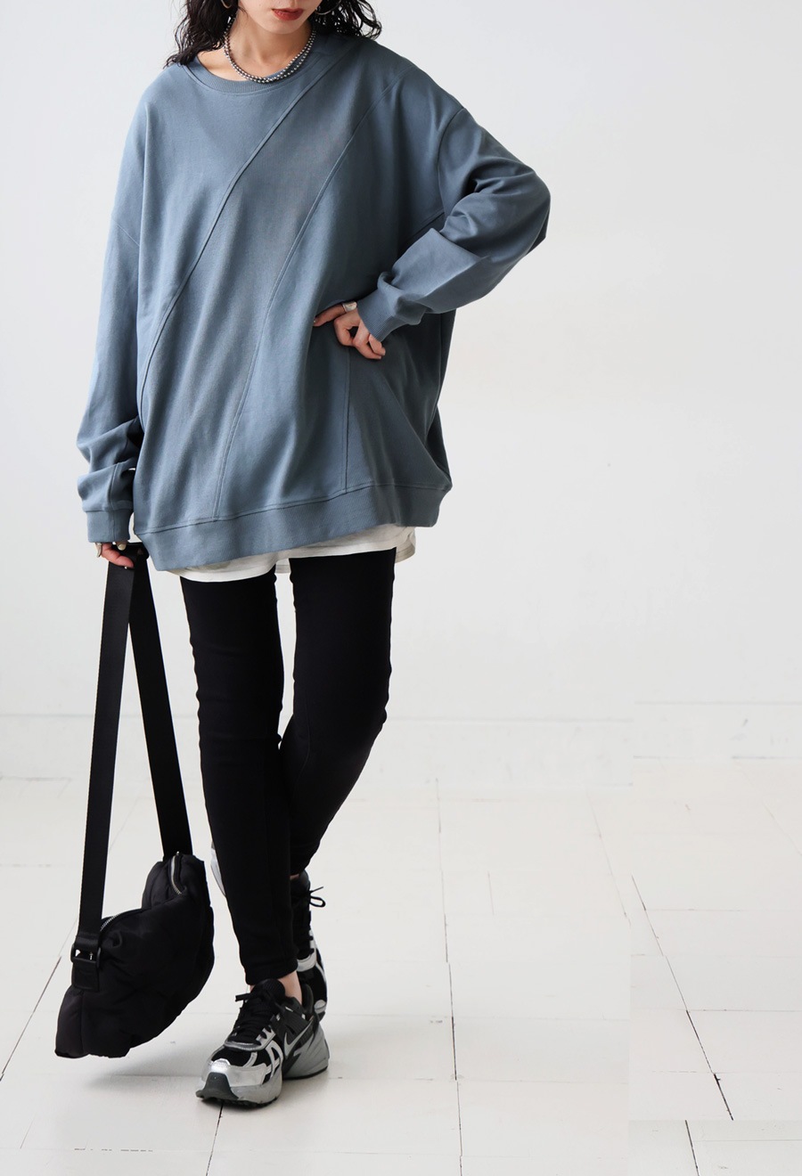 形状は肩を落としたドロップショルダーでゆるっとしたシルエットが抜け感を演出。