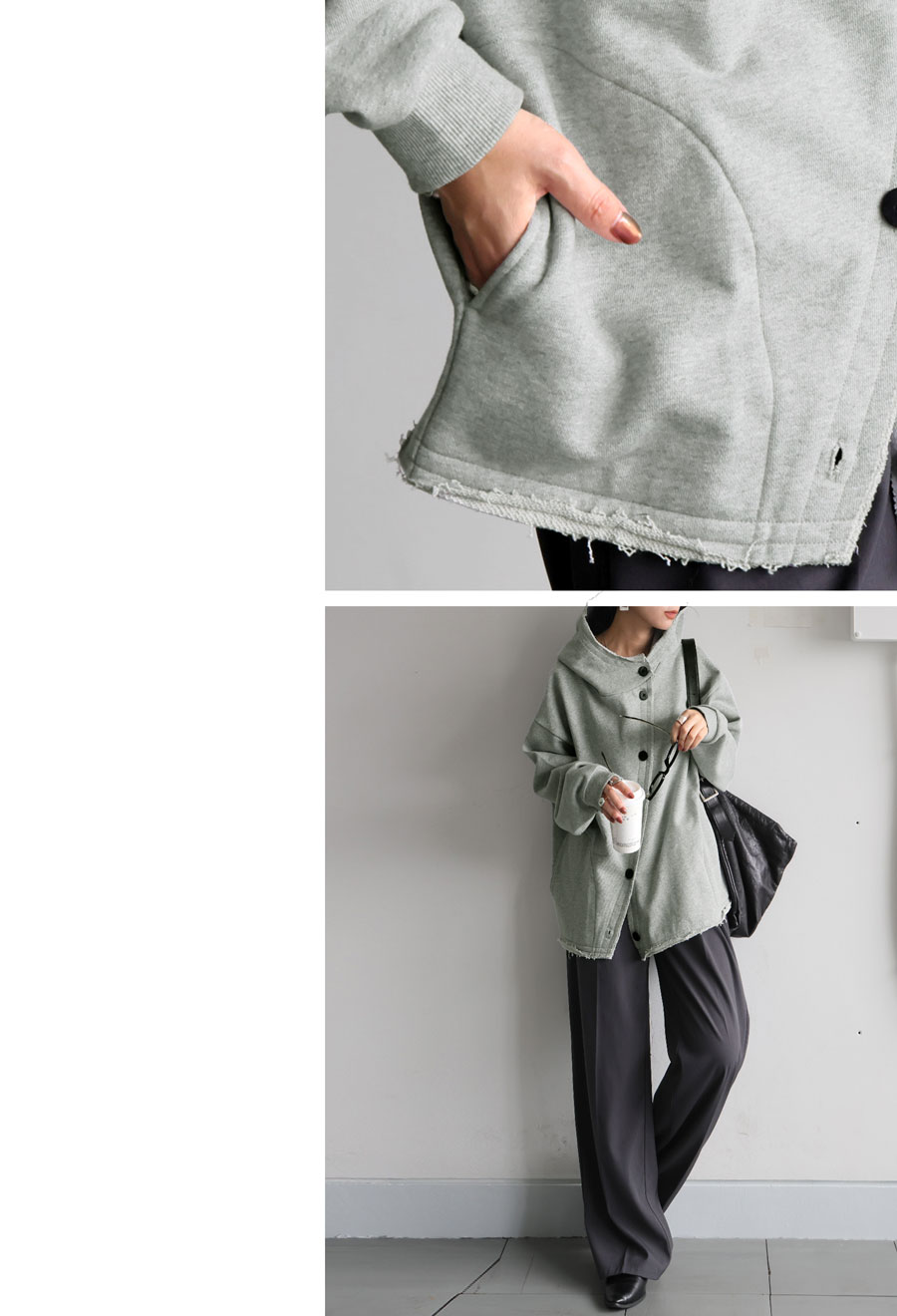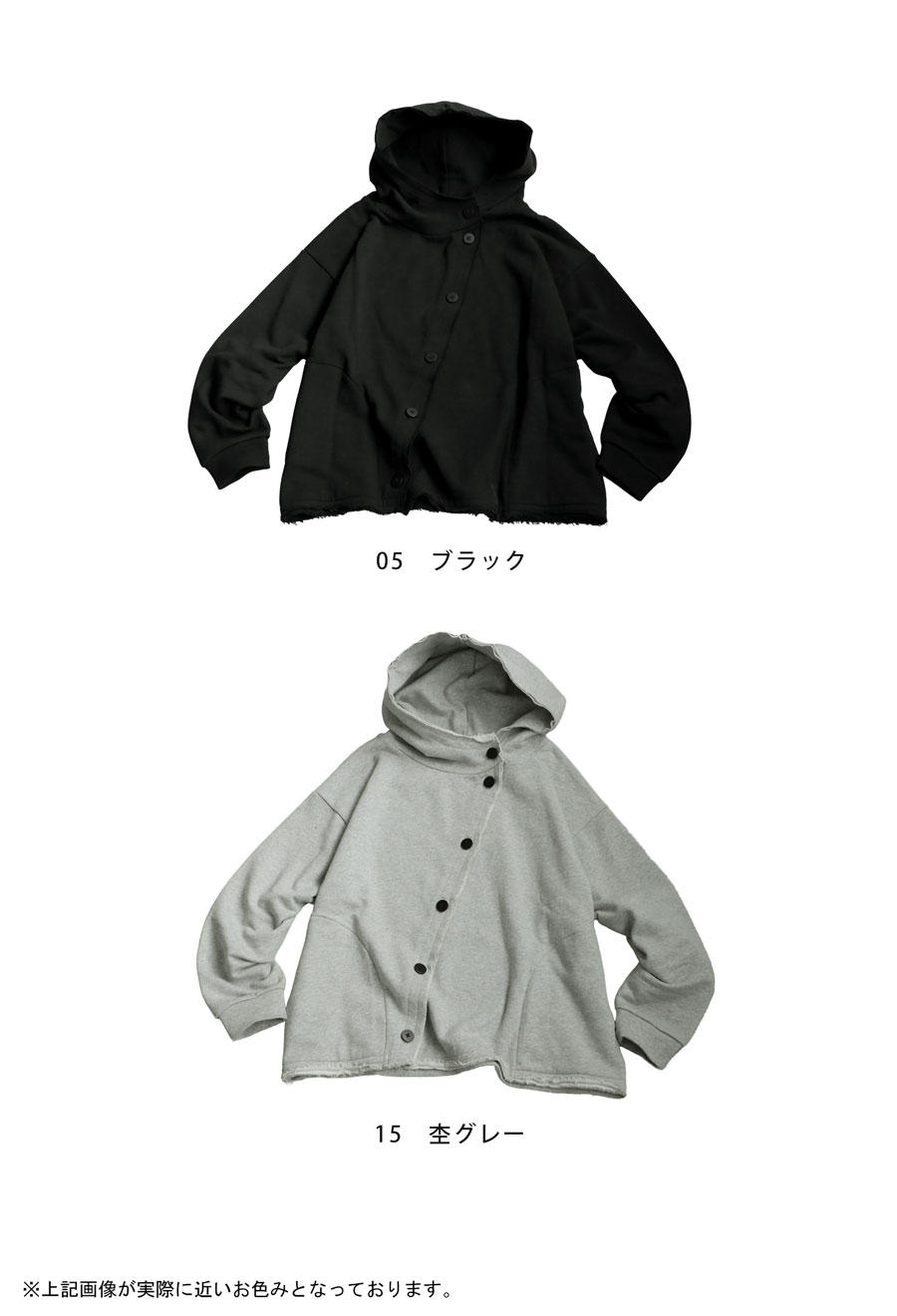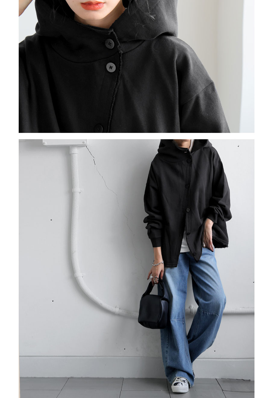 無地の中に映えるアシンメトリーなボタンデザインが印象的で、前を開けても閉めても雰囲気が変化。