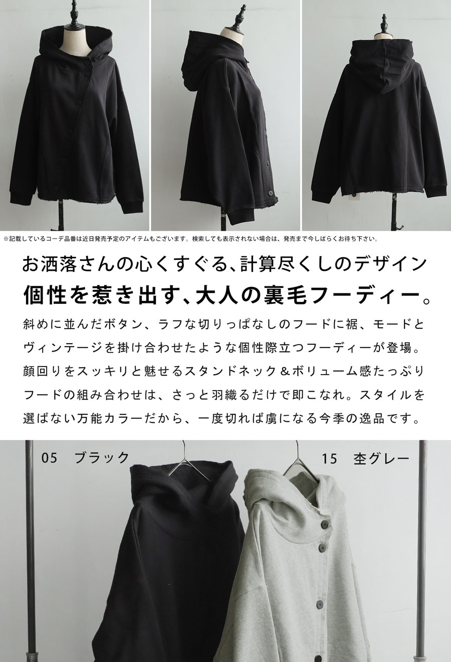 ネックラインは立体感あるフード付きのスウェットデザインで、顔まわりをすっきりと見せる形状。