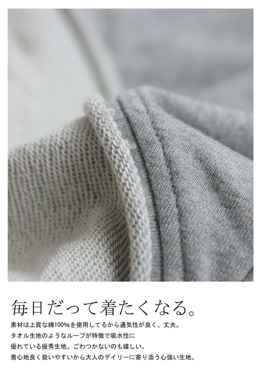 綿100%(コットン)のタオル地のような裏毛生地は、通気性・吸水性に優れ、長時間の着用でも快適です。