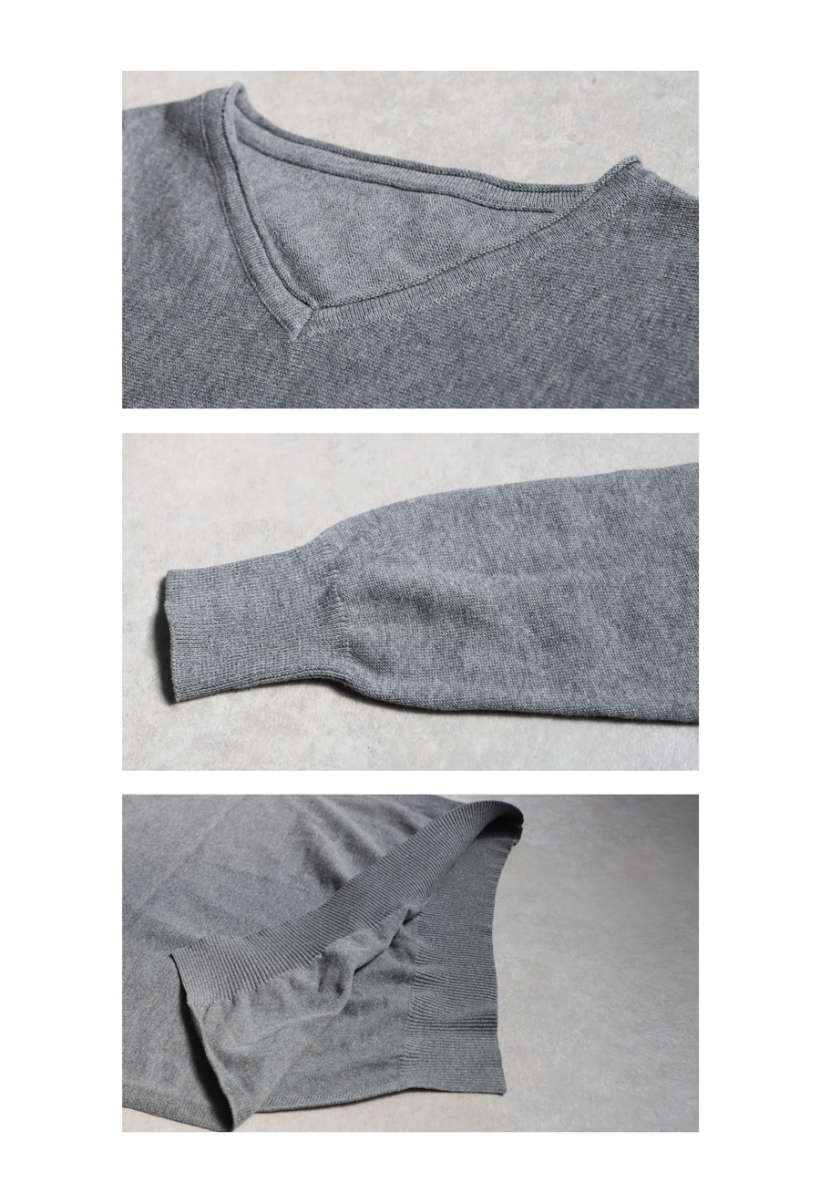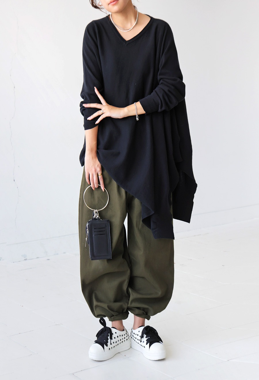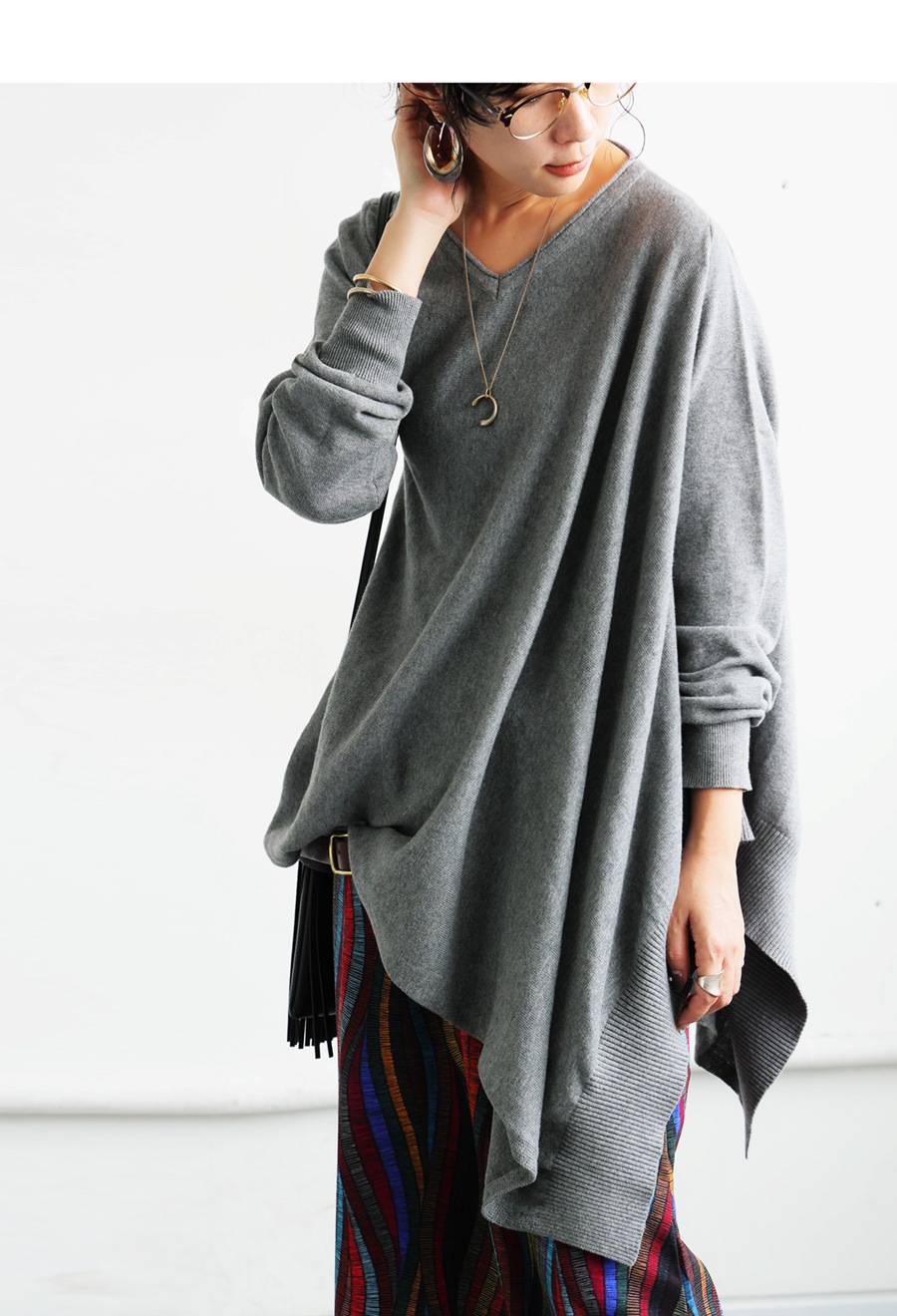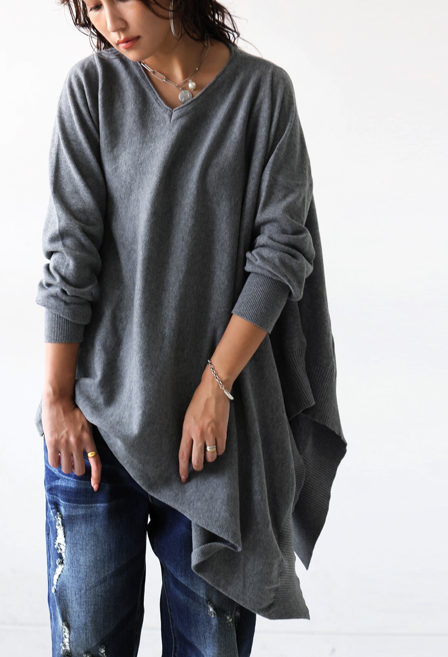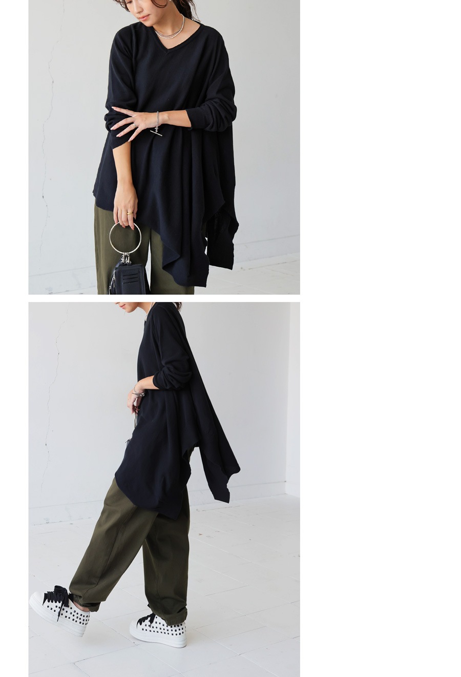 ネックラインはすっきり見えるVネックで、袖丈は程よく、ゆったりした丈感も嬉しいポイント。