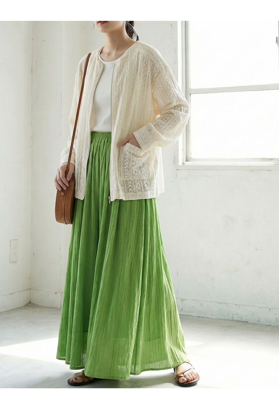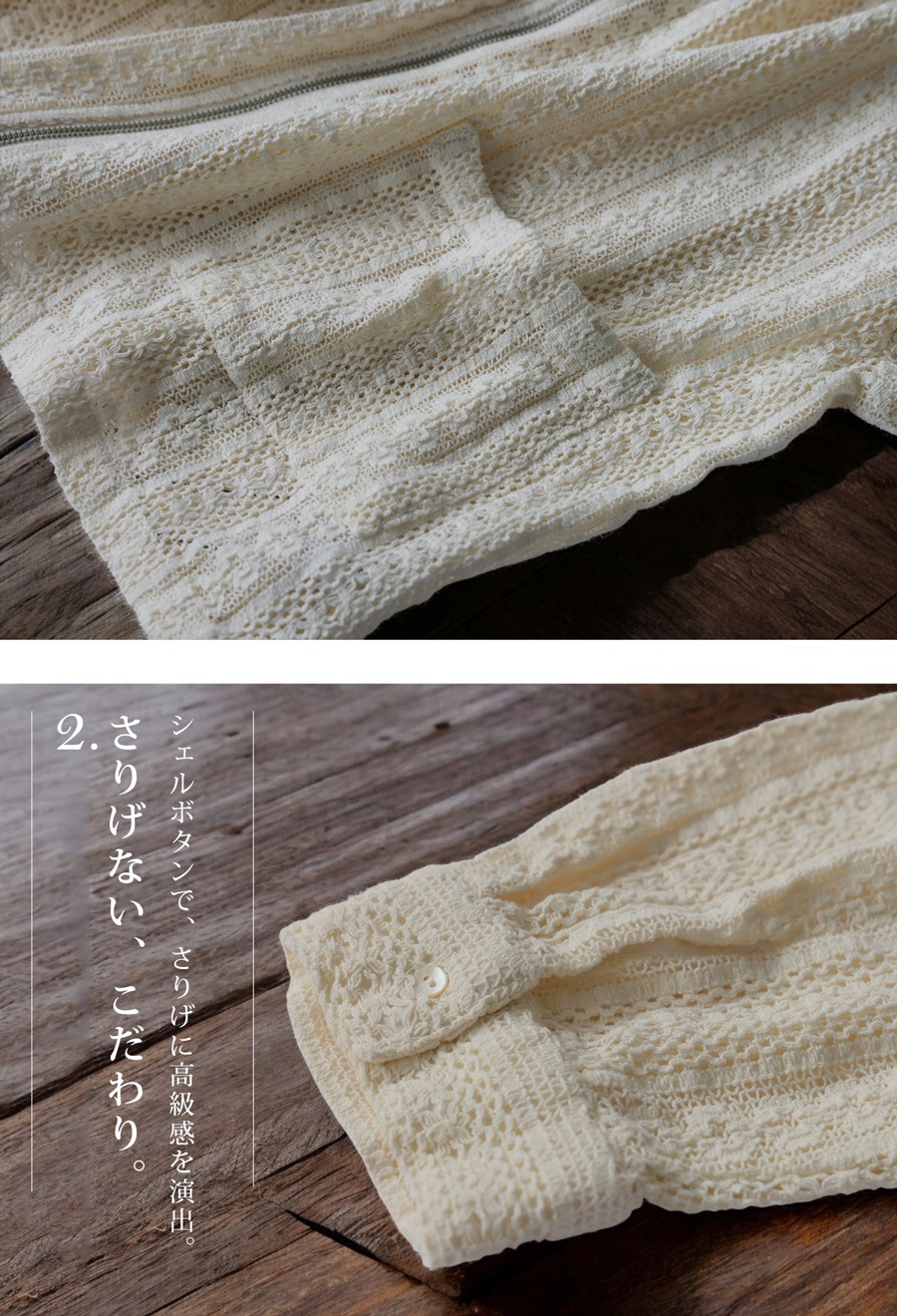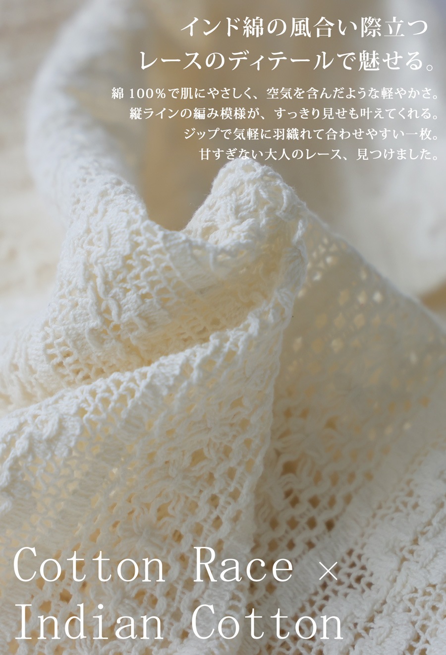 綿(コットン)100%の総レース素材は、肌あたりが優しく、カジュアルからきれいめまで幅広く活躍。