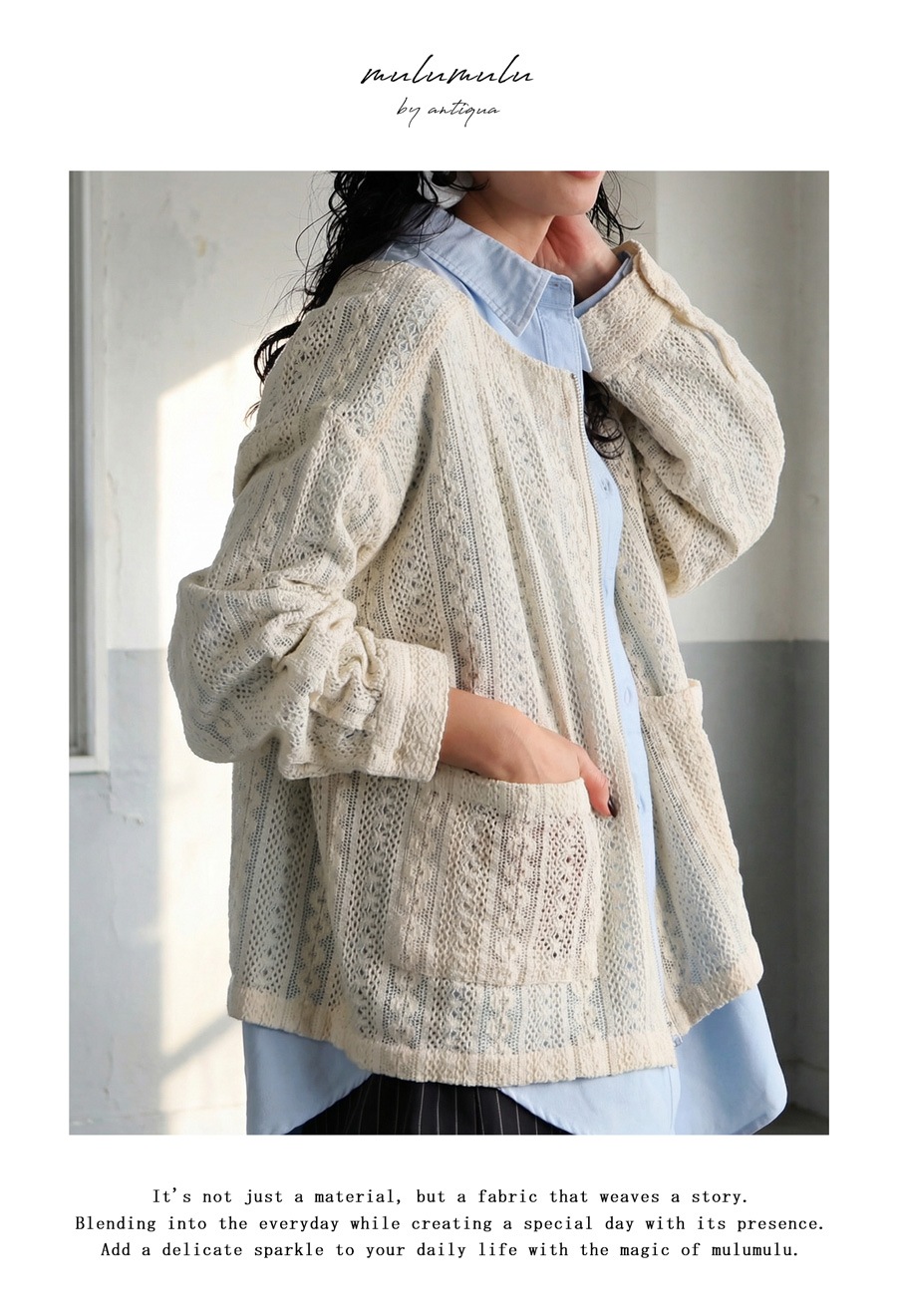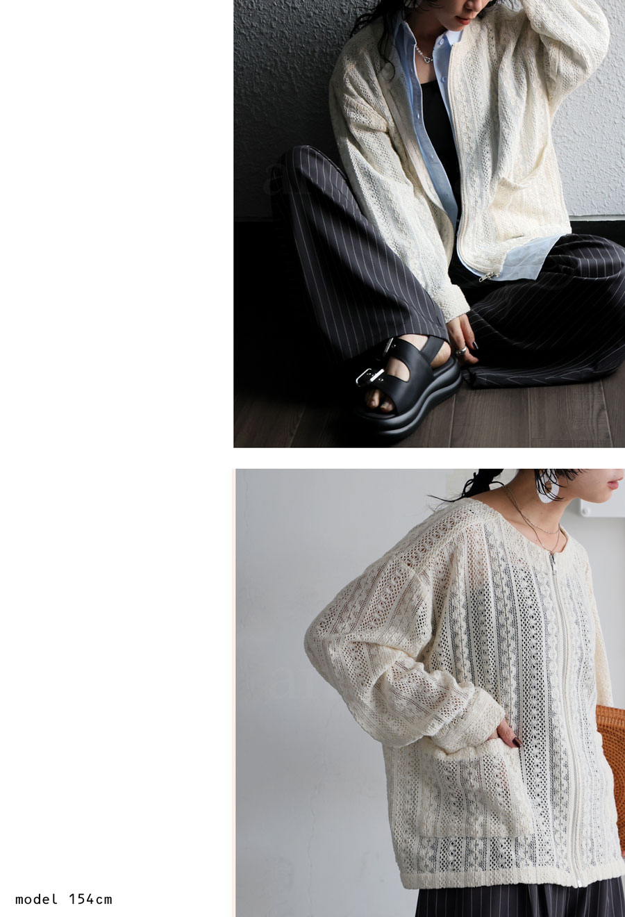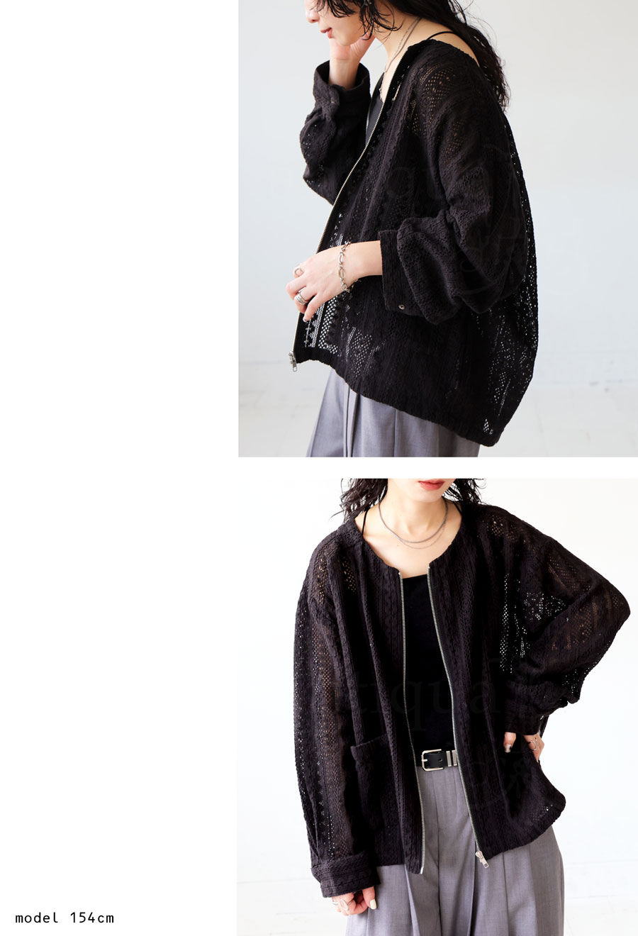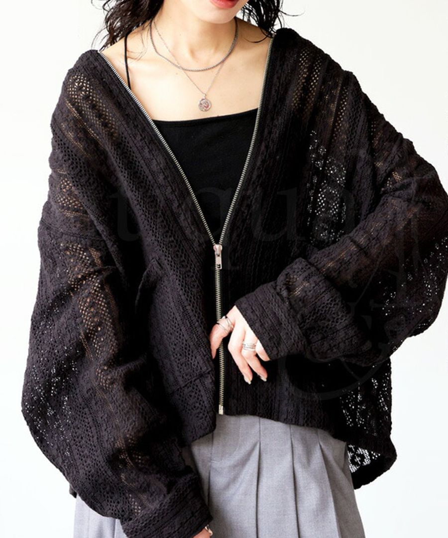 前開きのジップアップ仕様で着脱しやすく、ほどよい透け感が抜け感あるコーデを演出します。