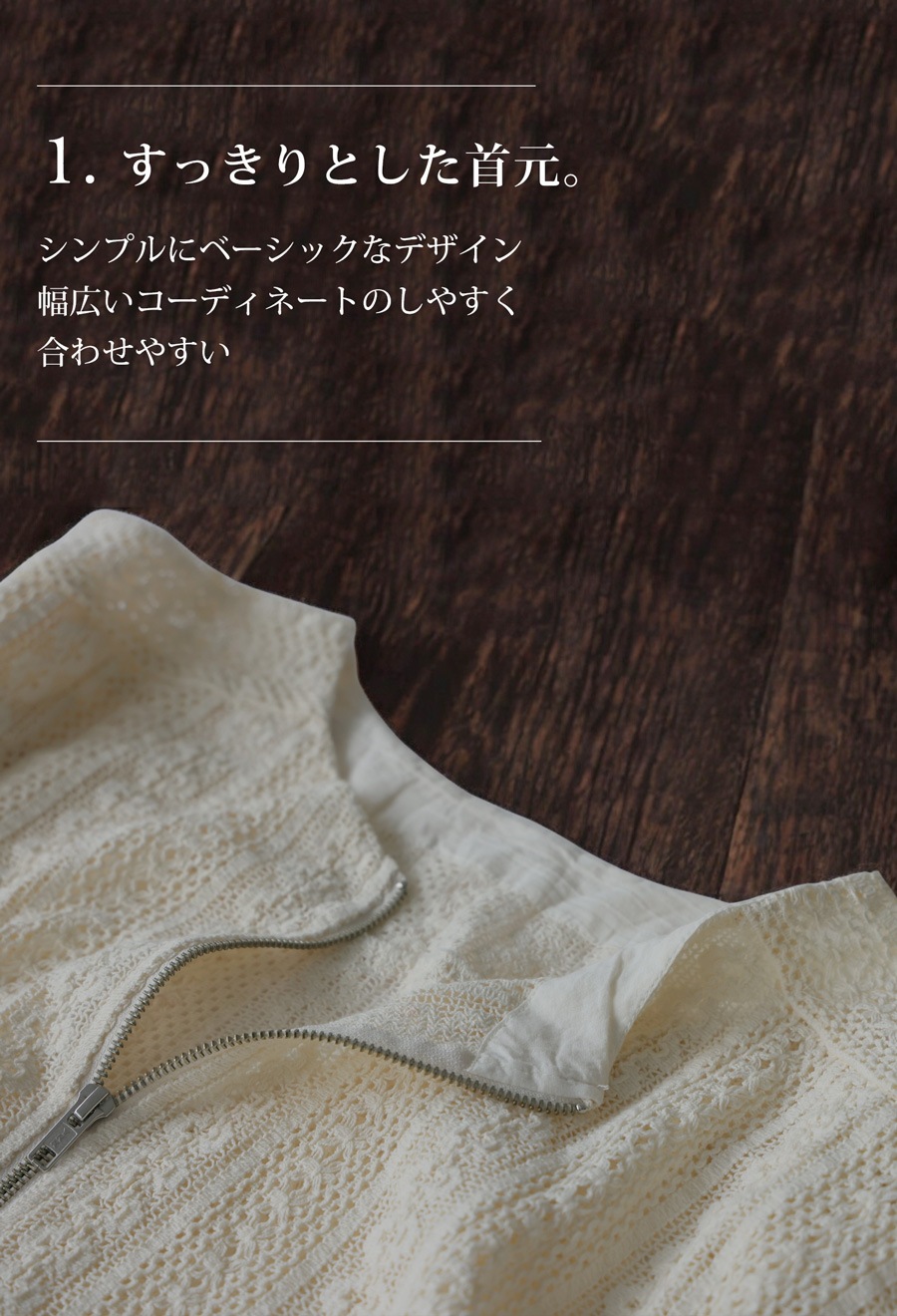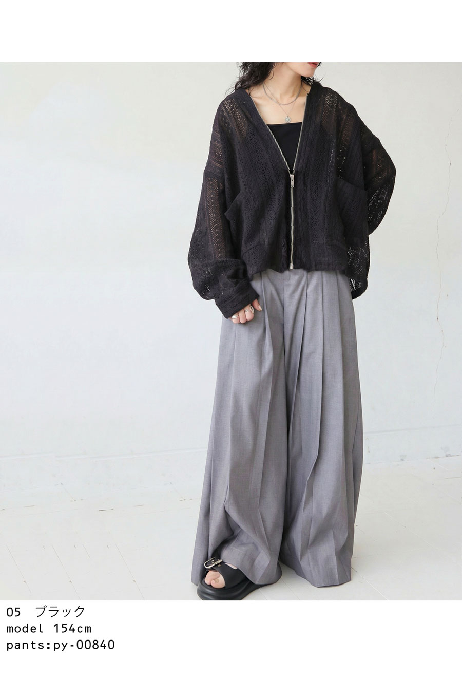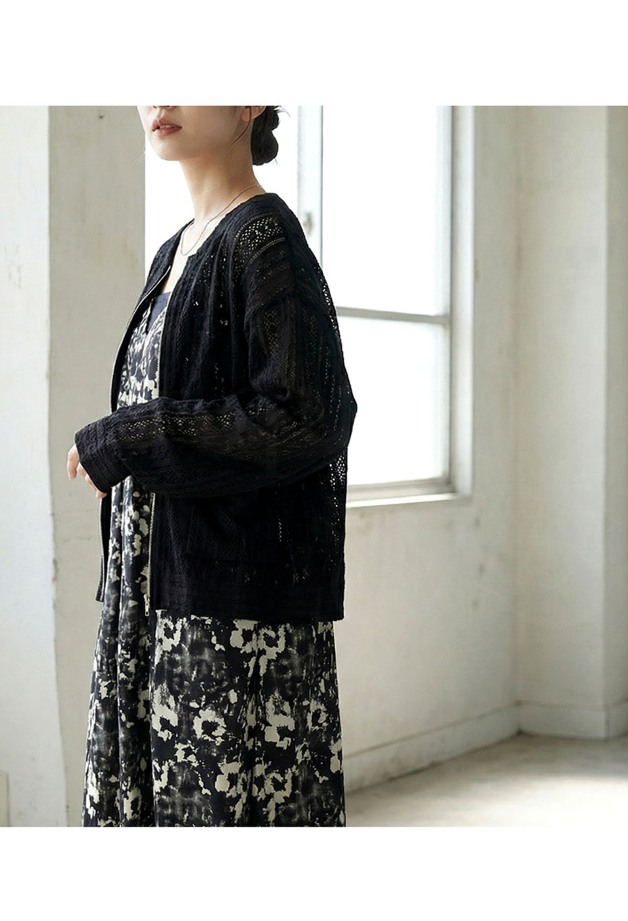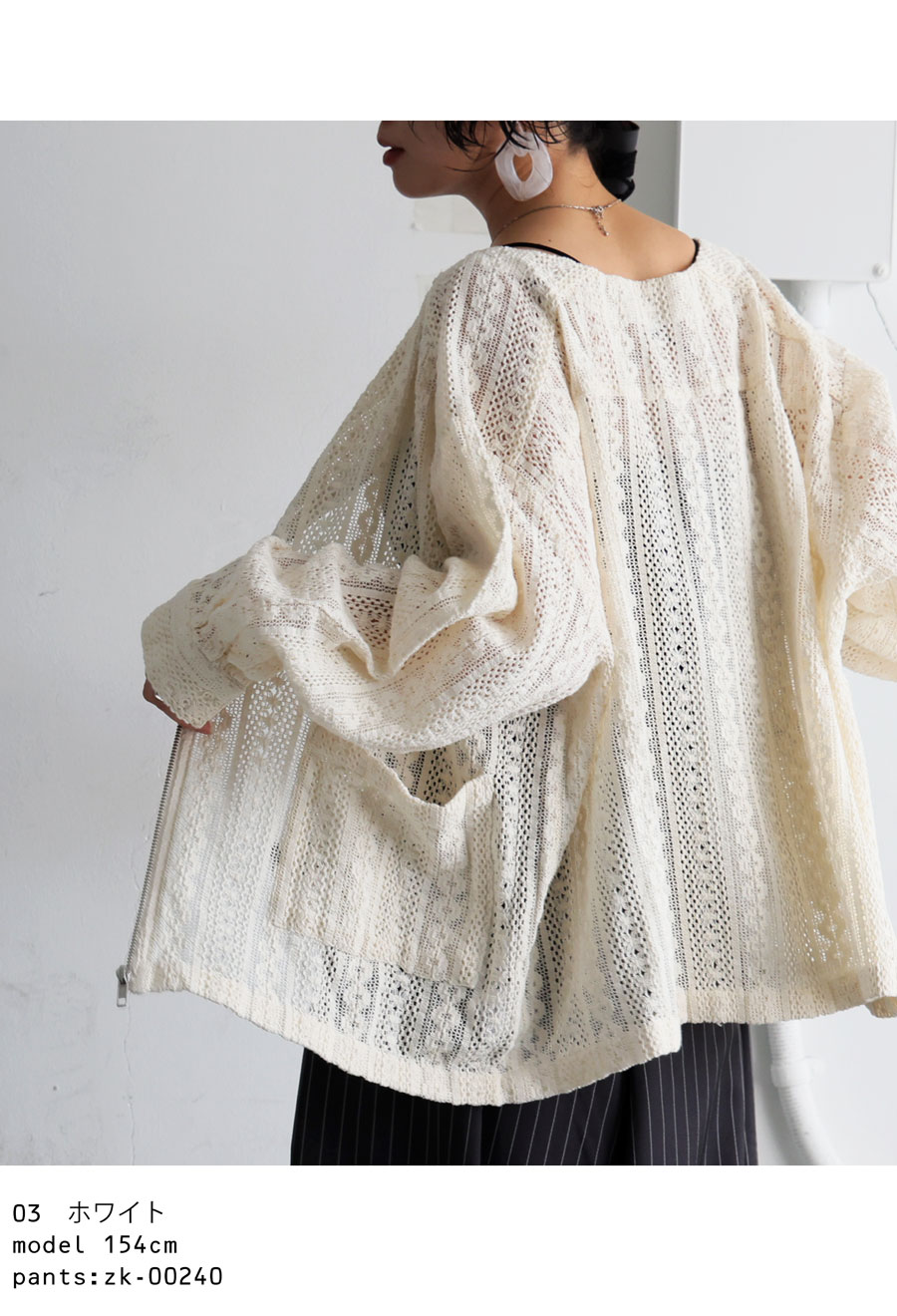 前開きのジップアップ仕様で着脱しやすく、ほどよい透け感が抜け感あるコーデを演出します。