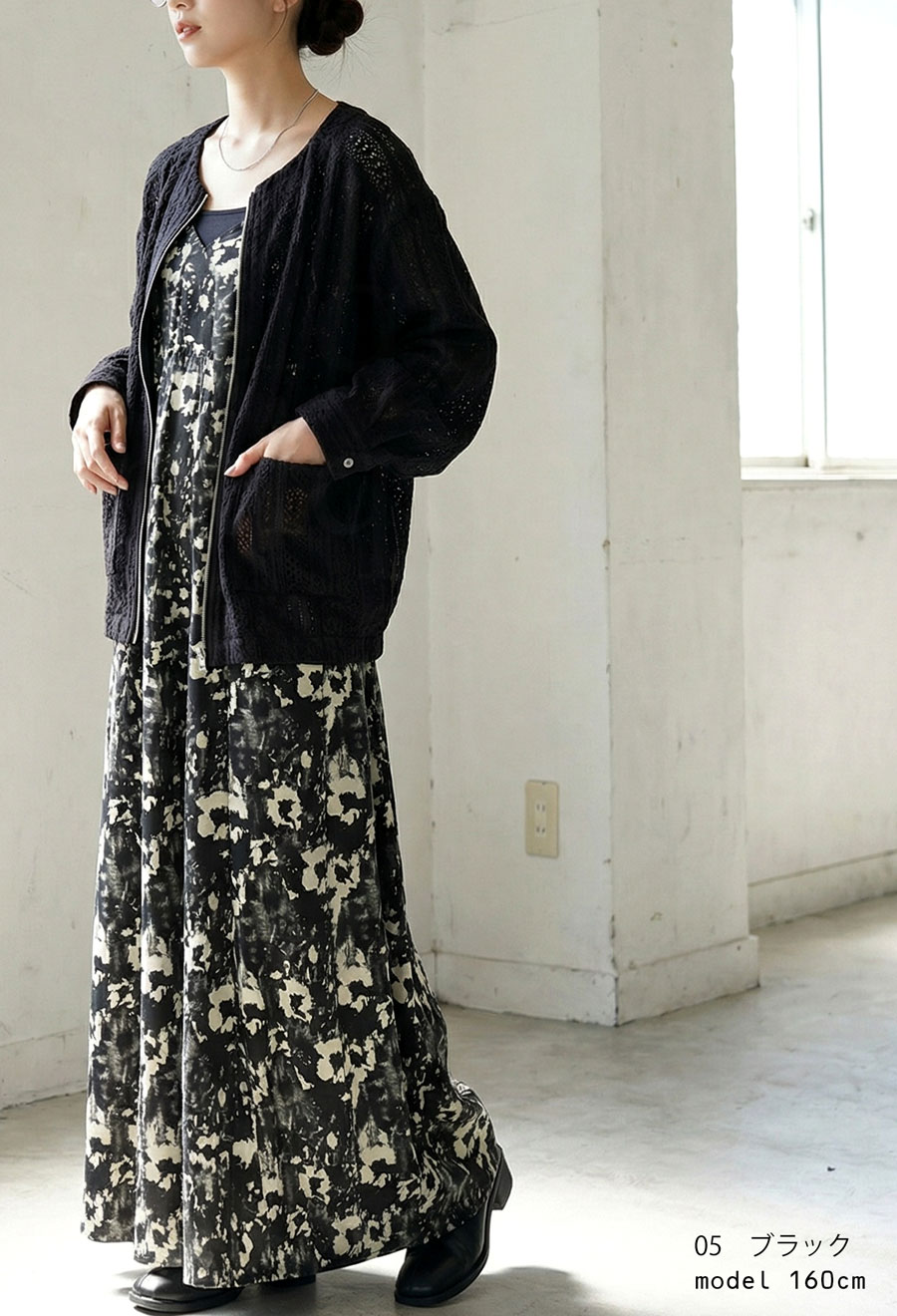 シンプルな色合いで合わせやすく、体型カバーも叶える一着です。