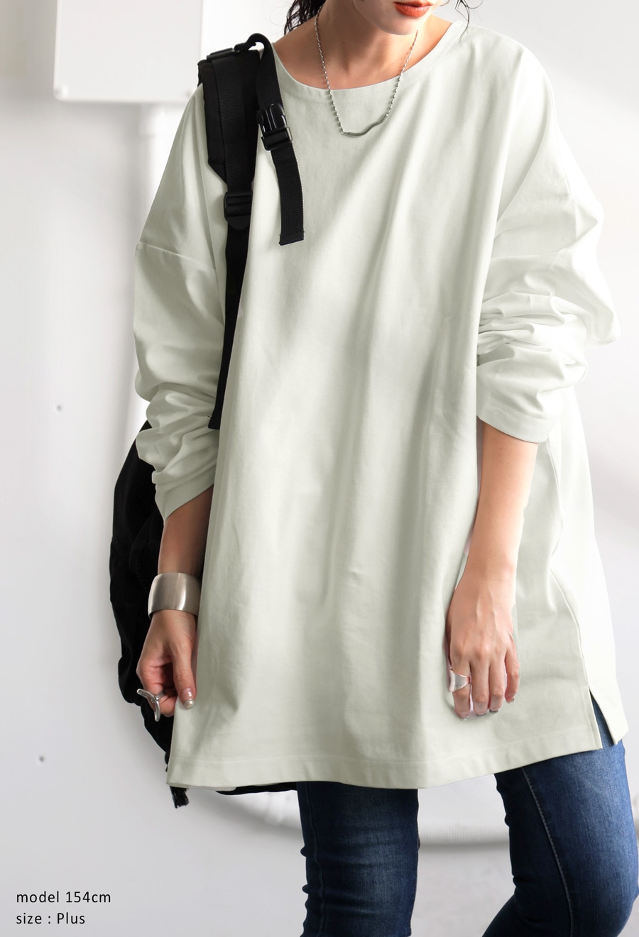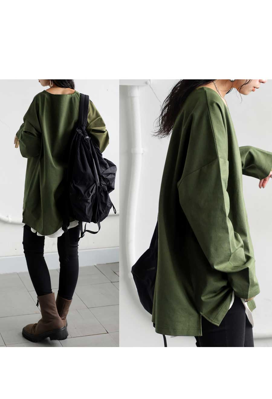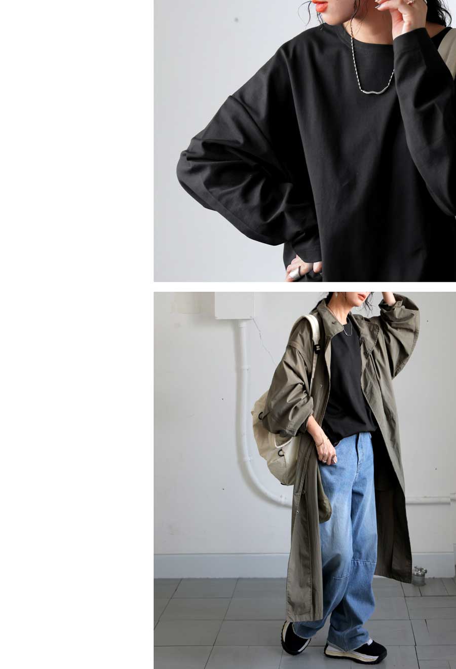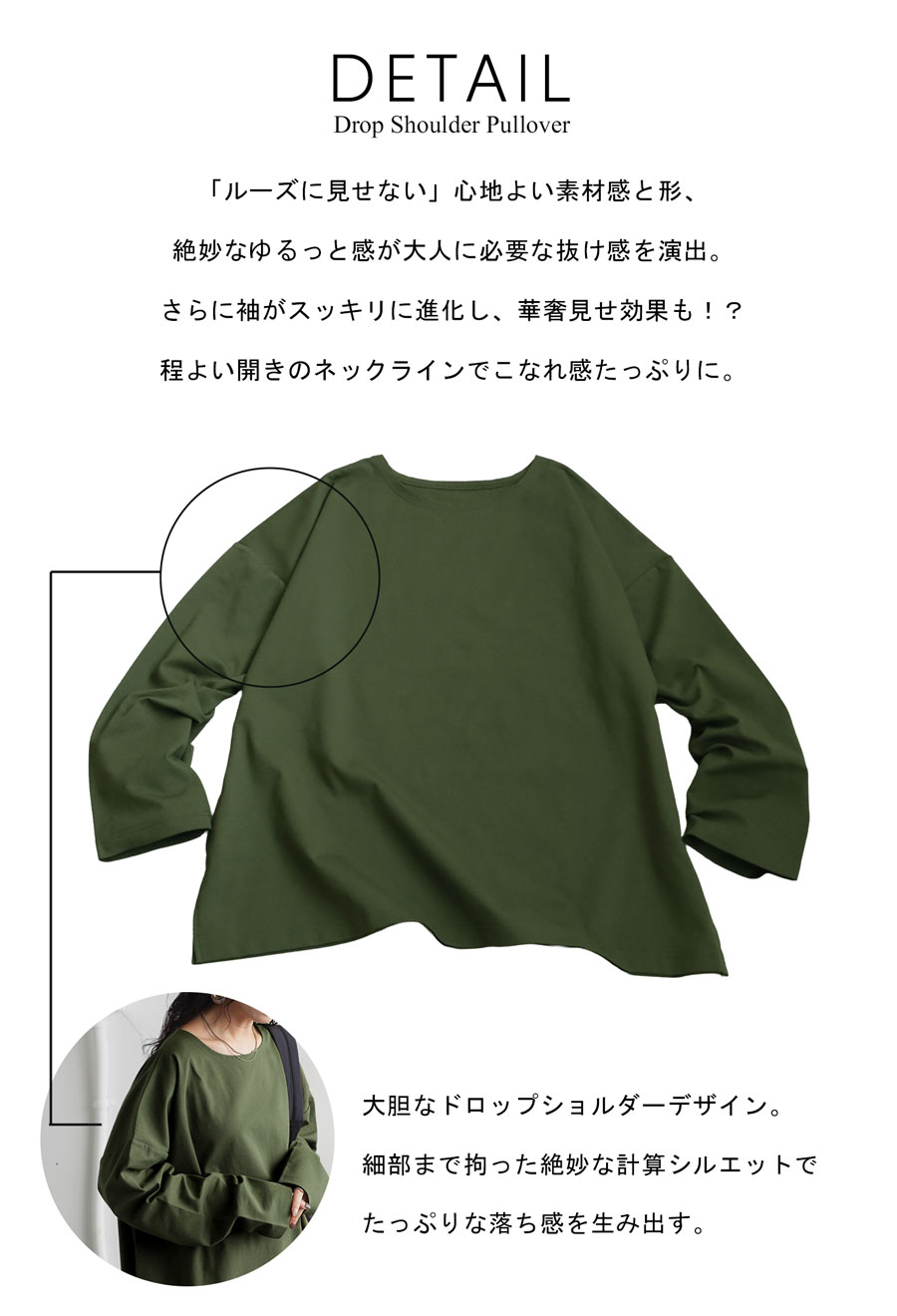 ドロップショルダーが自然な抜け感を演出し、体のラインを拾いにくいゆったりとした形状も魅力です。