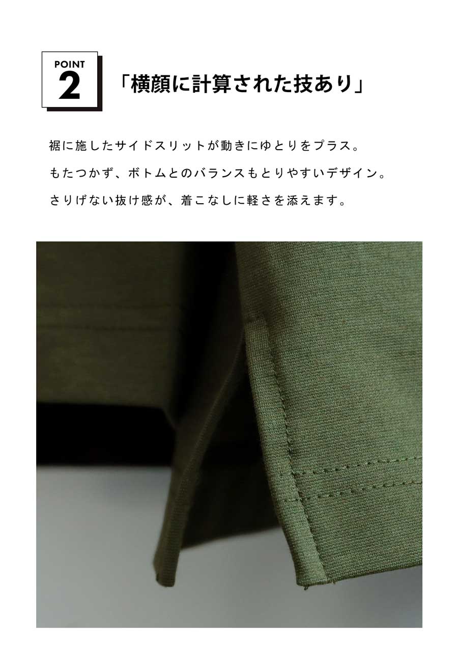 サイドスリットが動きを妨げず、着こなしの幅も広がります。