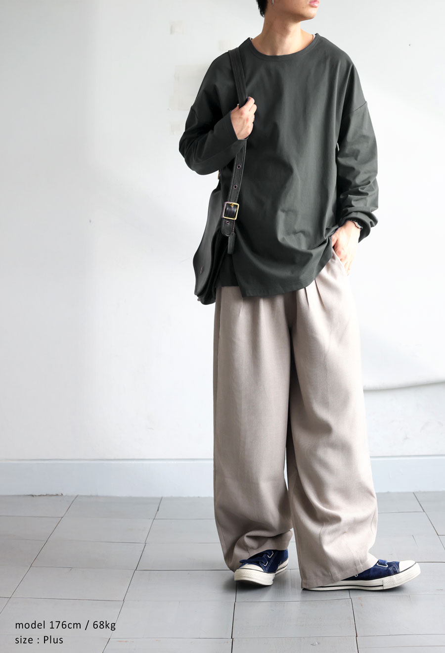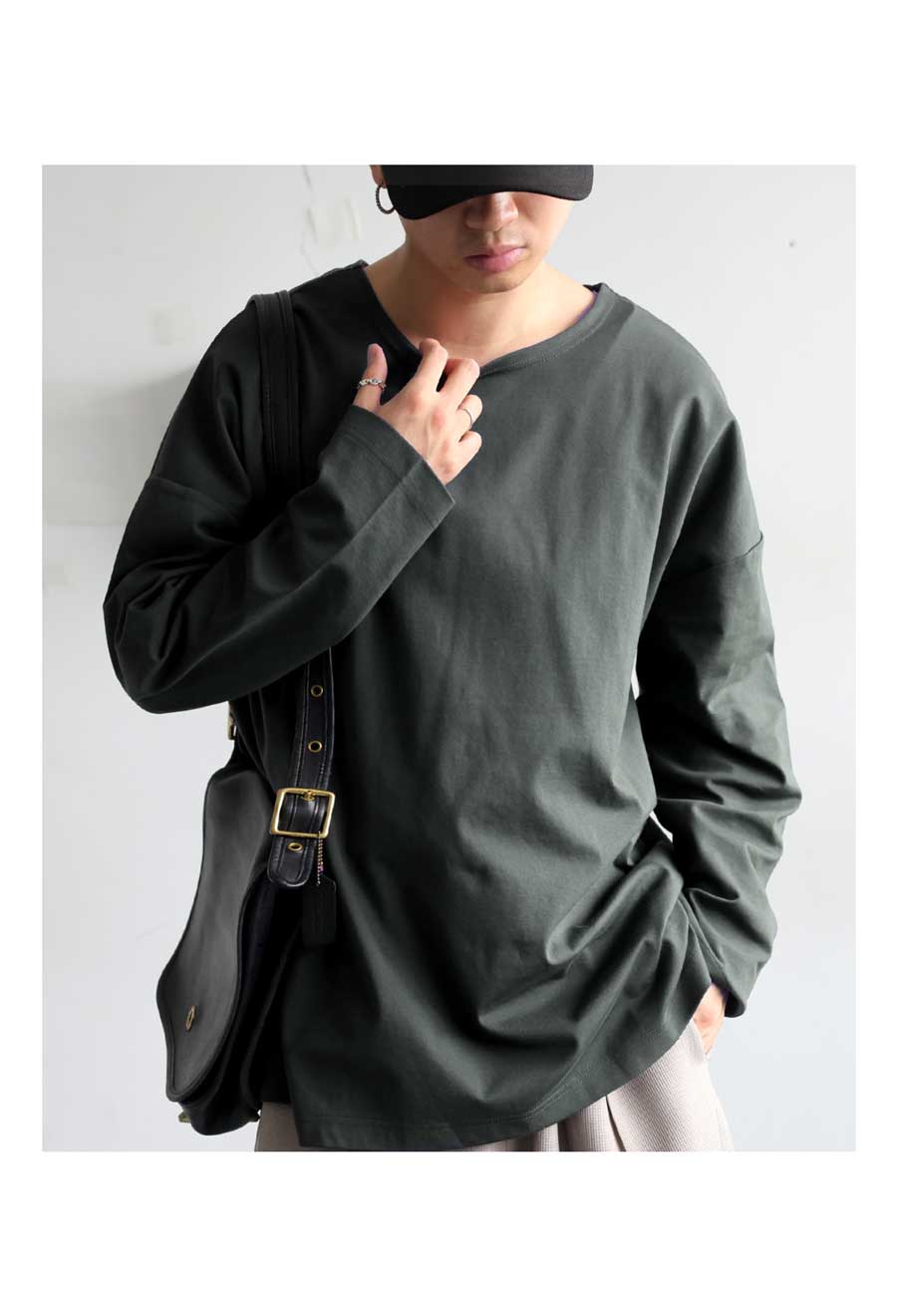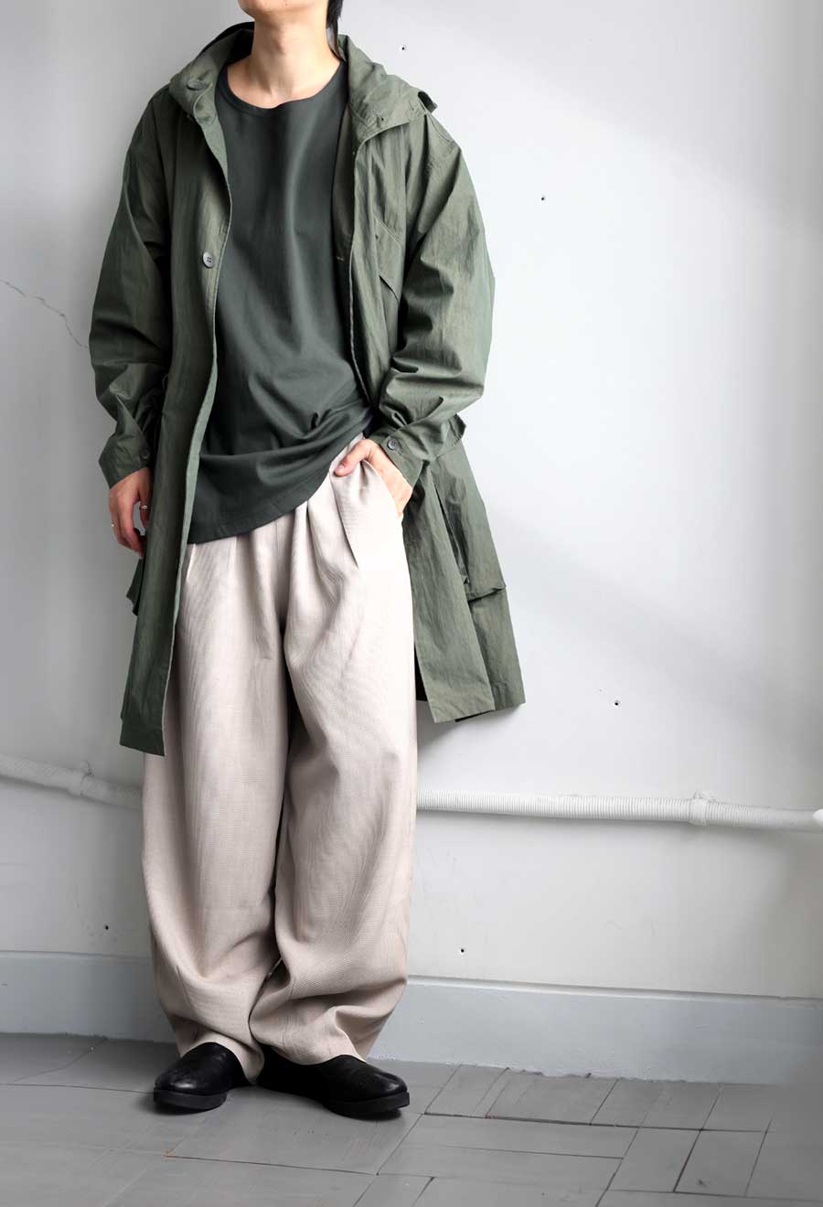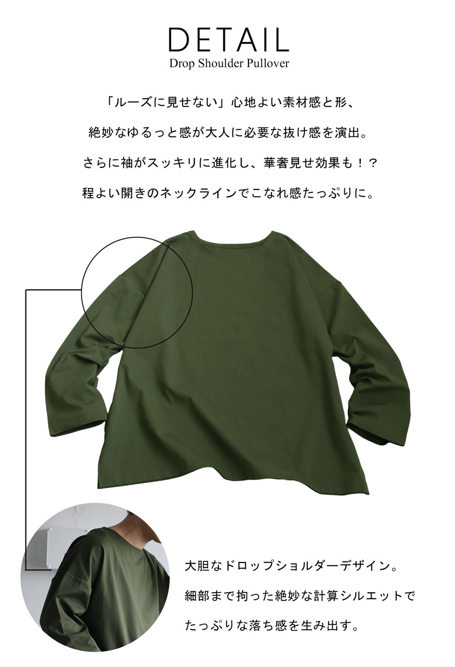 ドロップショルダーの形状が肩まわりに抜け感を与え、ルーズすぎず上品に着られる一枚です。