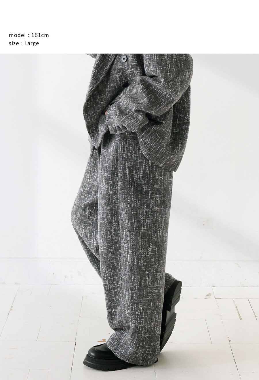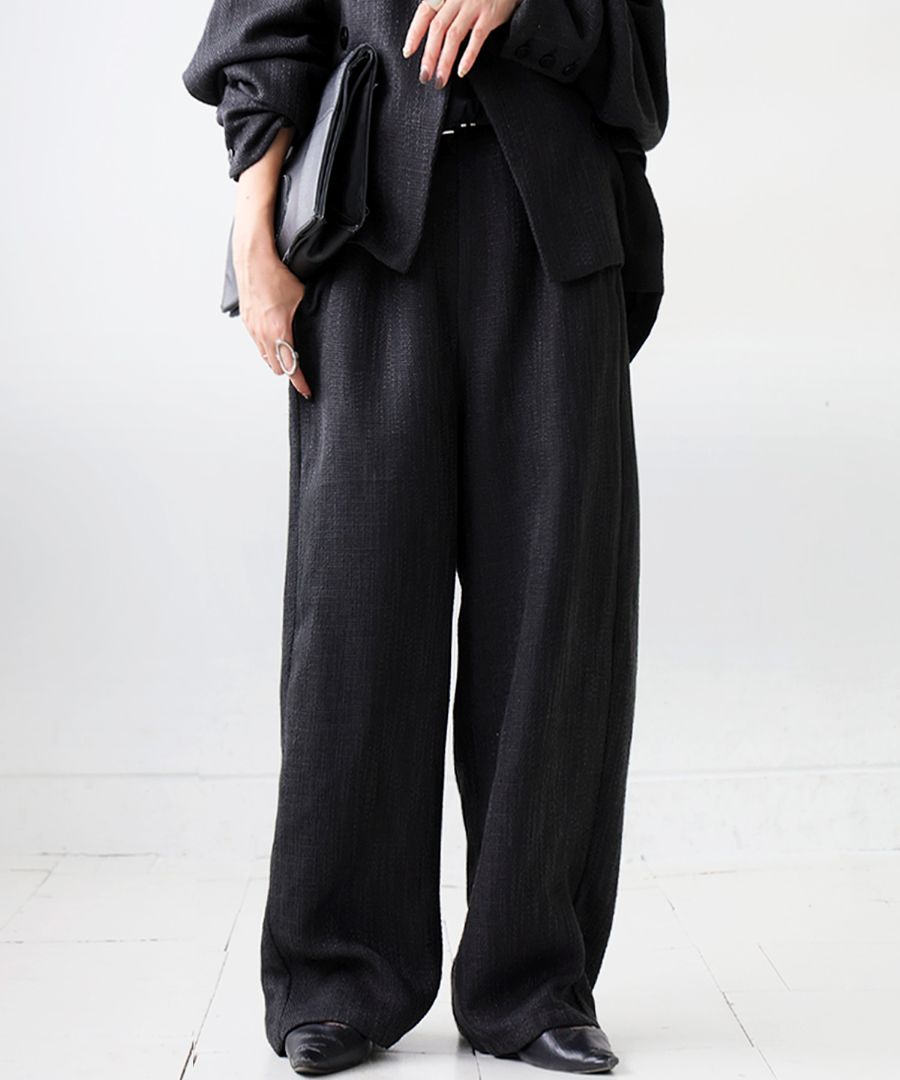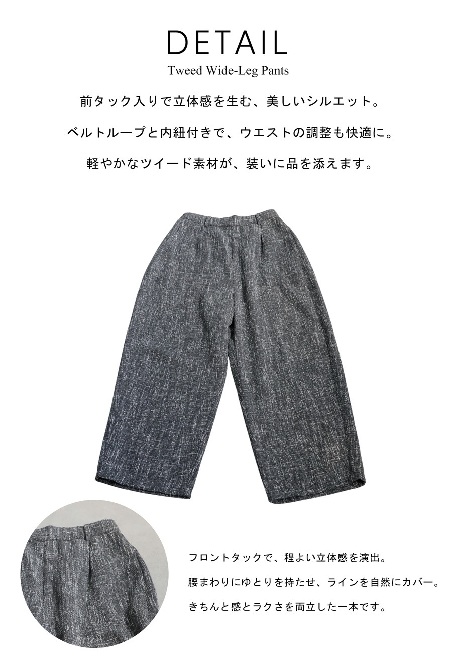 奥行きあるツイード柄の織り素材が上品な印象を与えるワイドパンツです。