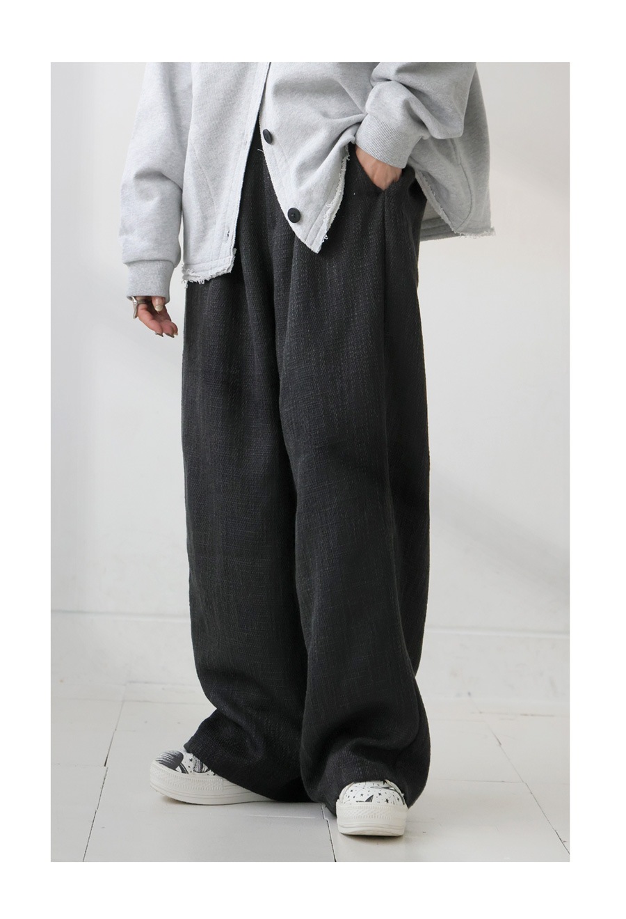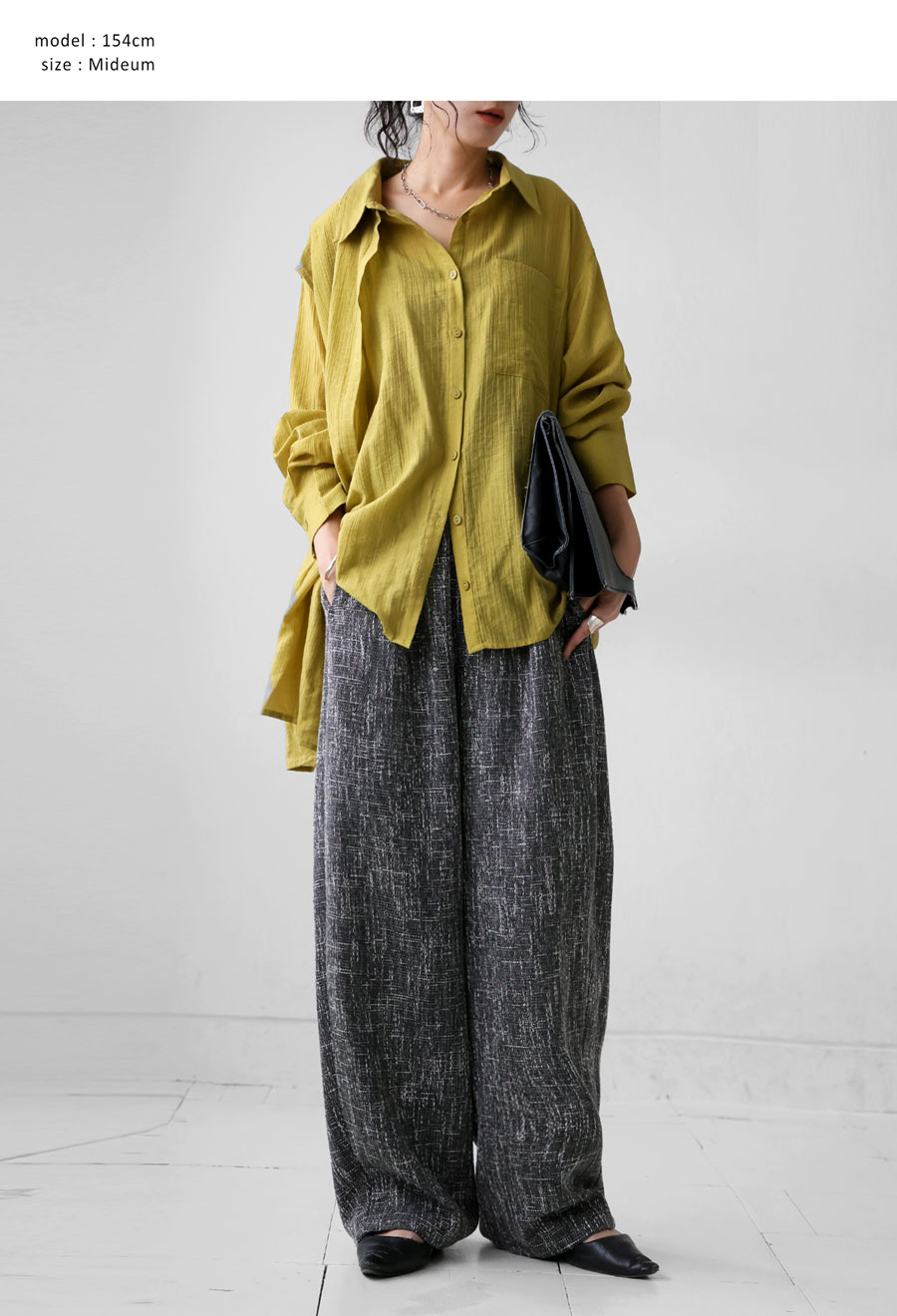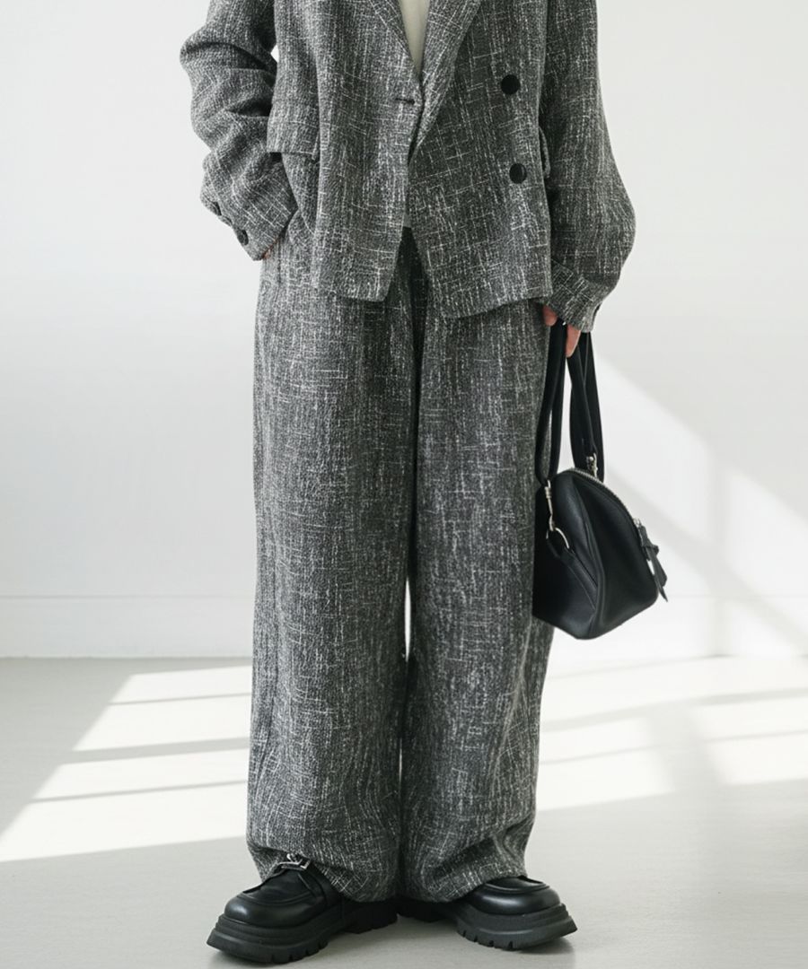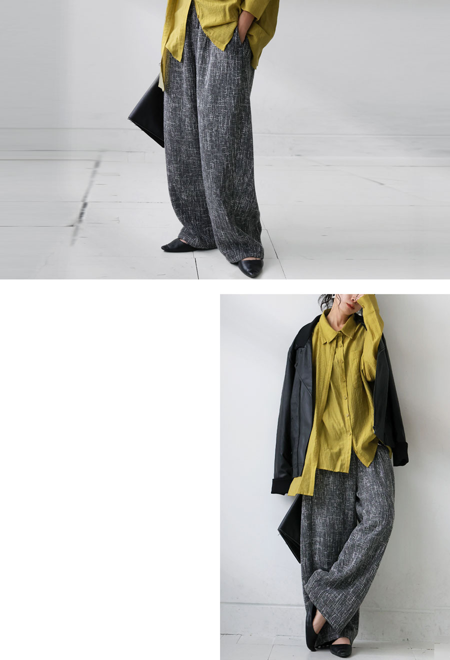 奥行きあるツイード柄の織り素材が上品な印象を与えるワイドパンツです。