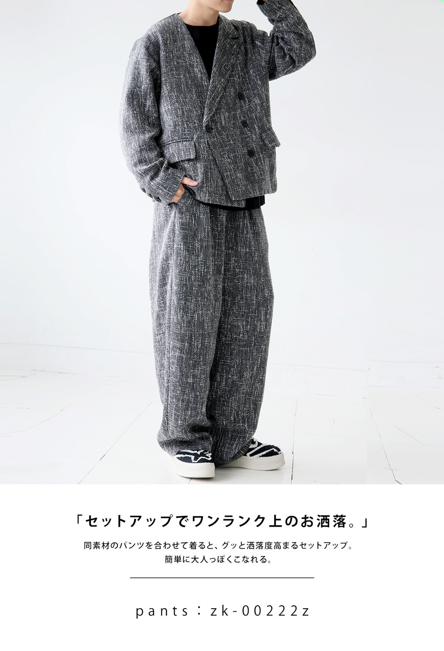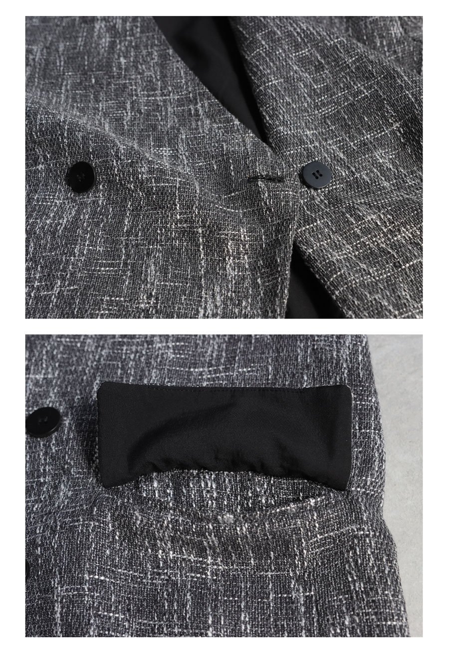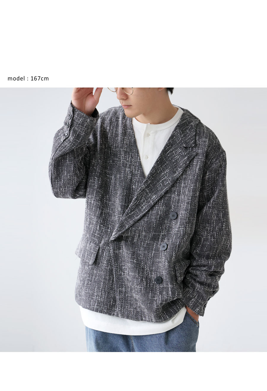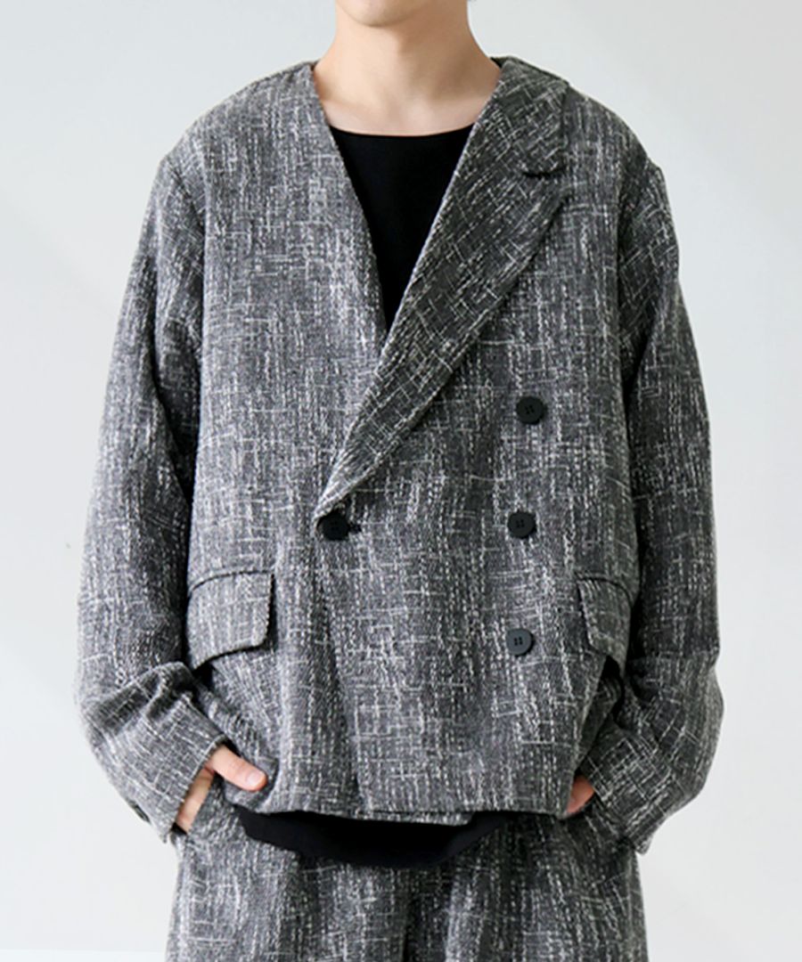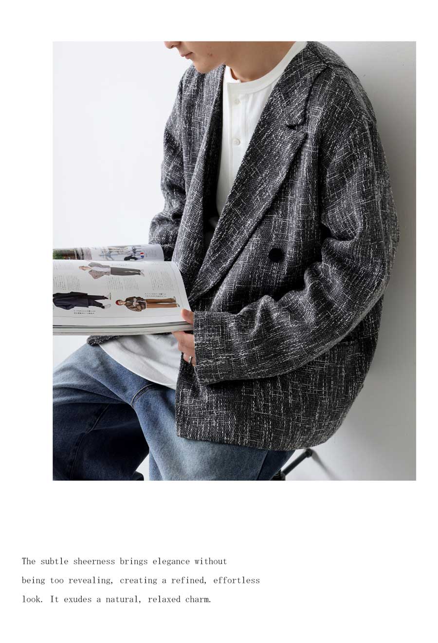 クラシカルなツイード柄を現代的にアレンジした、メンズ用ダブルブレストジャケットです。