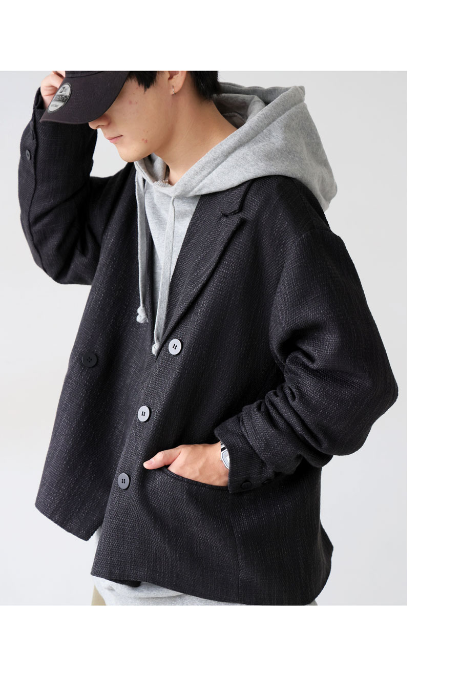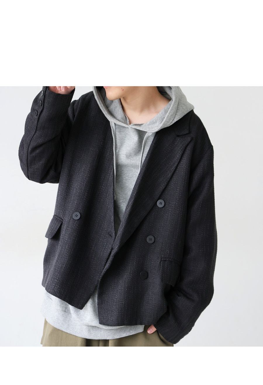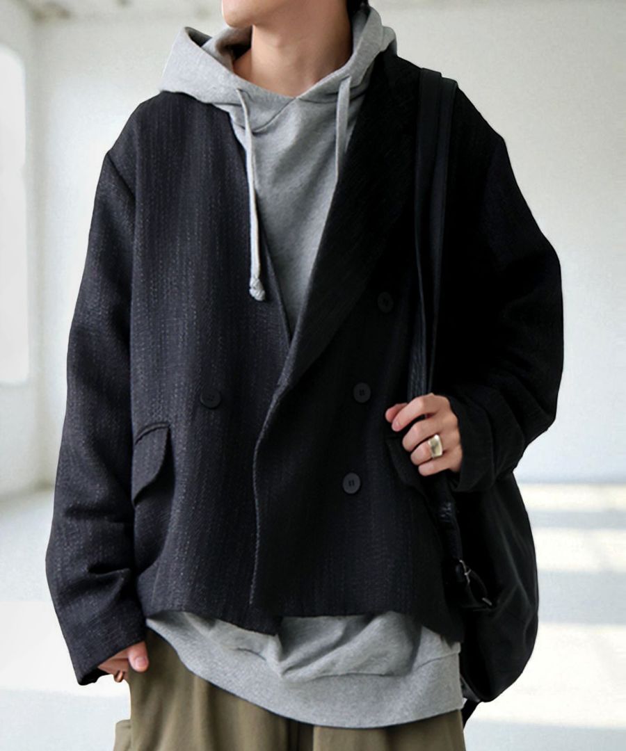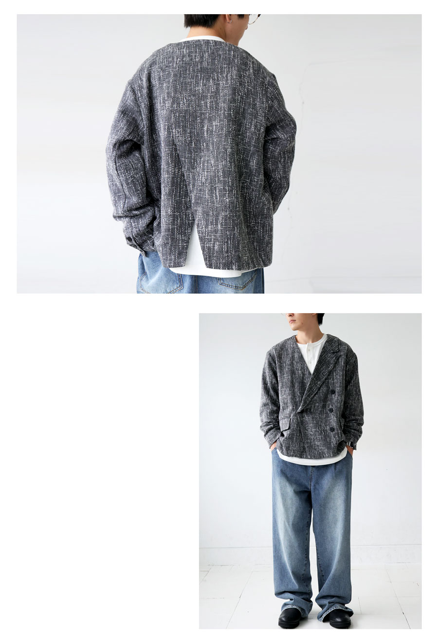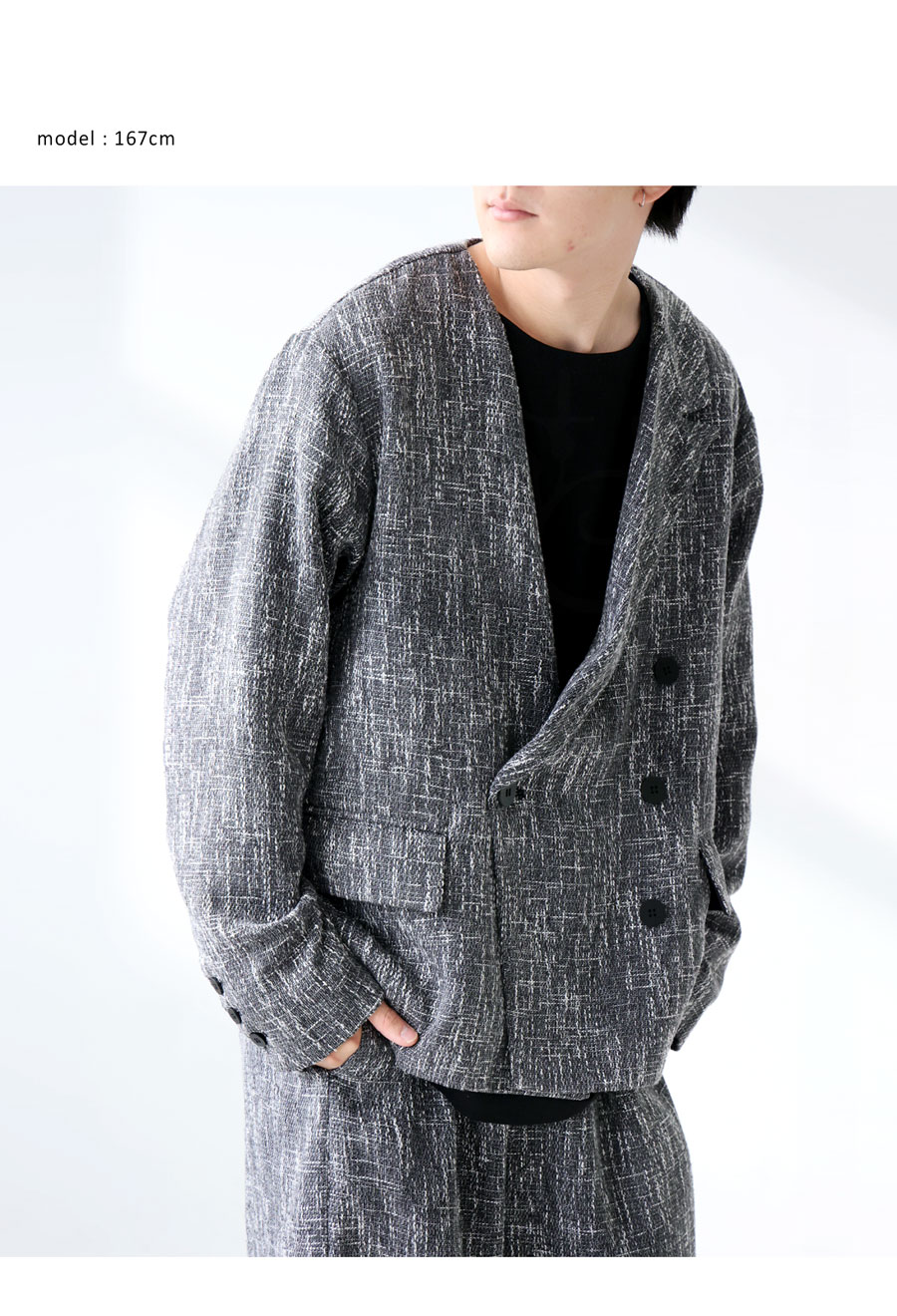 クラシカルなツイード柄を現代的にアレンジした、メンズ用ダブルブレストジャケットです。