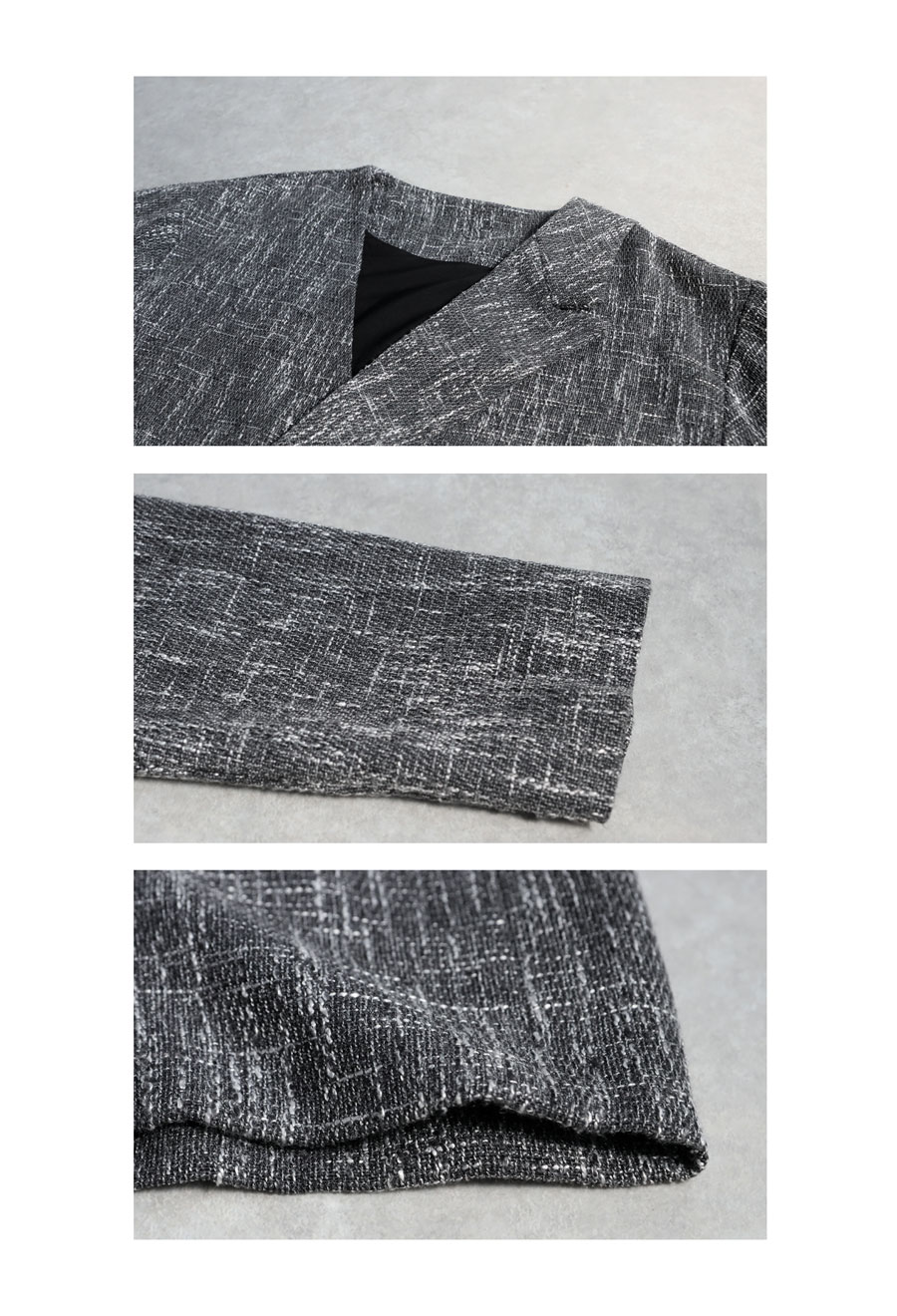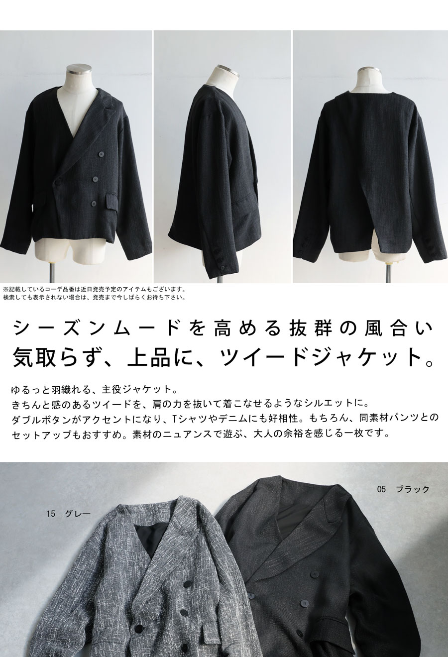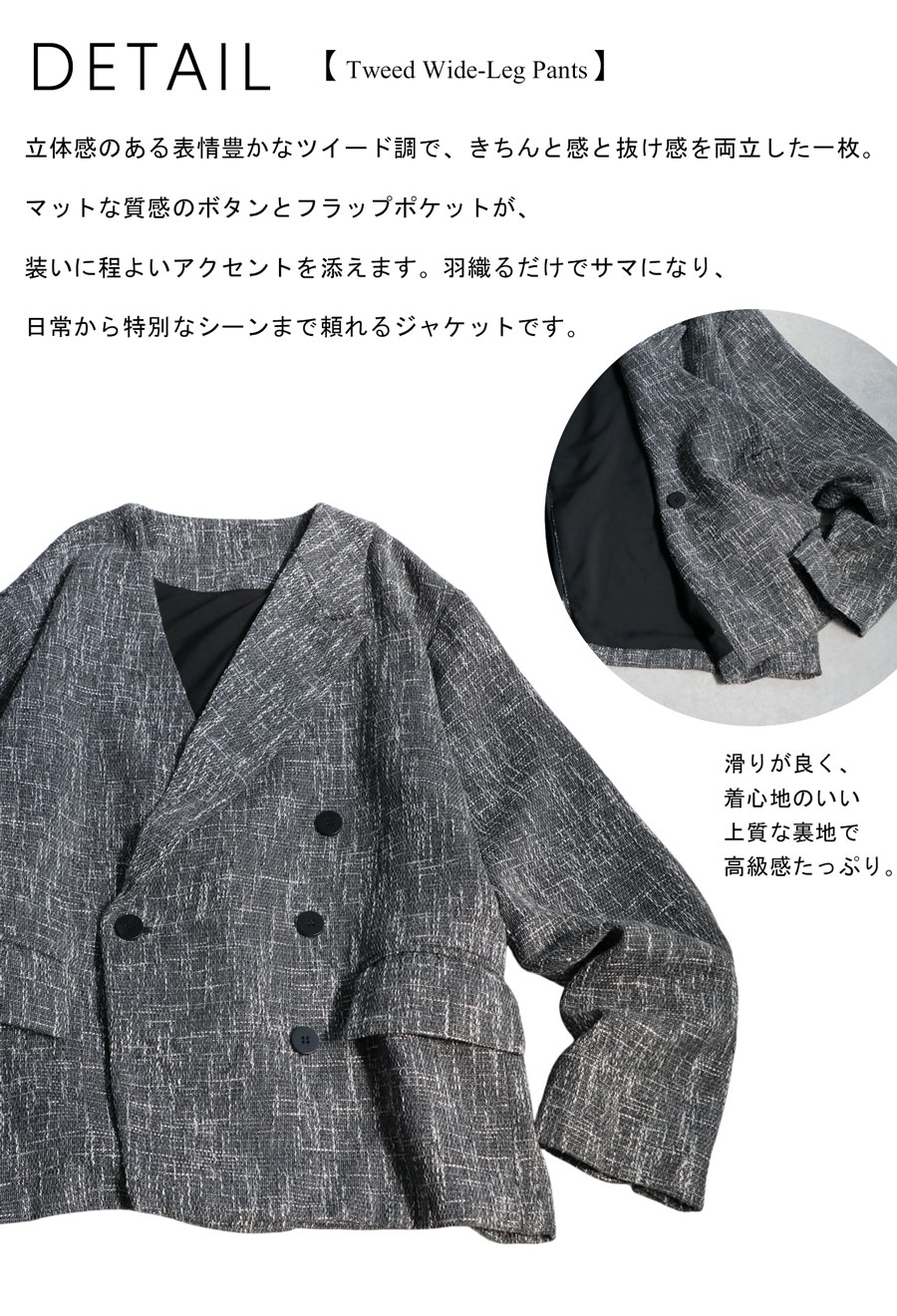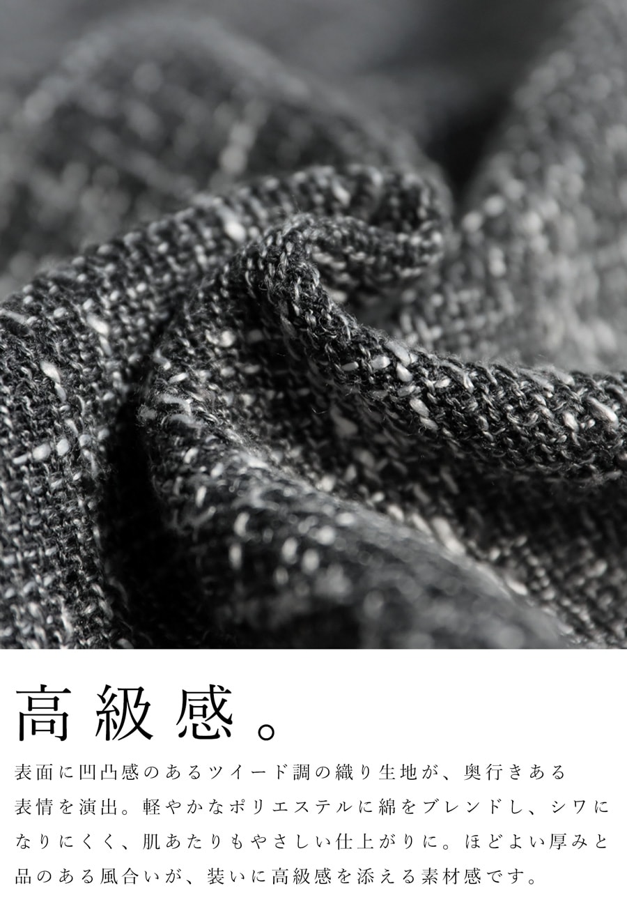 柄は織りの奥行きを感じるツイード調で、落ち着いた存在感を演出します。