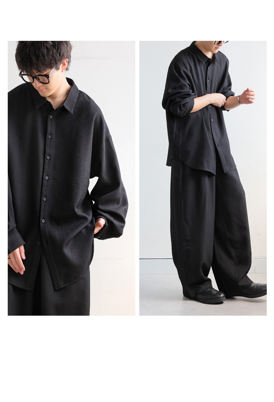 ネックラインは程よく詰まったレギュラーカラーで、1枚でも羽織りでも決まる汎用性の高いデザインです。