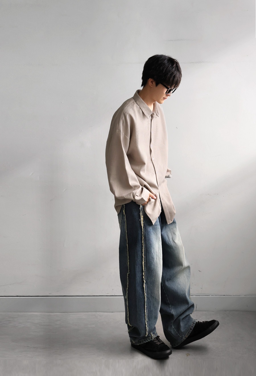 形状はゆったりとしたオーバーサイズで、肩はドロップショルダー仕様。リラックス感がありながらもスタイルを崩しません。