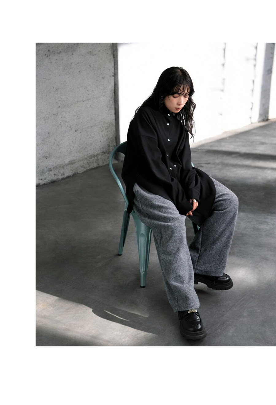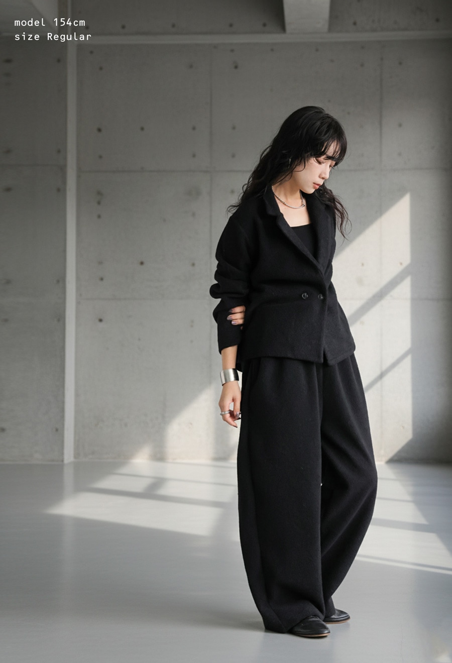 丈感は足首までしっかり届くロング丈で、広がりすぎない落ち感が上品さを演出します。