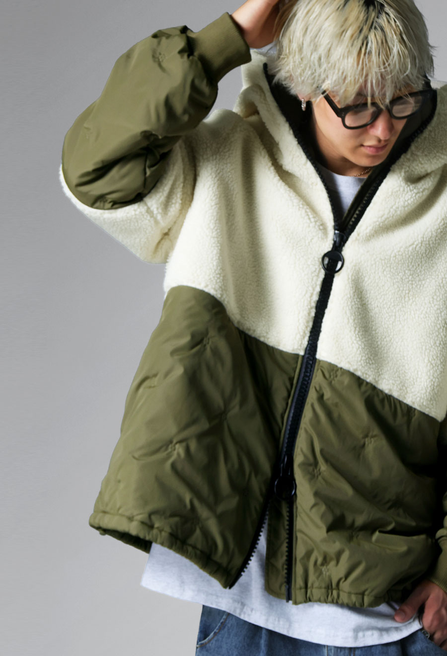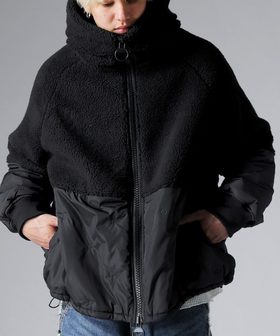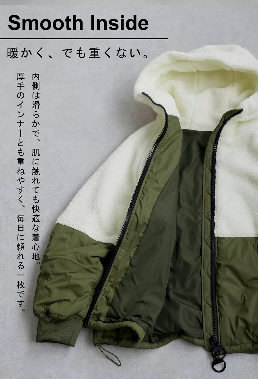 ネックラインまでしっかり覆うボア素材と、前開き仕様のジップアップで防寒性と着脱のしやすさを両立。