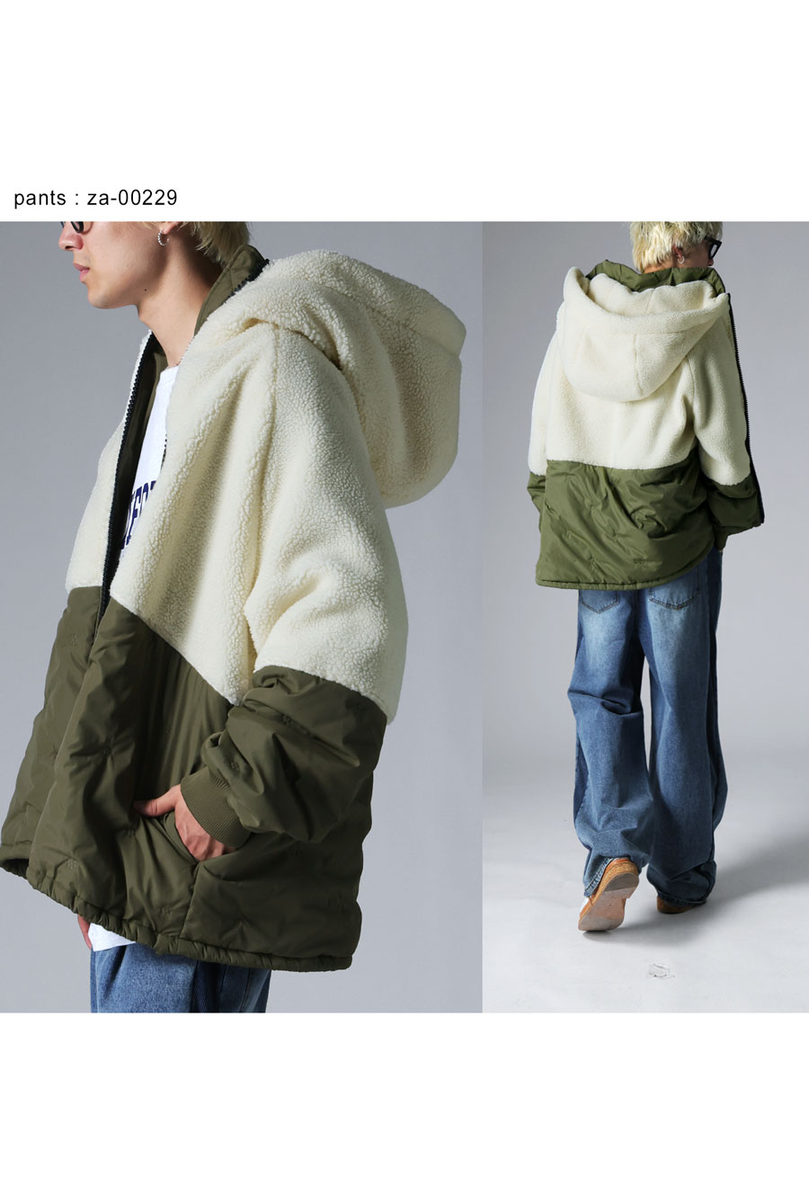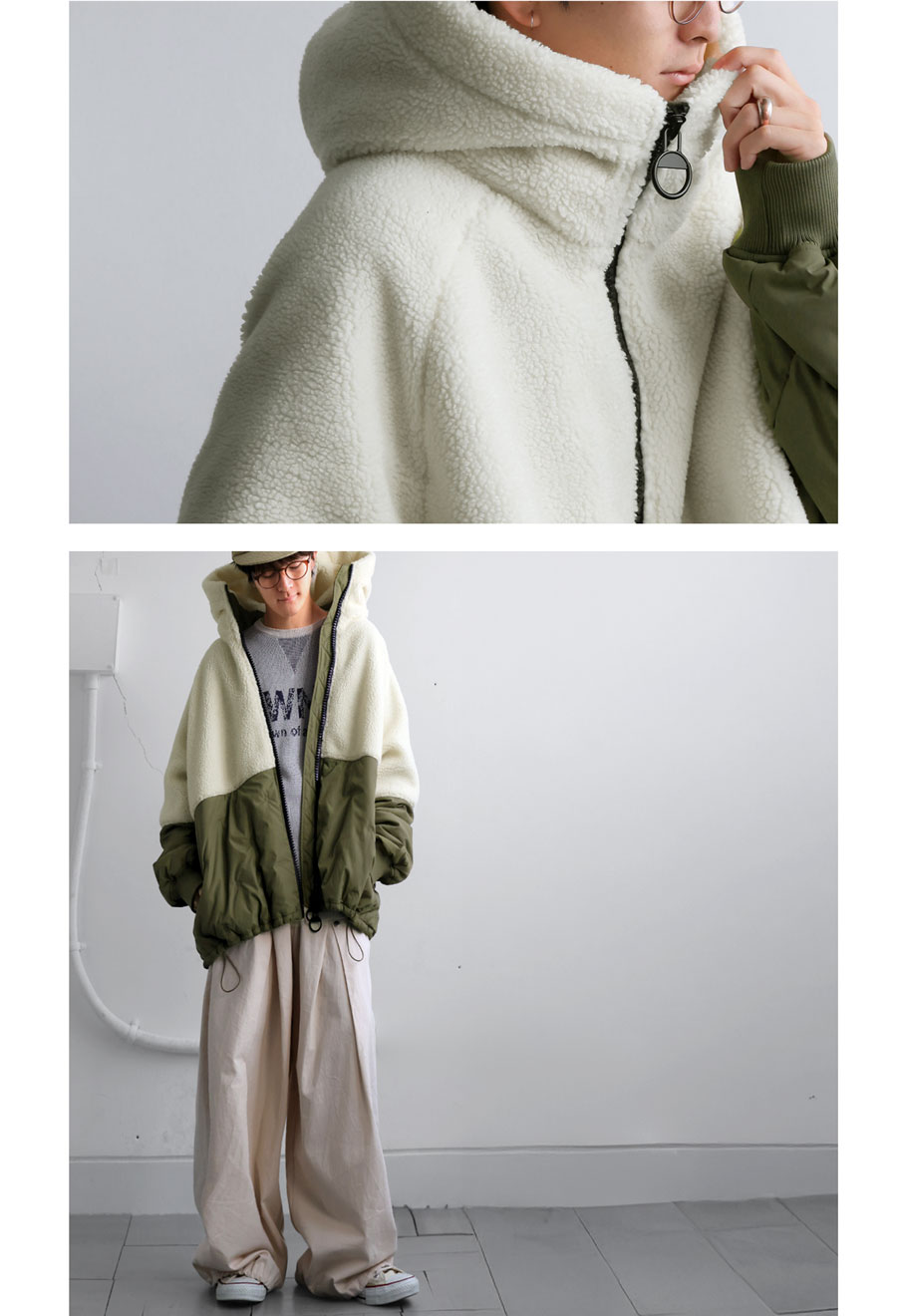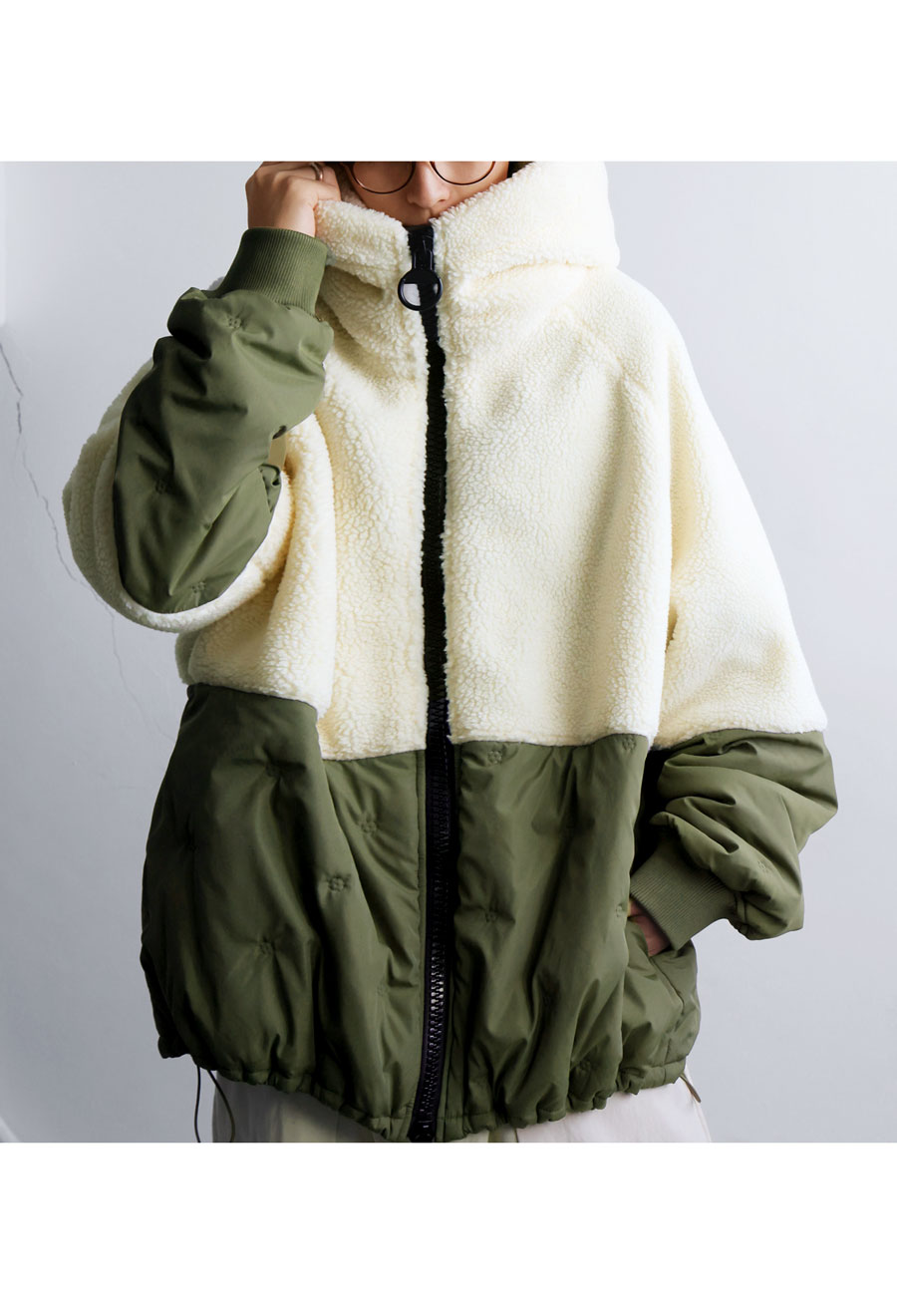 ネックラインまでしっかり覆うボア素材と、前開き仕様のジップアップで防寒性と着脱のしやすさを両立。