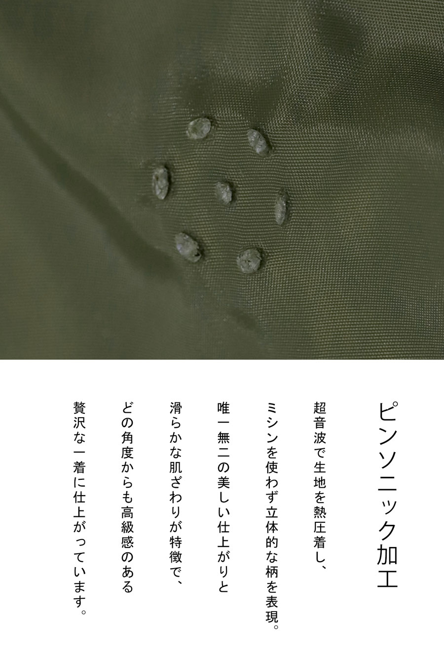 ピンソニック加工による立体感のある柄が異素材の表情を引き立て、高級感ある仕上がりに。