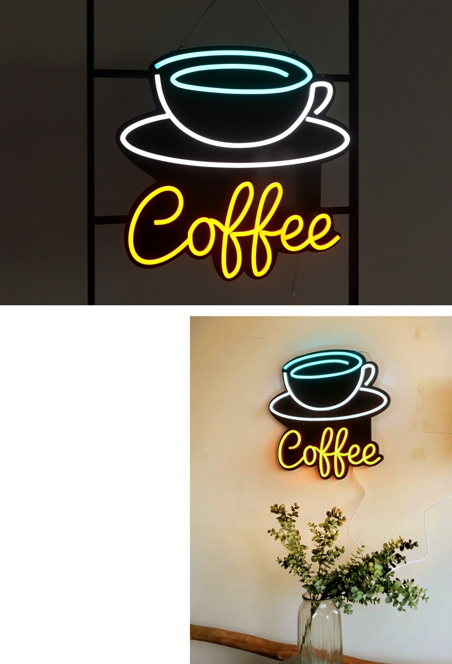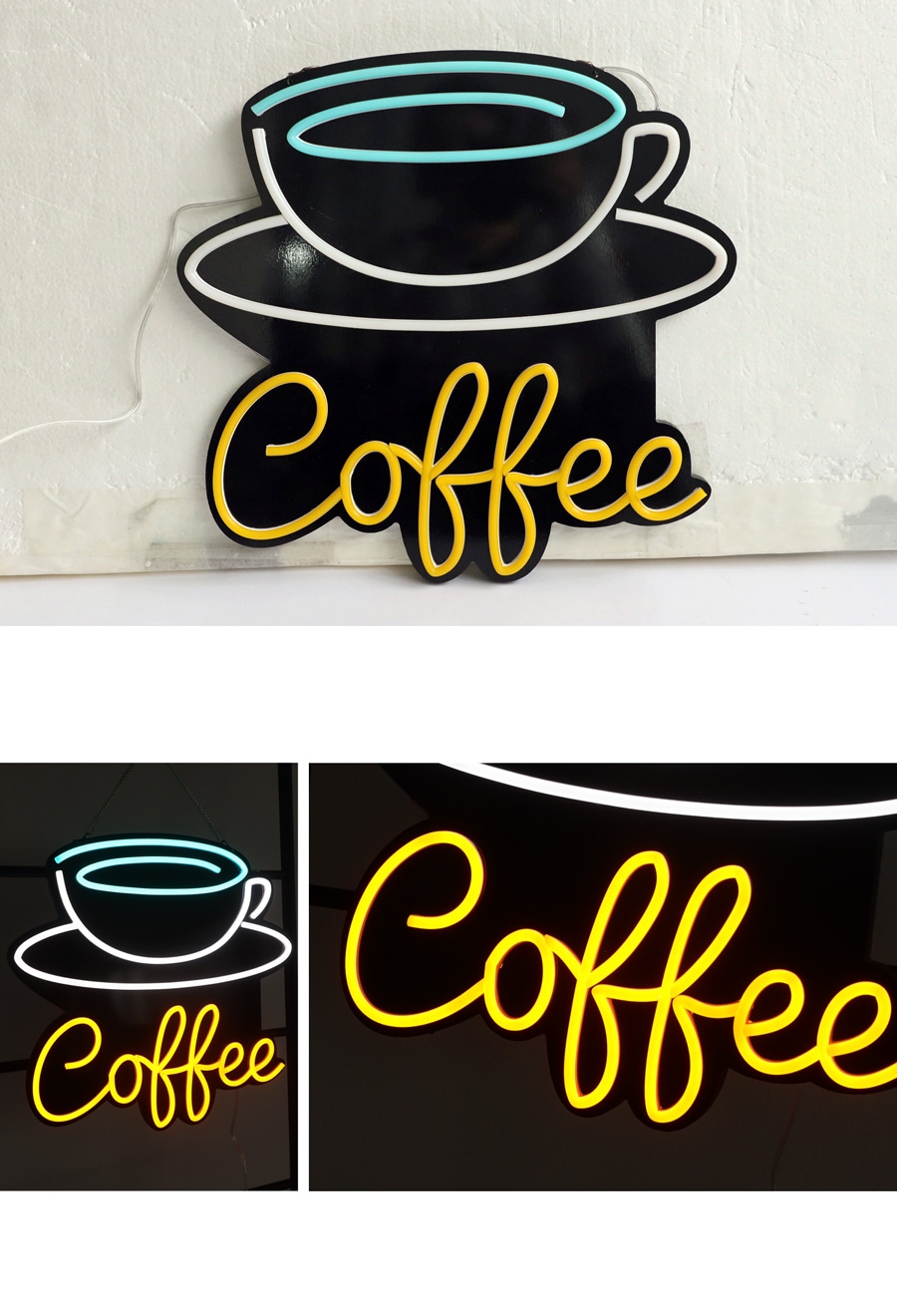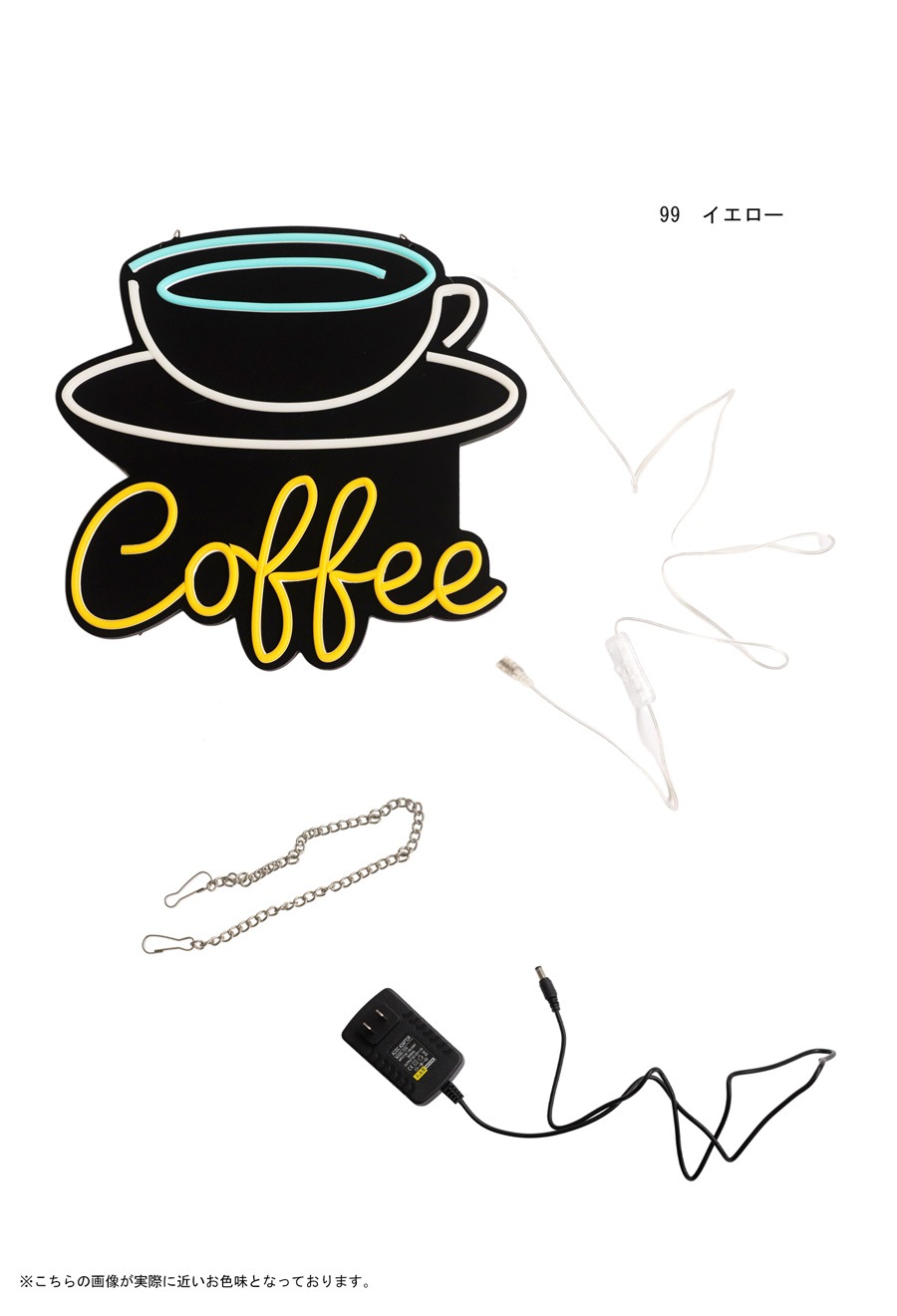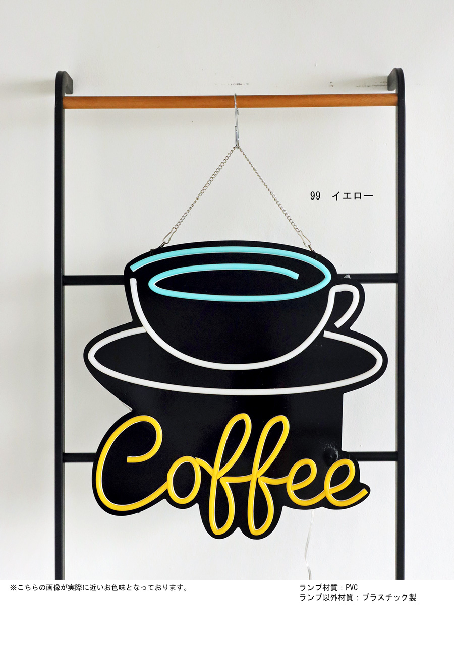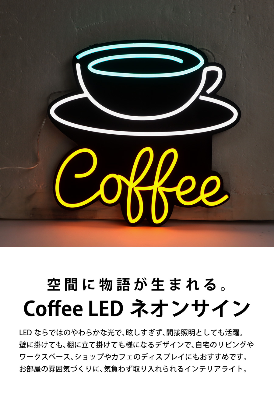 曲線が美しいネオン風ラインと、「Coffee」の筆記体ロゴが目を引くデザインで、壁に掛けるだけで印象的な空間を演出します。
