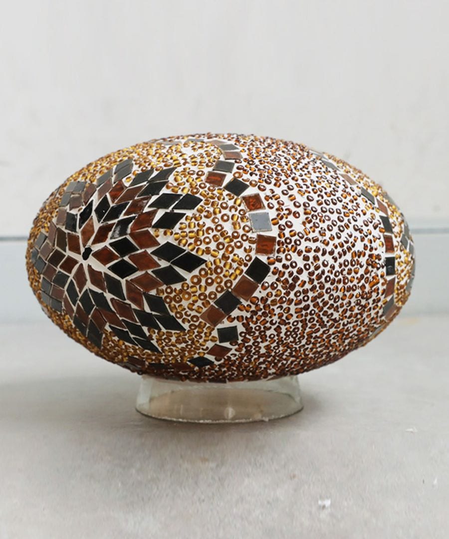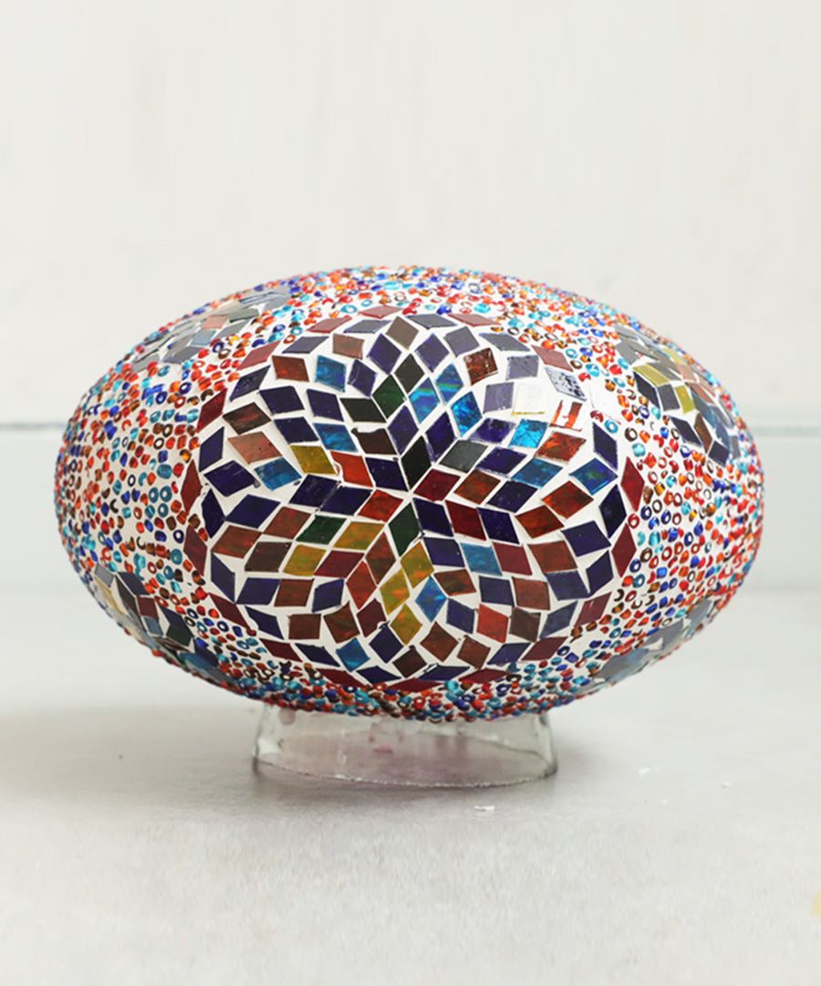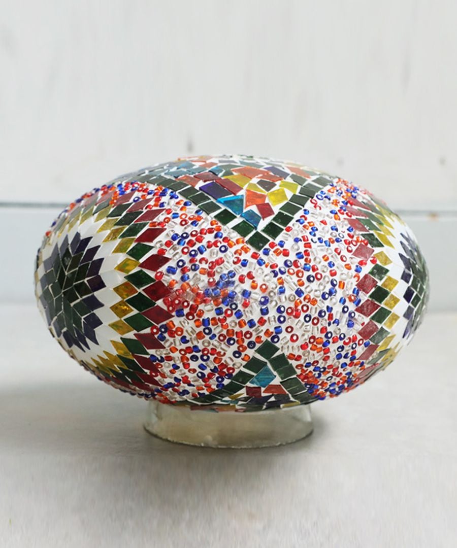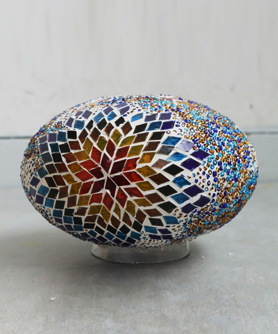 一粒一粒ガラス片とビーズを手作業で埋め込んだモザイク柄のランプシェードです。