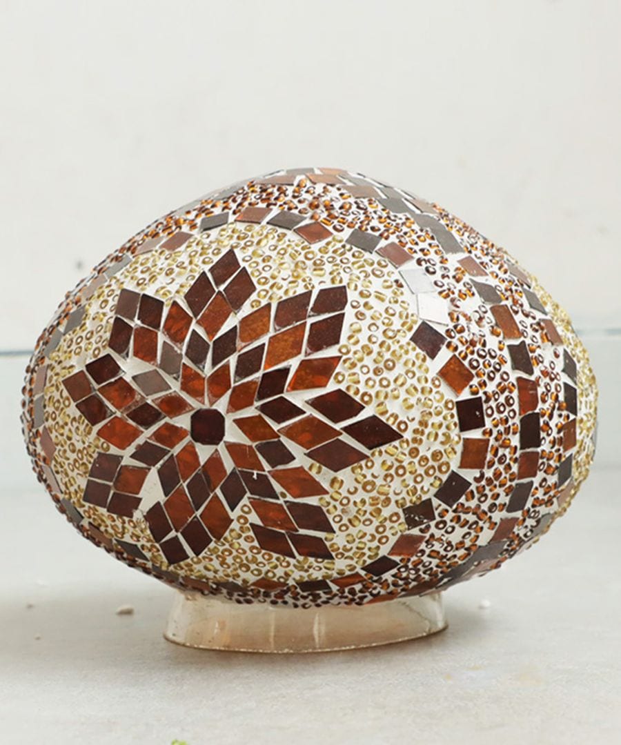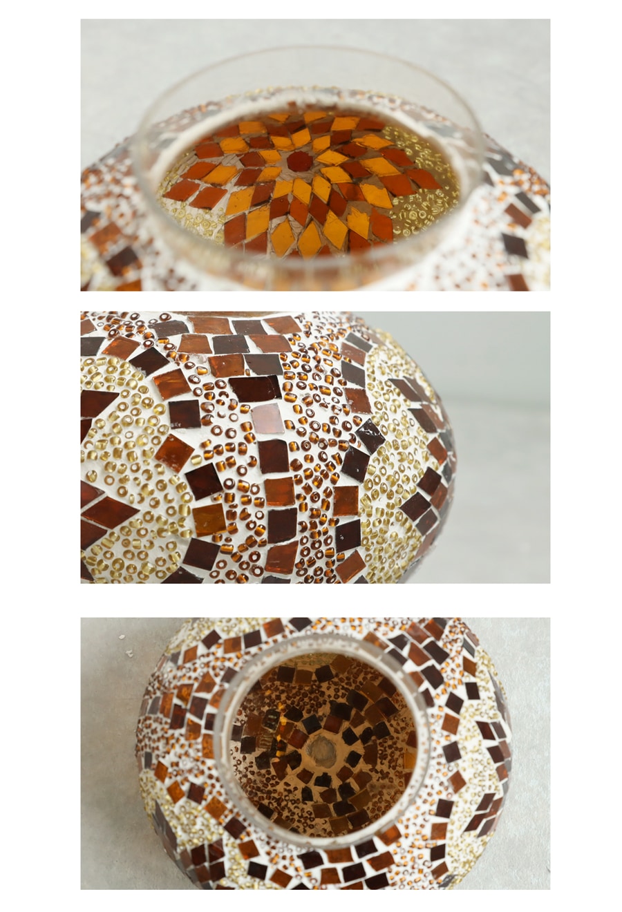 繊細なガラス片と小さなビーズが織りなすモザイク柄が光を反射し、幻想的な輝きを放ちます。