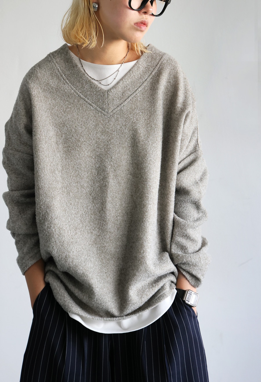 ネックラインは深すぎず、1枚ではもちろん、インナーとのレイヤードで抜け感も演出可能。