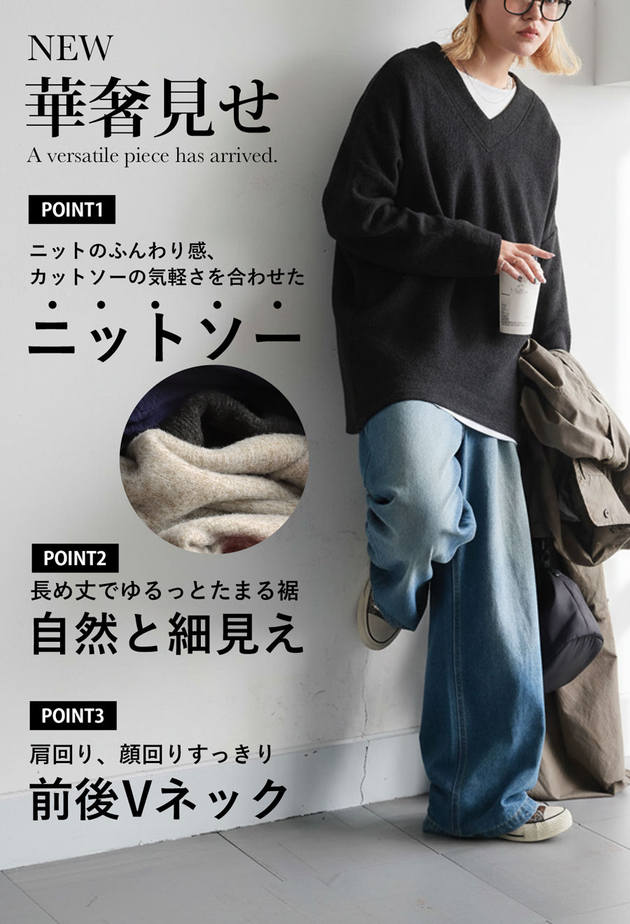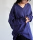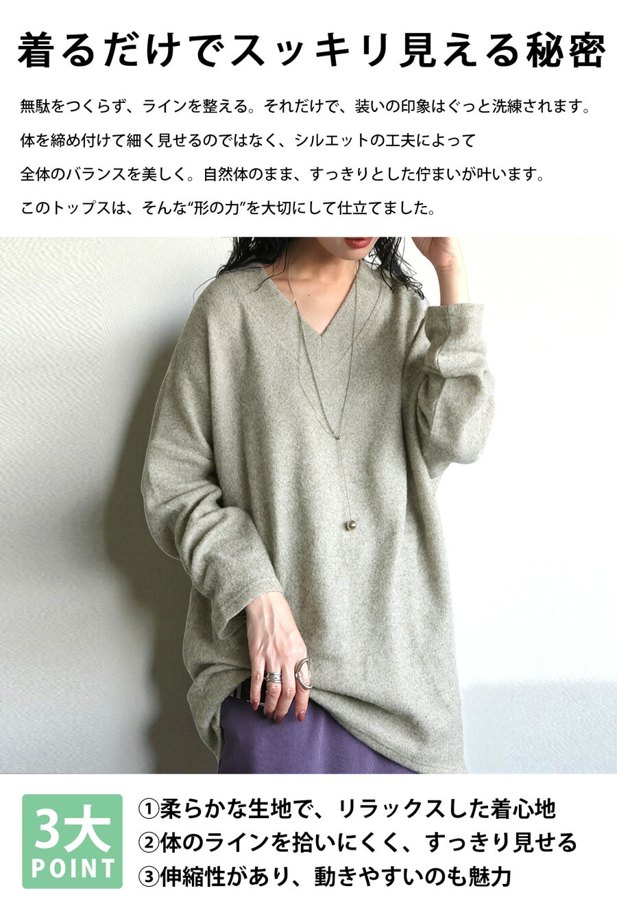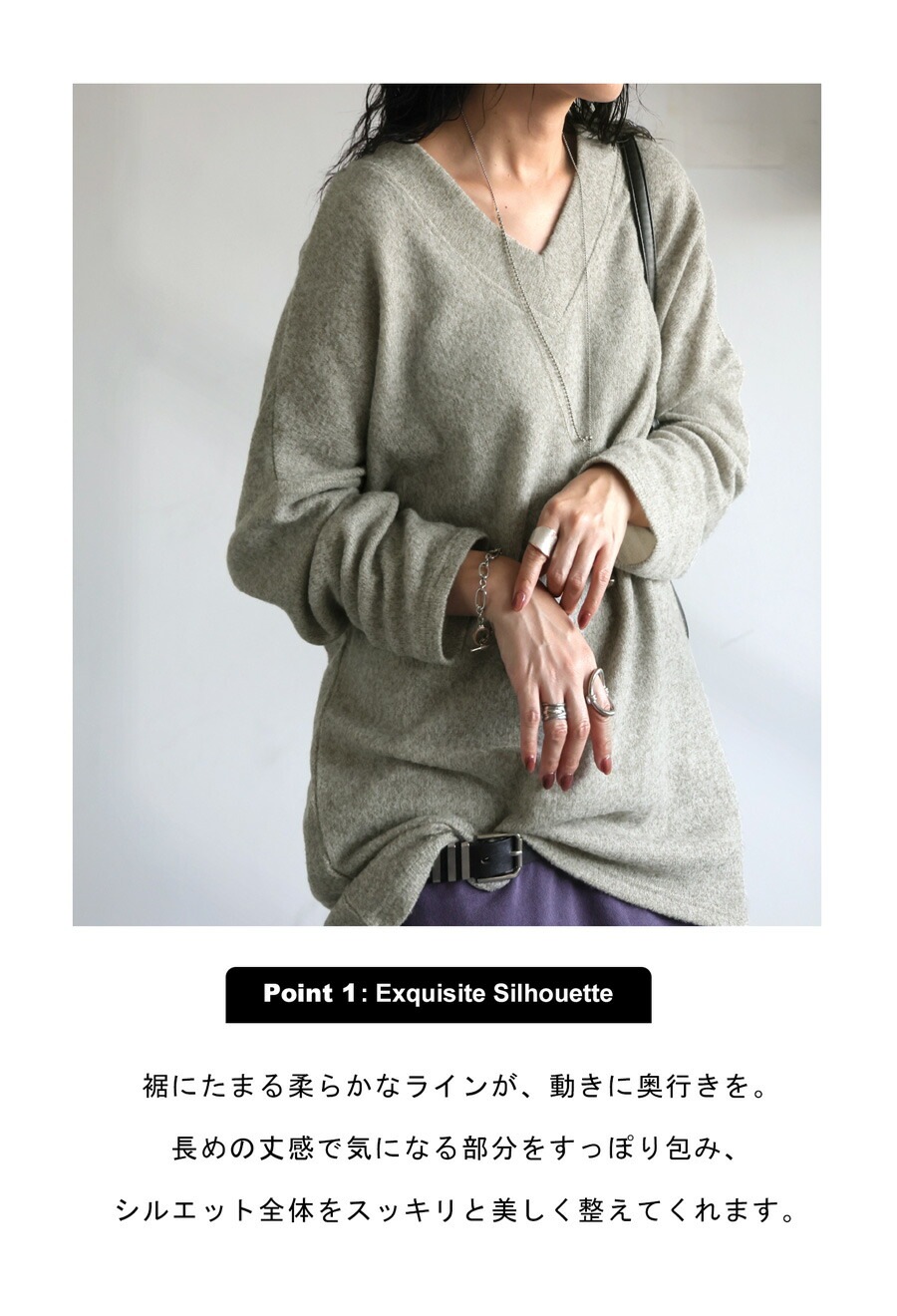 前後Vネックが顔まわりと背中をすっきり見せつつ、裾に向かって自然にたまるドレープ感が魅力です。