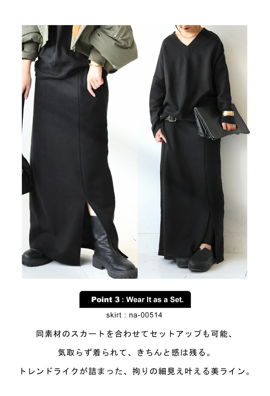 ニットが苦手な方にもおすすめで、同素材のスカートと合わせてセットアップスタイルも可能です。
