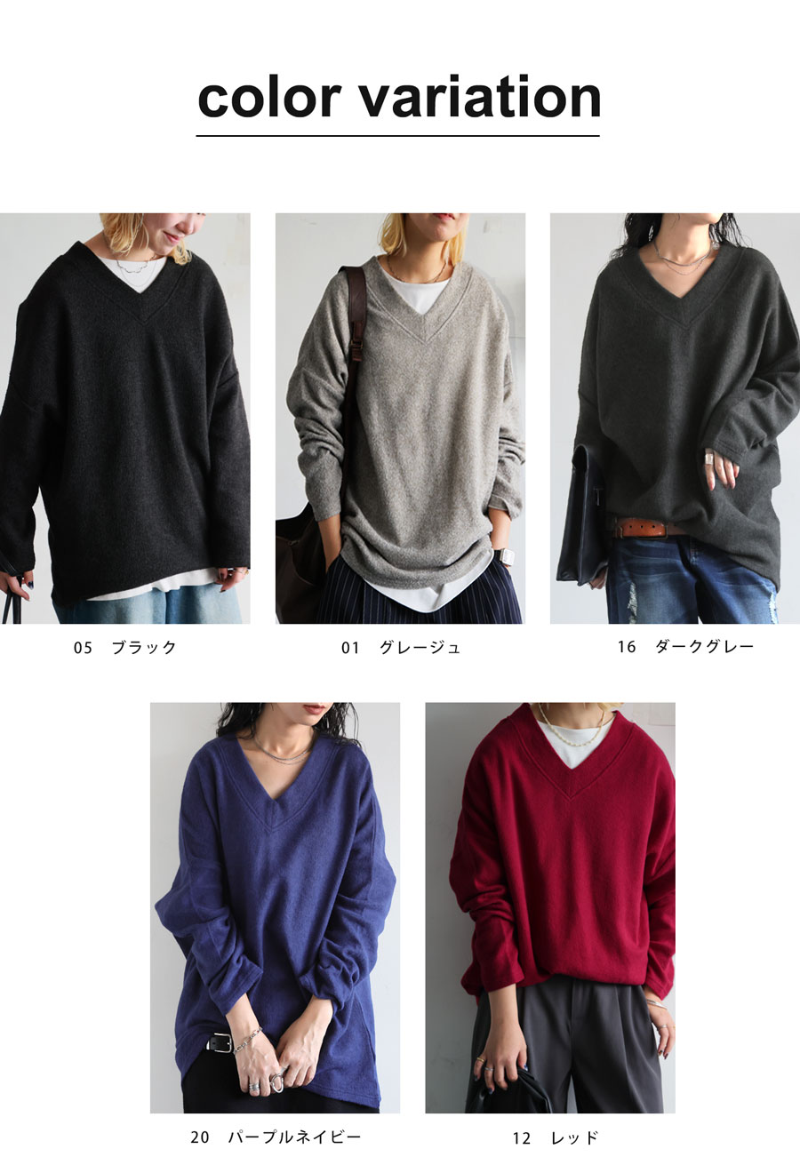 カラーはブラック(黒・くろ・Black)、グレージュ(灰茶・グレーベージュ・Greige)、ダークグレー(濃灰・Dark gray)、バープルネイビー(青紫・パープル・ネイビー)、レッド(赤・レッド・Red)の展開。